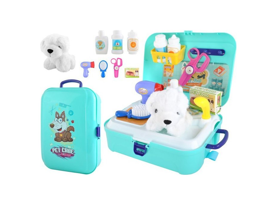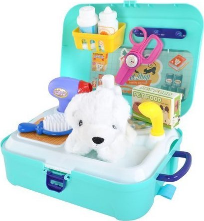 Psie kadernícka súprava v kufri je skvelou hračkou pre každého malého psieho nadšenca. Sada obsahuje príslušenstvo, ktoré vám umožní strihať nechty, česať, kúpať, sušiť a kŕmiť vášho maznáčika. Celá sada je uzavretá v malom praktickom batohu s priehradkou, kde si môžete usporiadať príslušenstvo po skončení hrania. Má nastaviteľné popruhy, pohodlnú rukoväť a sponu, ktorá zabráni vypadnutiu hračiek z kufra. Sada obsahuje všetko potrebné do psieho salónu ako sú: kefa, fén, psie maškrty, nožnice na pazúriky a lieky vo forme tabliet a sirupu.