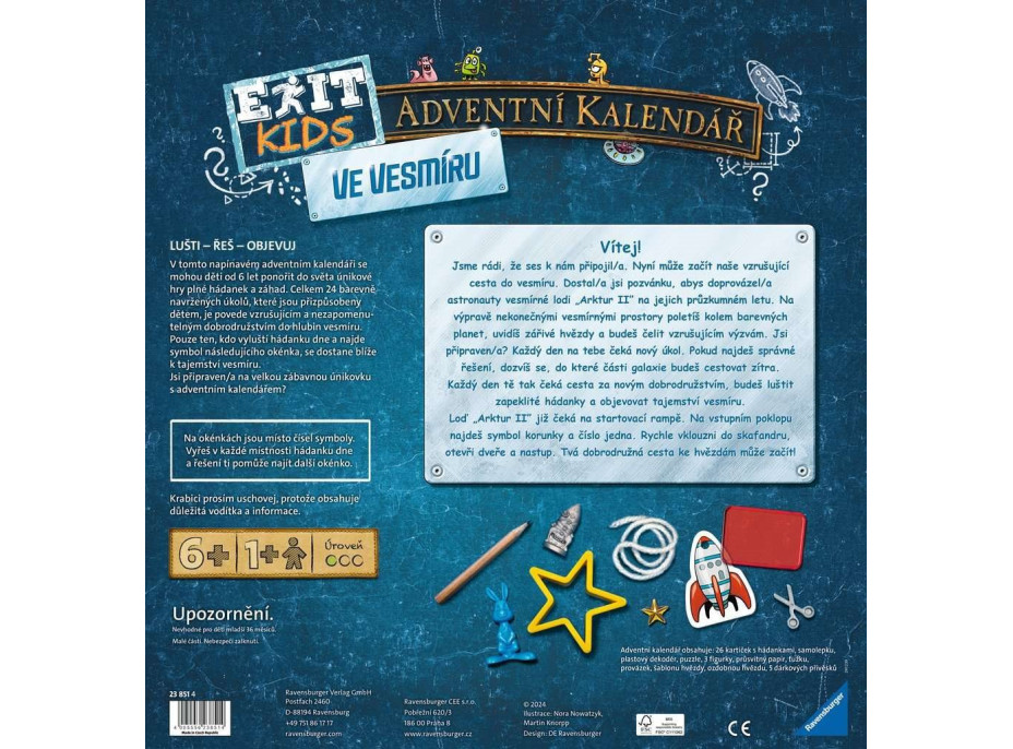 Dostal/a si pozvánku, aby si sprevádzal/a astronautov vesmírnej lode „Arktur II” na ich prieskumnom lete. Na výprave nekonečnými vesmírnymi priestormi poletíš okolo farebných planét, uvidíš žiarivé hviezdy a budeš čeliť vzrušujúcim výzvam. V ďalekých hlbinách vesmíru na teba čaká 24 tajomných miestností. Vyrieš ukryté hádanky, hlavolamy, skladačky a množstvo ďalších rozmanitých úloh a zisti tak, do ktorej časti galaxie budeš cestovať zajtra. Nebude to ale jednoduché. Teraz musíš zapojiť všetky svoje strategické zručnosti, predstavivosť a kreativitu. Na splnenie prieskumného letu do najneskorších hlbín vesmíru budeš musieť splniť najrôznejšie misie. Dokážeš nájsť všetkých schovaných mimozemšťanov vo vesmírnej lodi? Zistíš, ktorou trasou poletí raketa okolo Mesiaca? Zvládneš nájsť rozdiely medzi jednotlivými obrázkami? Vieš skladať puzzle? Toto a množstvo ďalšej zábavy na teba čaká v novom adventnom kalendári. Chceš sa uistiť, že si našiel správne okienko na nasledujúci deň? V miestnosti 1 je červený plastový dekodér. Umiestni dekodér na zašifrované okienko na kartičke s hádankou a uisti sa, že si našiel správny symbol okienka.