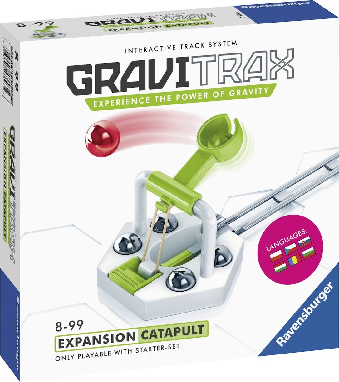 Prekonávajte prekážky! Vďaka katapultu preletí vaša gulička vzduchom napriek zemskej príťažlivosti. Zapojením katapultu do štartovacej sady získa dráha na napínavosti. Rozširujúci prvok GraviTrax Katapult je použiteľný iba so štartovacou sadou! Balenie obsahuje: návod, 1 aktívny diel katapult, 4 guličky, 10 náhradných gumových krúžkov. GraviTrax od nemeckého výrobcu Ravensburger je modulárna guličková dráha s možnosťou ďalších rozšírení, ktorá nadchne malých aj veľkých staviteľov. Stavajte, pretekajte s guličkami a vyskúšajte silu gravitácie v praxi! Prepracovaná stavebnica s variabilnými dielikmi Vám umožní vytvoriť si vlastný systém spletitých guličkových dráh alebo postaviť niektoré z predpripravených riešení. Z jednotlivých stavebných prvkov vytvoríte cestičky plné rôznych akcií, ktorými budú guličky postupne prechádzať. Systém guličkových dráh RAVENSBURGER GraviTrax môžete ľubovoľne rozširovať o ďalšie a ďalšie doplnky a vytvárať tak nové podoby zložitých a unikátnych cestičiek s vytunenými prekážkami. Stavebnica zaručuje nikdy nekončiacu zábavu okorenenú rozširovaním vedomostí o vlastnostiach gravitácie. Plánujte dráhy odkiaľkoľvek! S pomocou aplikácie GraviTrax môžete dráhy navrhovať aj na svojom mobile alebo tablete a potom všetko vyskúšať v praxi.Vlastnosti