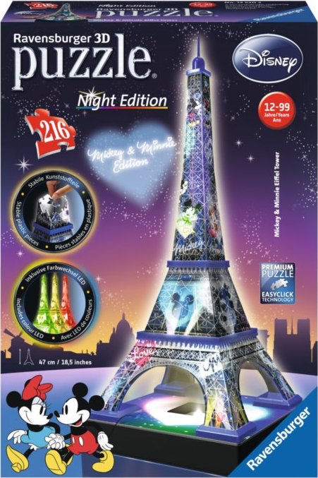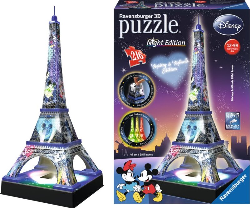 Eiffelova veža v špeciálnej Nočnej edícii s motívom Disney! Farebne svietiaca stavba od majstra vo výrobe puzzle RAVENSBURGER, ktorá sa vďaka LED svetlu v tme rozžiari, a navyše mení farby – to je niečo, čo Vás naozaj uchváti. Nočná Eiffelova veža je skvelým darčekom aj nevšedným kúskom v 3D rozmere. Špeciálne ohybné dieliky, ktoré vďaka technológii EASYCLICK presne zapadnú na svoje miesto, umožňujú postaviť fascinujúci model slávnej Eiffelovky teraz s potlačou Mickeyho a Minnie. Dieliky vyrobené z pevného plastu zaručia vynikajúcu stabilitu, a celá stavba drží bez nutnosti lepenia. Vďaka originálnym doplnkovým dielikom budú vašu stavbu všetci obdivovať. Balenie obsahuje puzzle, príslušenstvo vrátane LED a návod. Batérie 3x AAA nie sú súčasťou výrobku. Ilustračné video Rozmer zloženého puzzle cca 16,5 x 16,5 x 47 cmVlastnosti