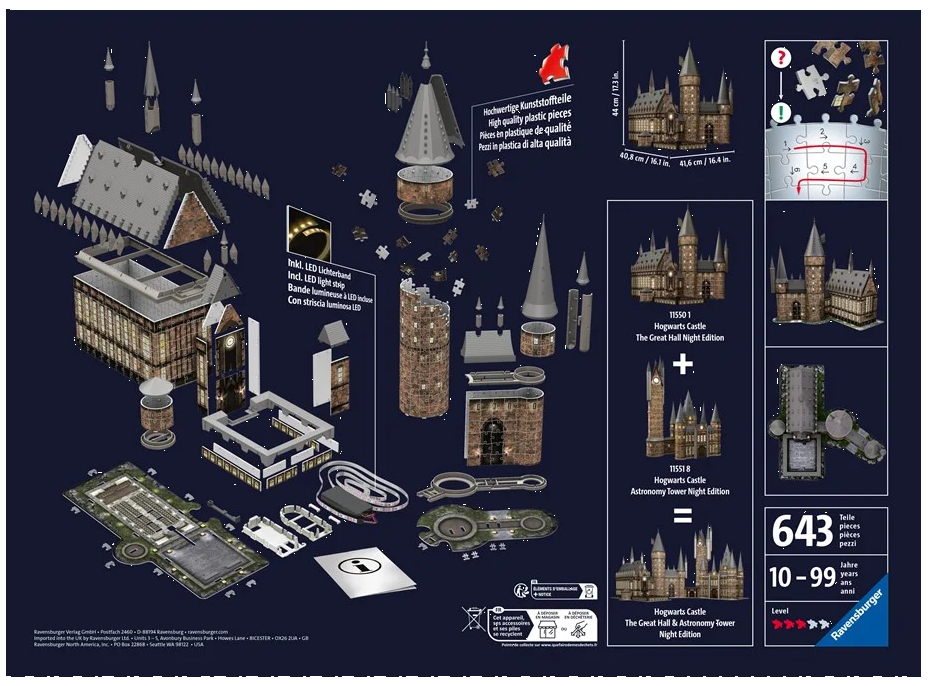 Nočná edícia Rokfortskej školy čiar a kúziel! Stavba z výroby nemeckej spoločnosti RAVENSBURGER sa vďaka LED svetlu v tme farebne rozžiari. Nočný hrad je skvelým darčekom aj nevšedným kúskom v 3D rozmere. Špeciálne ohybné dieliky, ktoré vďaka technológii EASYCLICK presne zapadnú na svoje miesto, umožňujú postaviť fascinujúci model. Dieliky vyrobené z pevného plastu zaručia vynikajúcu stabilitu a celá stavba drží bez nutnosti lepenia. Vďaka originálnym doplnkovým dielikom budú vašu stavbu všetci obdivovať. Balenie obsahuje: plastové puzzle dieliky, príslušenstvo, svetelný modul vr. svetelného pásu LED a návod. Batérie 3x AAA nie sú súčasťou výrobku.Vlastnosti