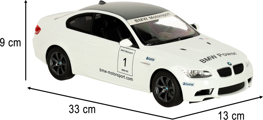 Diaľkovo ovládané auto je miniatúra ikonického BMW M3 v mierke 1:14, vyrobená z odolného, vysoko kvalitného plastu. Model sa vyznačuje detailmi, ako je logo BMW, svetlomety a charakteristický dizajn pôvodného vozidla, ktoré mu dodávajú realistický vzhľad. Auto aj ovládač, ktoré umožňujú plynulé a intuitívne ovládanie, sú napájané batériami AA (batérie nie sú súčasťou balenia). Táto hračka podporuje rozvoj koordinácie ruka-oko, obratnosti a manuálnych zručností. Vhodné pre deti od 6 rokov.