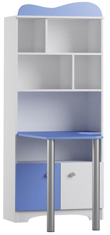 Praktický úložný regál CLOUDS so zabudovaným písacím stolom je vyrobený z kvalitných lamino dosiek o hrúbke 18 mm v bielej farbe kombinovanej s farebnými dvierkami a detailmi vo farbe podľa vášho výberu. Hrany nábytku sú zakončené ABS/PVC materiálom, ktorý ho chráni pred mechanickým poškodením a vlhkosťou. Regál obsahuje otvorené police kombinované s uzavretými skrinkami. Čelá dvierok sú osadené plastovými úchytmi v tvare mráčikov, charakteristickými pre celú kolekciu. Úchyty dodávajú nábytku jedinečný charakter a štýl. Regál je doplnený o praktický písací stôl. Orientáciu nábytku je možné zvoliť na pravú alebo ľavú stranu. Písací stôl má chrómované nohy s možnosťou regulácie výšky o 1,5 cm. Kombinujte nábytok z kolekcie CLOUDS presne na mieru veľkosti izby aj potrebám svojich detí.