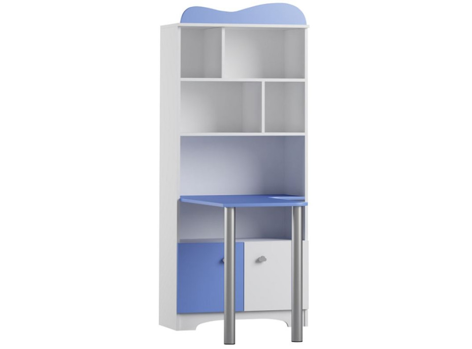Praktický úložný regál CLOUDS so zabudovaným písacím stolom je vyrobený z kvalitných lamino dosiek o hrúbke 18 mm v bielej farbe kombinovanej s farebnými dvierkami a detailmi vo farbe podľa vášho výberu. Hrany nábytku sú zakončené ABS/PVC materiálom, ktorý ho chráni pred mechanickým poškodením a vlhkosťou. Regál obsahuje otvorené police kombinované s uzavretými skrinkami. Čelá dvierok sú osadené plastovými úchytmi v tvare mráčikov, charakteristickými pre celú kolekciu. Úchyty dodávajú nábytku jedinečný charakter a štýl. Regál je doplnený o praktický písací stôl. Orientáciu nábytku je možné zvoliť na pravú alebo ľavú stranu. Písací stôl má chrómované nohy s možnosťou regulácie výšky o 1,5 cm. Kombinujte nábytok z kolekcie CLOUDS presne na mieru veľkosti izby aj potrebám svojich detí.