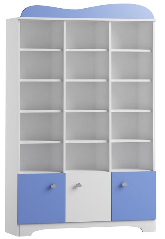 Praktický úložný regál CLOUDS, ktorý skvele poslúži ako knižnica, je vyrobený z kvalitných lamino dosiek s hrúbkou 18 mm v bielej farbe kombinovanej s farebnými dvierkami podľa vášho výberu. Hrany nábytku sú zakončené ABS/PVC materiálom, ktorý ho chráni pred mechanickým poškodením a vlhkosťou. Regál obsahuje otvorené police a tri uzavreté skrinky. Čelá dvierok sú osadené plastovými úchytmi v tvare mráčikov, charakteristickými pre celú kolekciu. Úchyty dodávajú nábytku jedinečný charakter a štýl. Vyberte si kombináciu nábytku kolekcie CLOUDS presne podľa predstáv vašich detí!