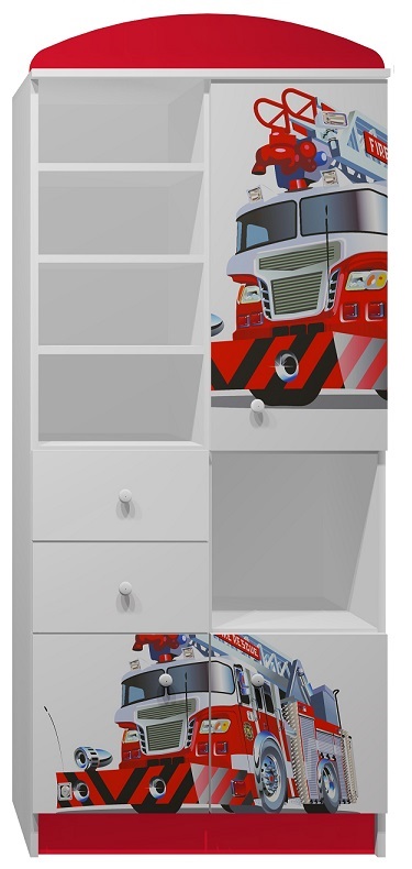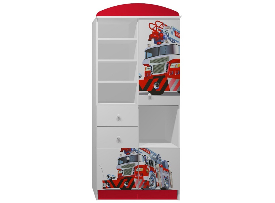 Tento široký regál s rôznorodým usporiadaním políc a skriniek bude zaujímavým spestrením vzhľadu akéhokoľvek izby. Celý regál je zvislo rozdelený. V spodnej časti sú dve skrinky s dvierkami nasledované dvojicou šuplíkov na ľavej strane a veľkú policu na pravej strane. Potom už je regál rozdelený na štyri police s tým rozdielom, že na ľavej strane sú police otvorené a na pravej sú prekryté dvierkami.