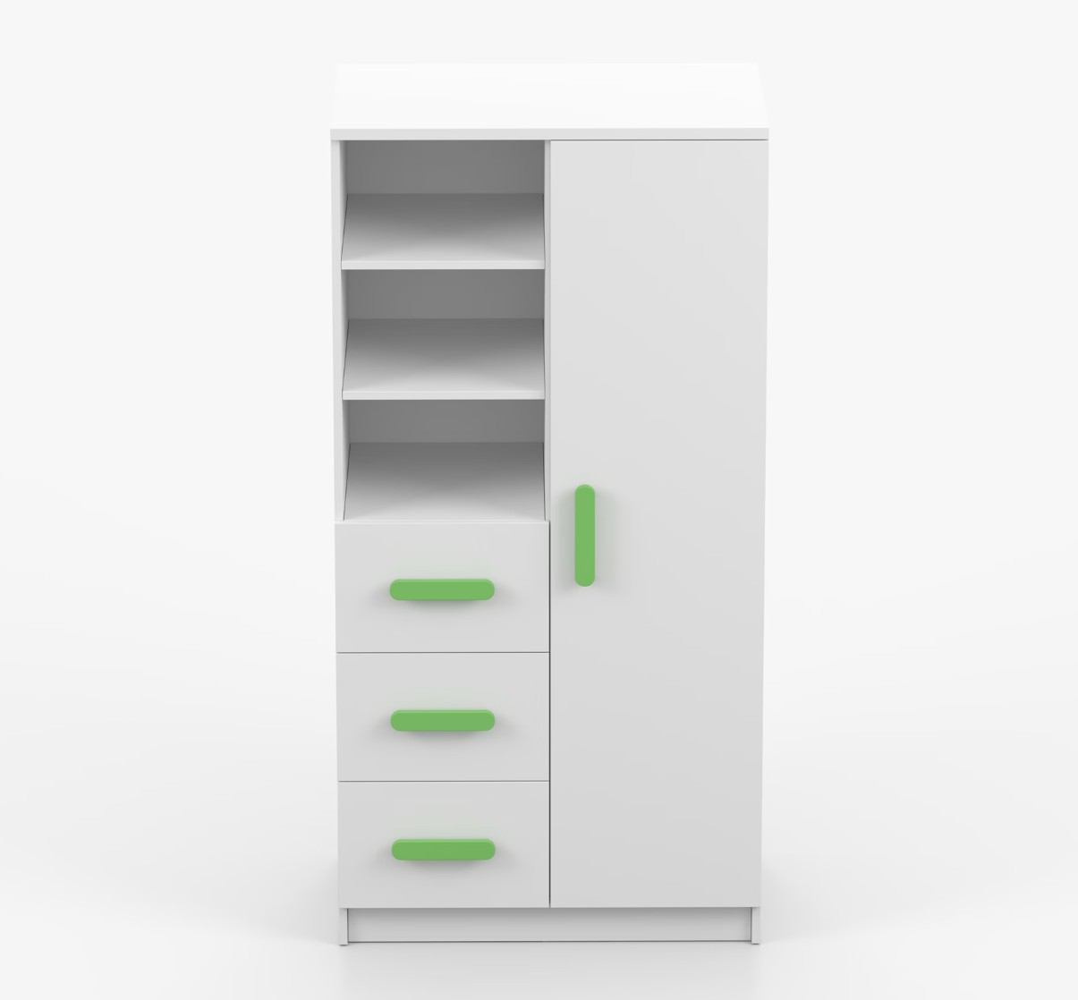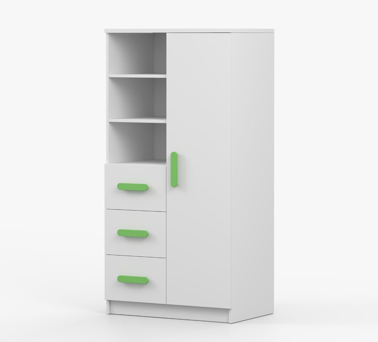 Regál SCOUT ponúka praktické a všestranné úložné riešenie pre každú domácnosť. Je zložený z dvoch políc, troch priestranných zásuviek a bočnej skrinky s vnútornými policami, čo umožňuje dostatok priestoru na uloženie kníh, oblečenia a ďalších vecí. Regál je vyrobený z kvalitnej laminovanej dosky s hrúbkou 16 mm s odolnou ABS lištou, chrániacou hrany regálu pred mechanickým poškodením. Farebné úchytky z PVC dodávajú tomuto praktickému kusu nábytku zaujímavý dizajnový prvok.