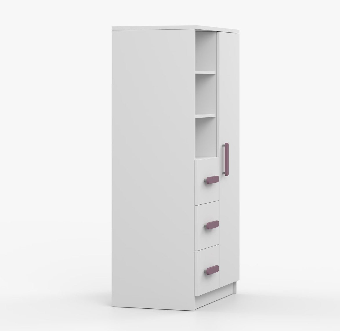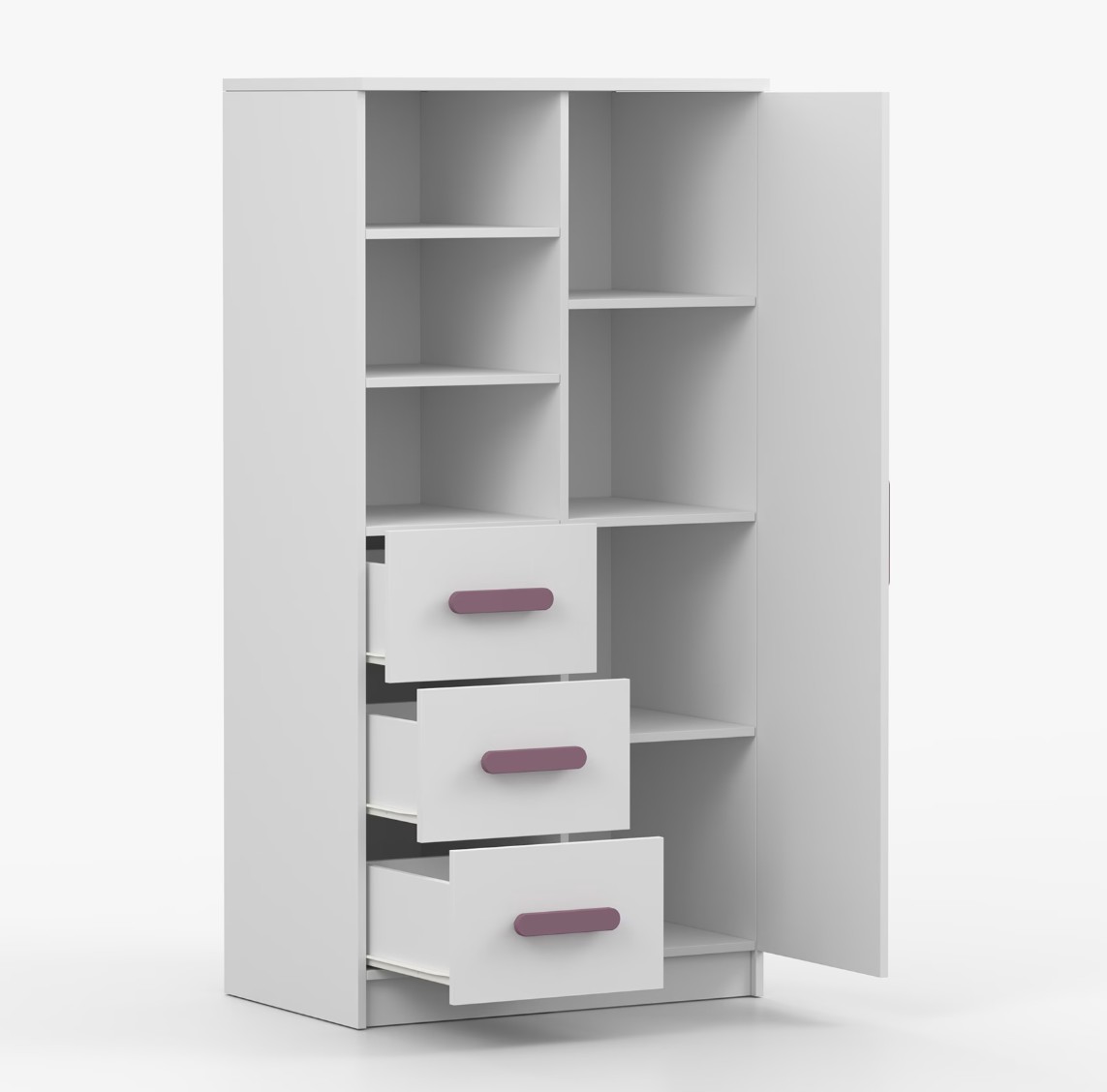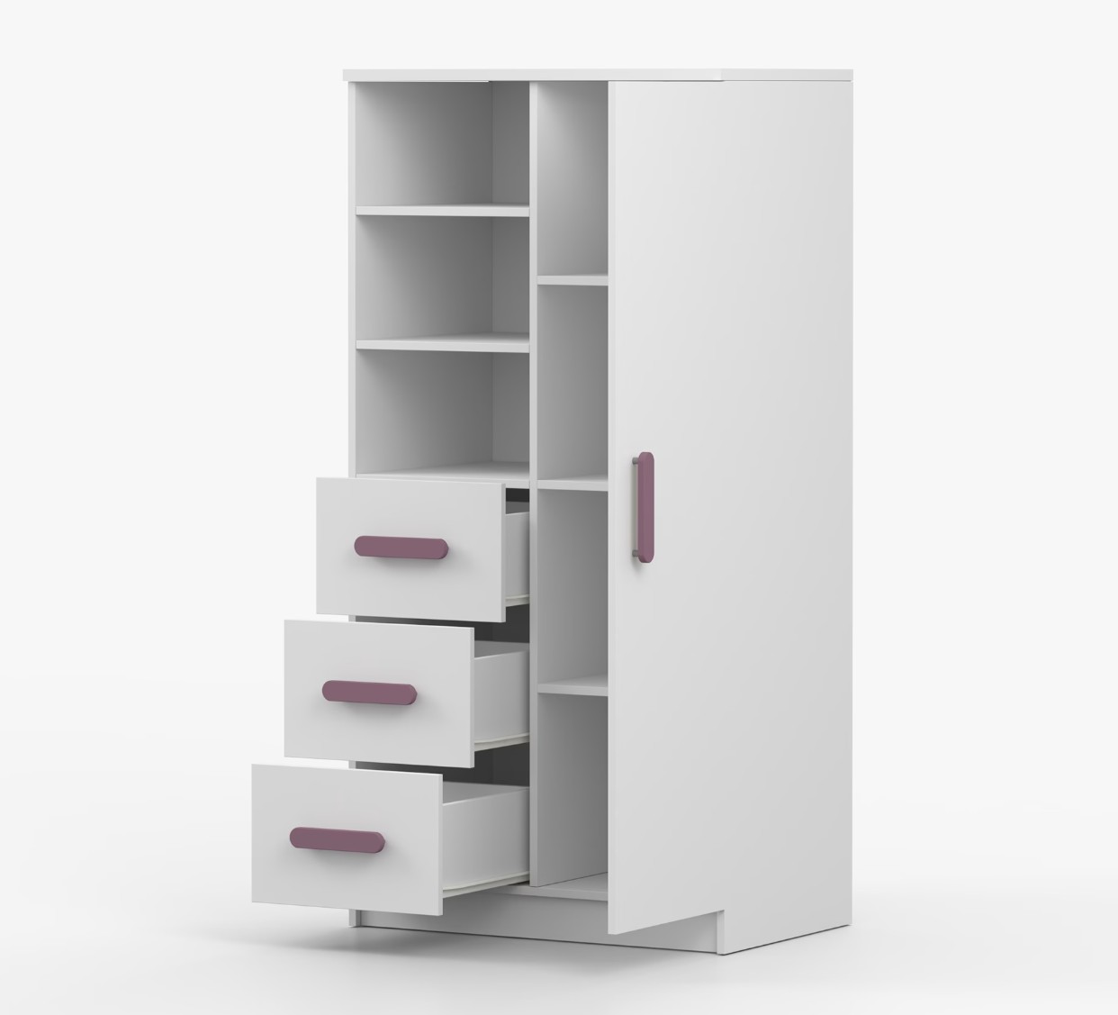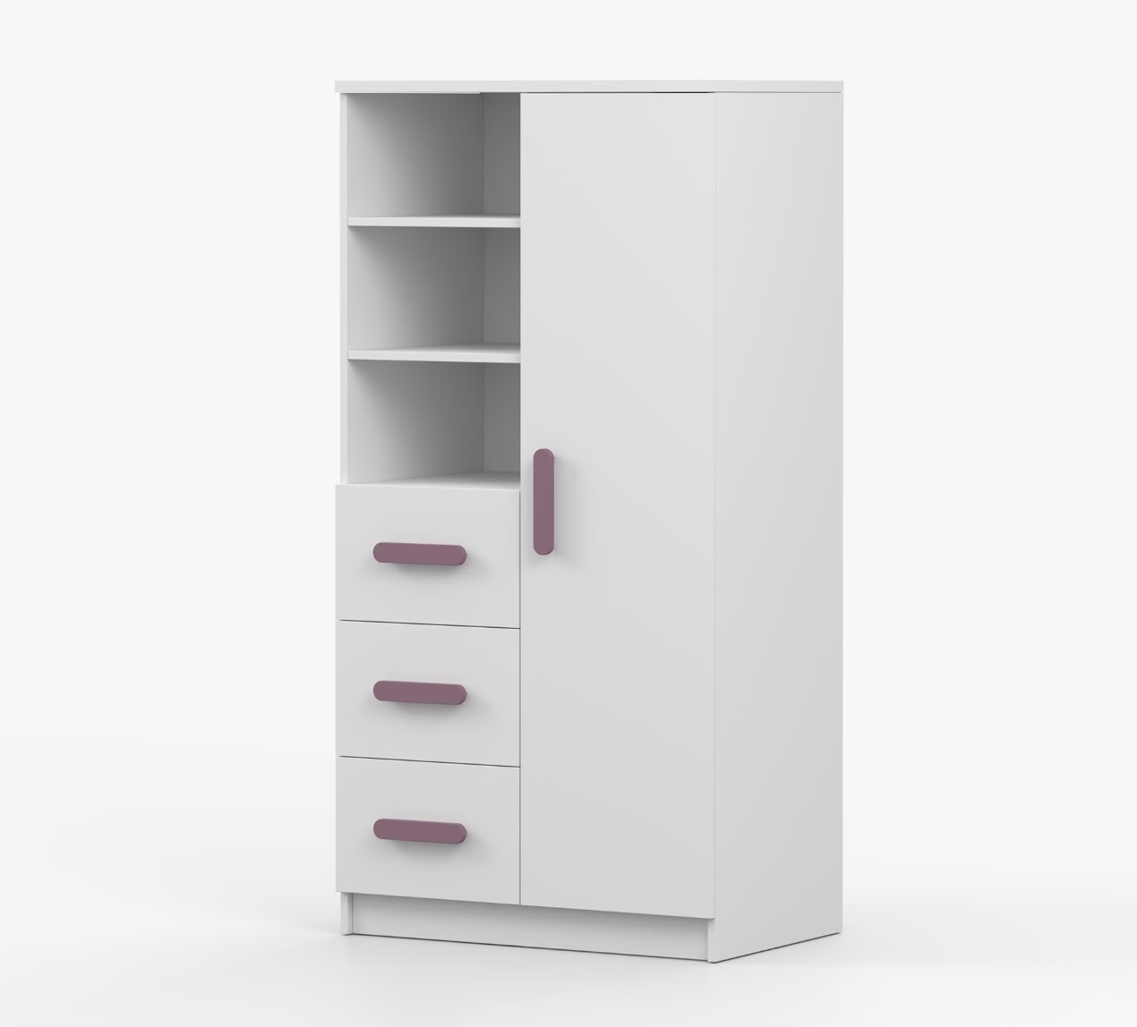 Regál SCOUT ponúka praktické a všestranné úložné riešenie pre každú domácnosť. Je zložený z dvoch políc, troch priestranných zásuviek a bočnej skrinky s vnútornými policami, čo umožňuje dostatok priestoru na uloženie kníh, oblečenia a ďalších vecí. Regál je vyrobený z kvalitnej laminovanej dosky s hrúbkou 16 mm s odolnou ABS lištou, chrániacou hrany regálu pred mechanickým poškodením. Farebné úchytky z PVC dodávajú tomuto praktickému kusu nábytku zaujímavý dizajnový prvok.