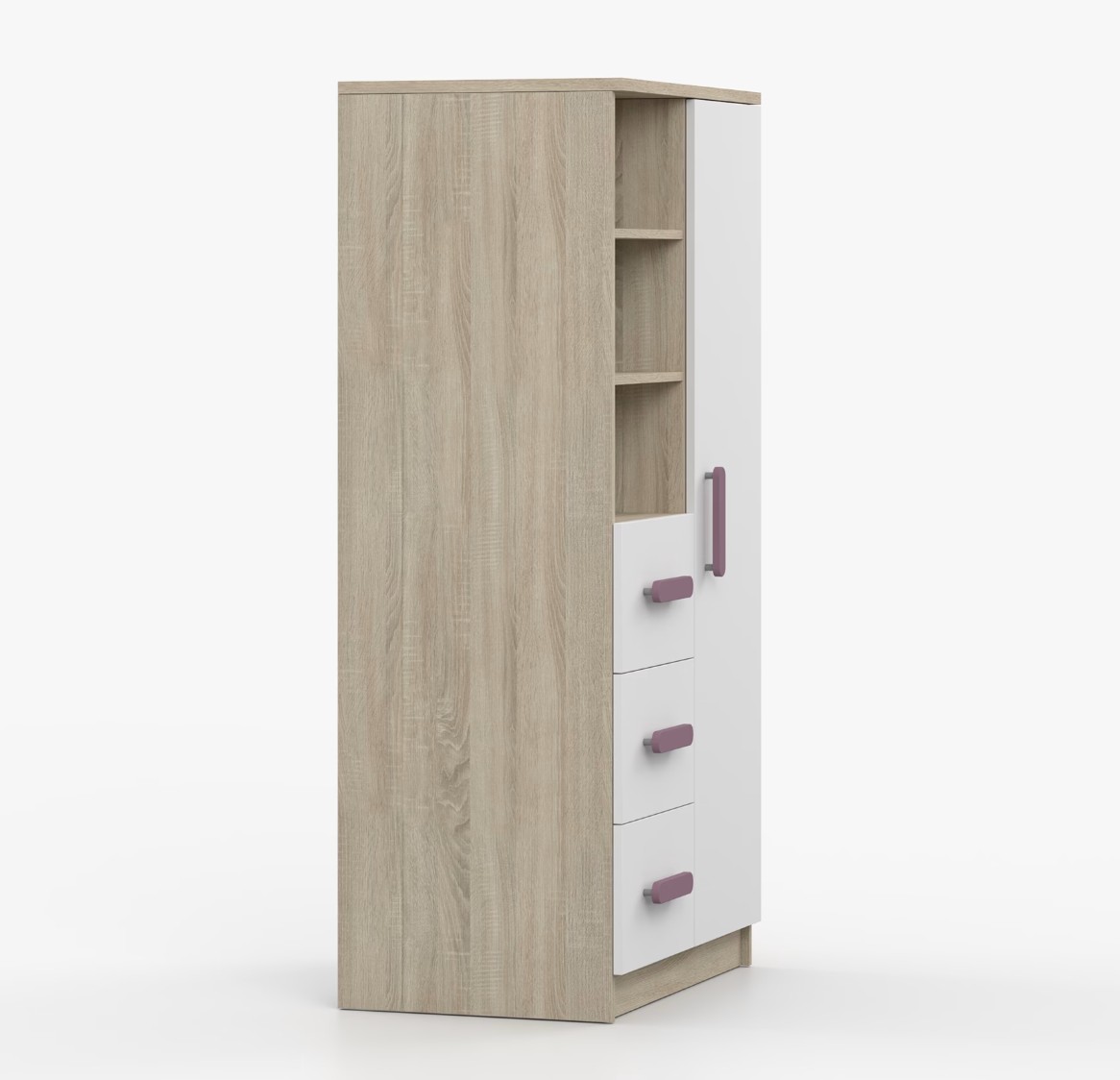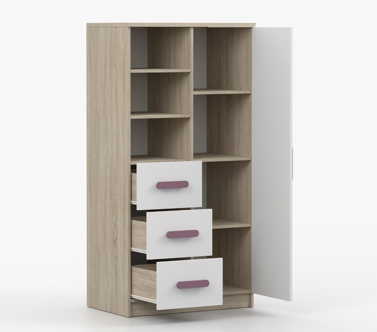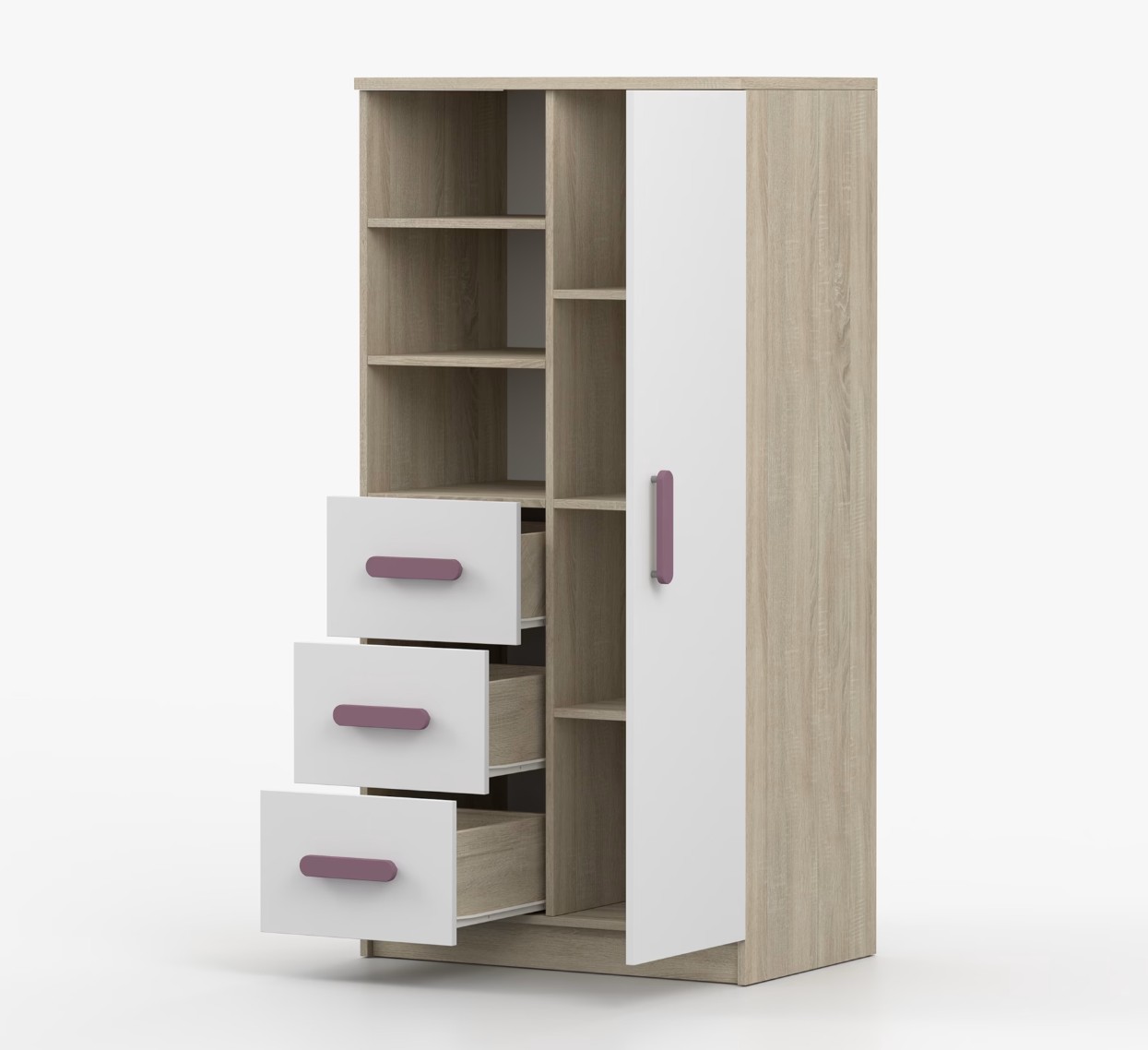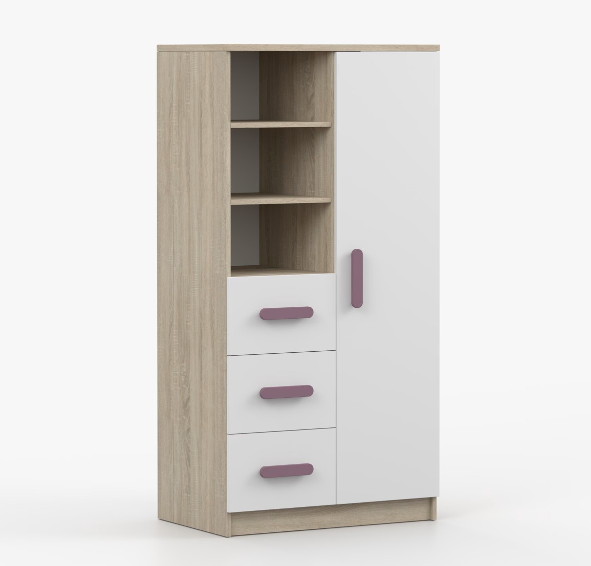 Regál SCOUT ponúka praktické a všestranné úložné riešenie pre každú domácnosť. Je zložený z dvoch políc, troch priestranných zásuviek a bočnej skrinky s vnútornými policami, čo umožňuje dostatok priestoru na uloženie kníh, oblečenia a ďalších vecí. Regál je vyrobený z kvalitnej laminovanej dosky s hrúbkou 16 mm s odolnou ABS lištou, chrániacou hrany regálu pred mechanickým poškodením. Farebné úchytky z PVC dodávajú tomuto praktickému kusu nábytku zaujímavý dizajnový prvok.