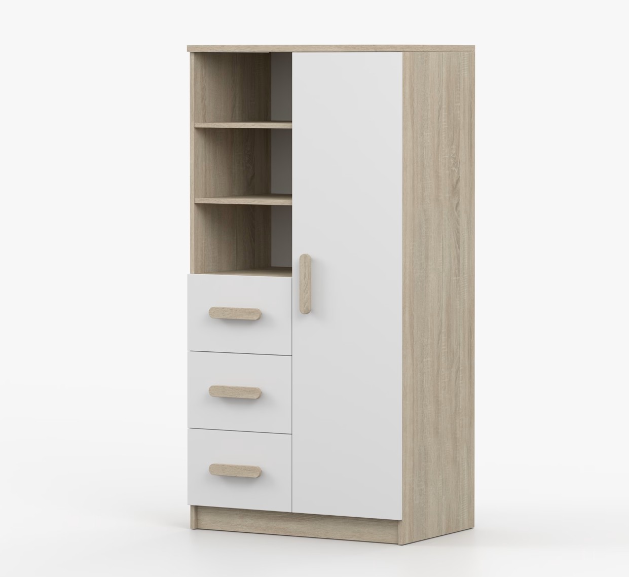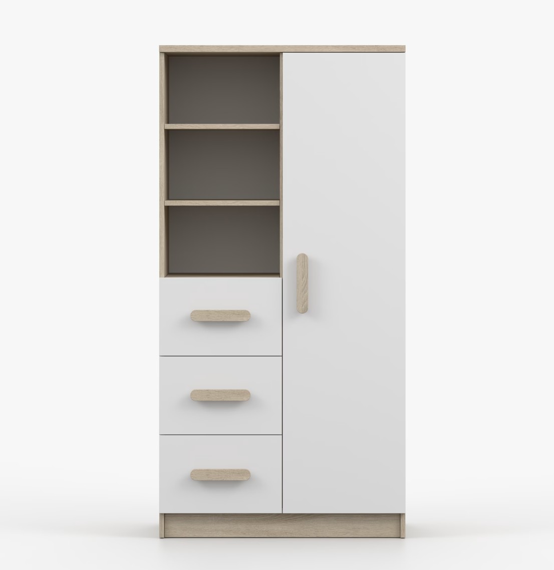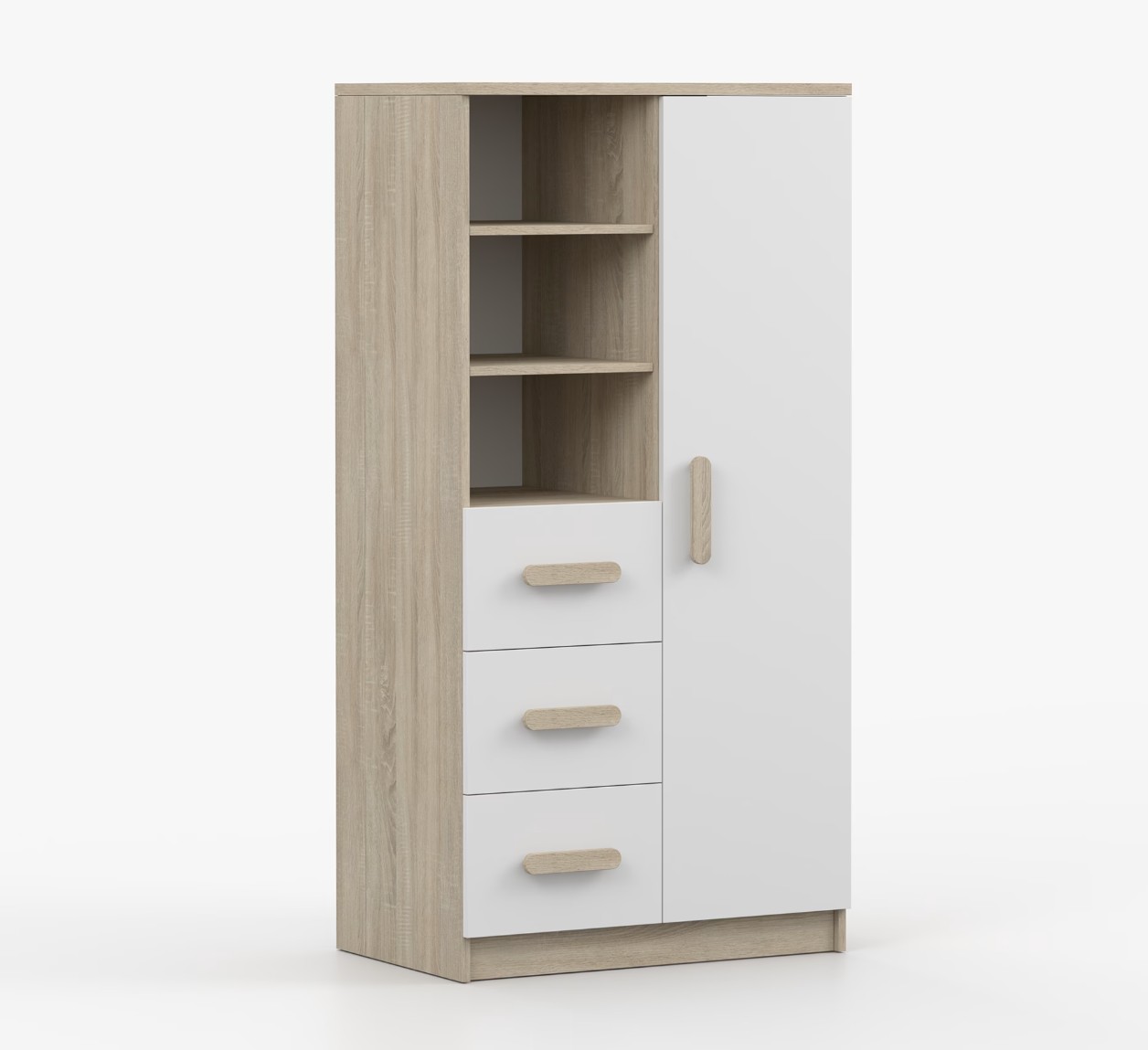 Regál SCOUT ponúka praktické a všestranné úložné riešenie pre každú domácnosť. Je zložený z dvoch políc, troch priestranných zásuviek a bočnej skrinky s vnútornými policami, čo umožňuje dostatok priestoru na uloženie kníh, oblečenia a ďalších vecí. Regál je vyrobený z kvalitnej laminovanej dosky s hrúbkou 16 mm s odolnou ABS lištou, chrániacou hrany regálu pred mechanickým poškodením. Farebné úchytky z PVC dodávajú tomuto praktickému kusu nábytku zaujímavý dizajnový prvok.