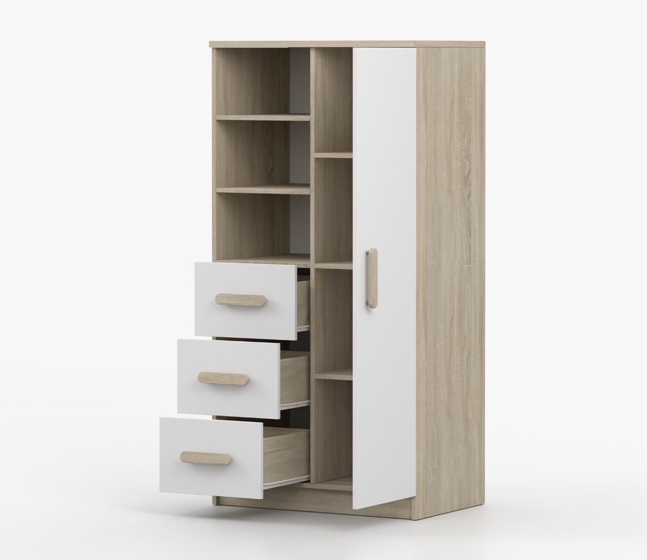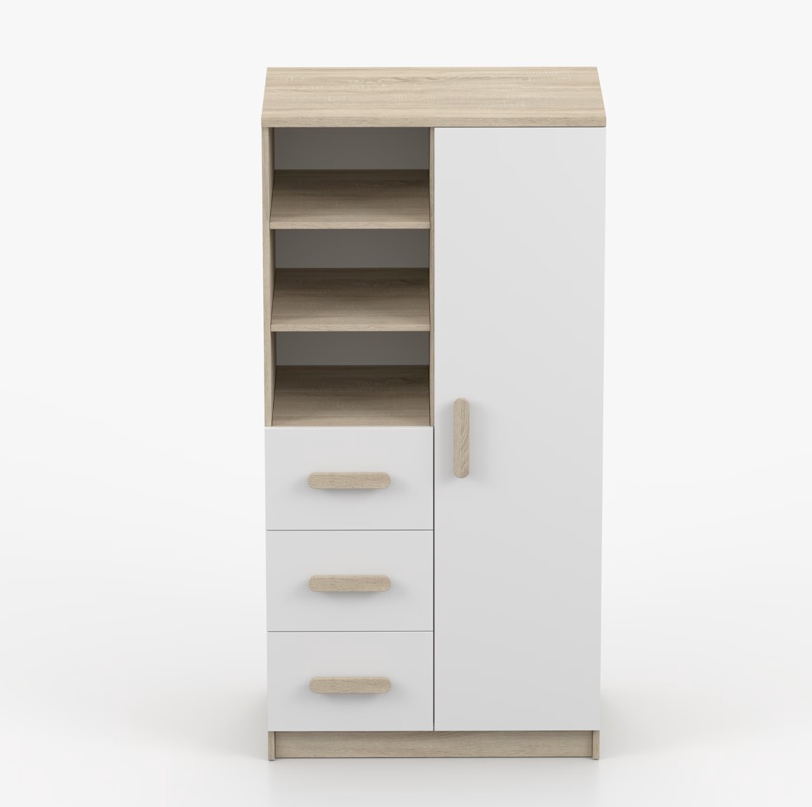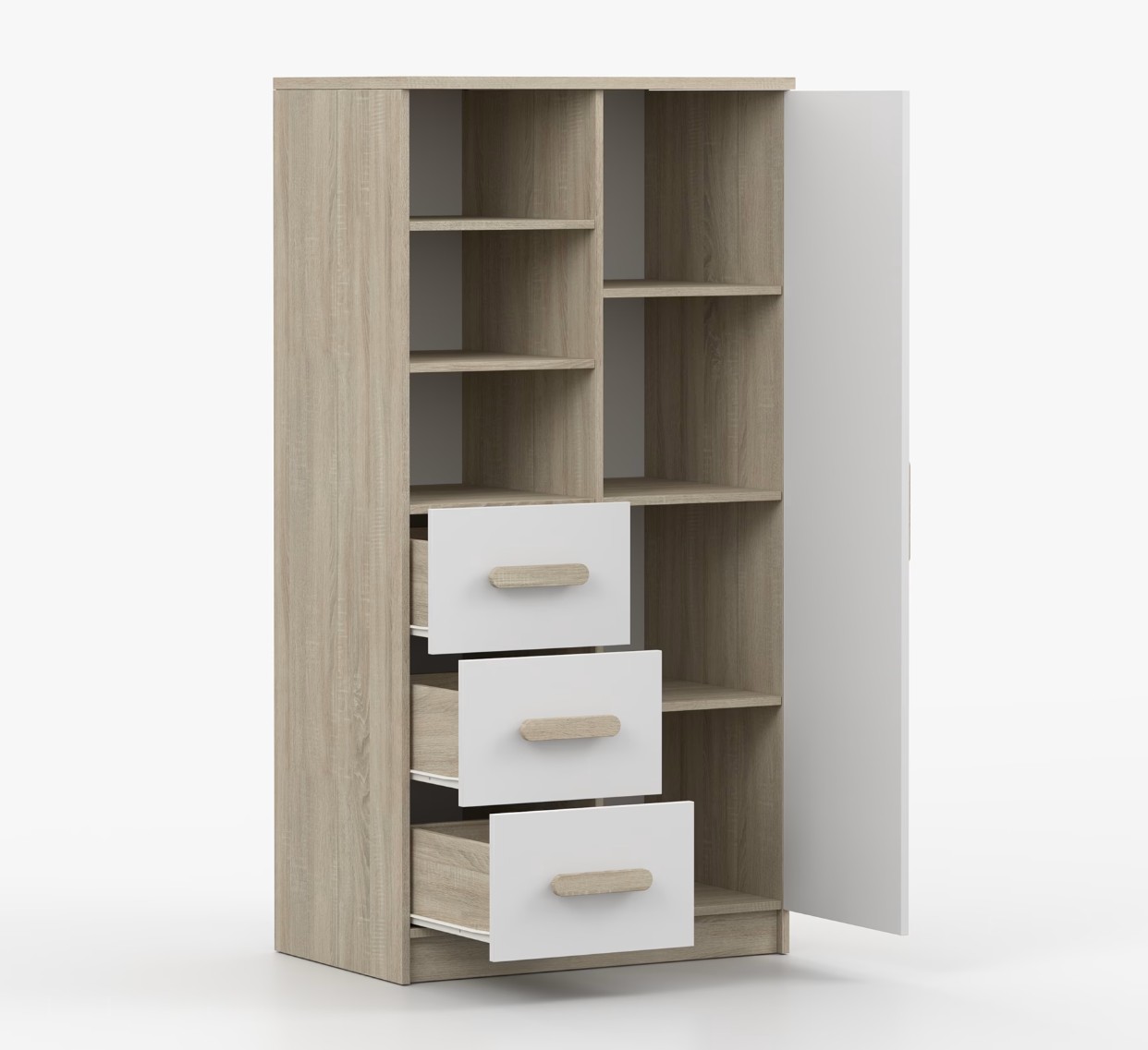 Regál SCOUT ponúka praktické a všestranné úložné riešenie pre každú domácnosť. Je zložený z dvoch políc, troch priestranných zásuviek a bočnej skrinky s vnútornými policami, čo umožňuje dostatok priestoru na uloženie kníh, oblečenia a ďalších vecí. Regál je vyrobený z kvalitnej laminovanej dosky s hrúbkou 16 mm s odolnou ABS lištou, chrániacou hrany regálu pred mechanickým poškodením. Farebné úchytky z PVC dodávajú tomuto praktickému kusu nábytku zaujímavý dizajnový prvok.