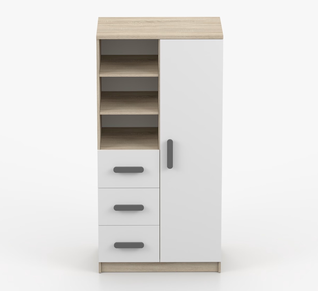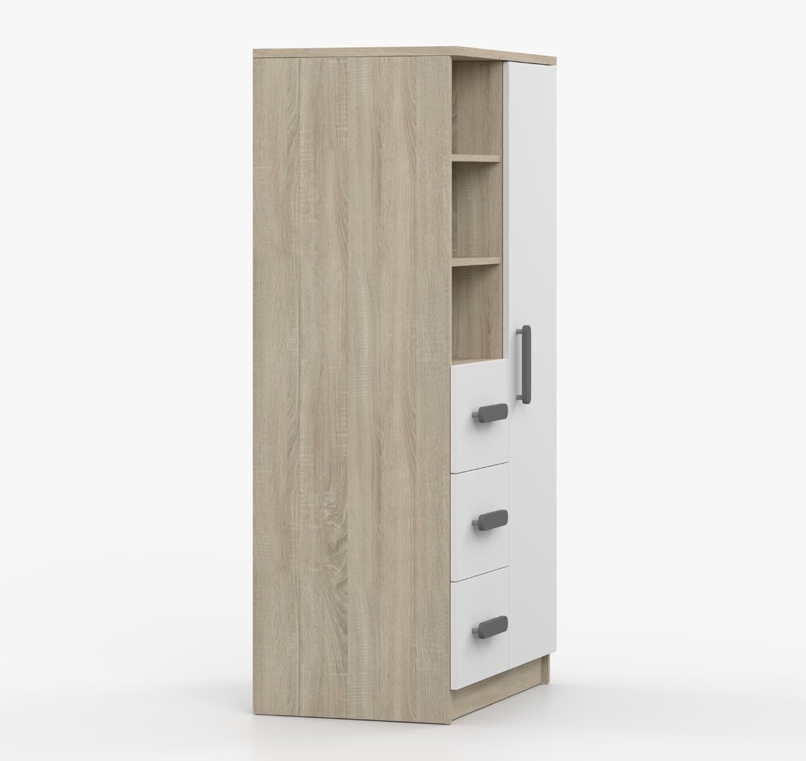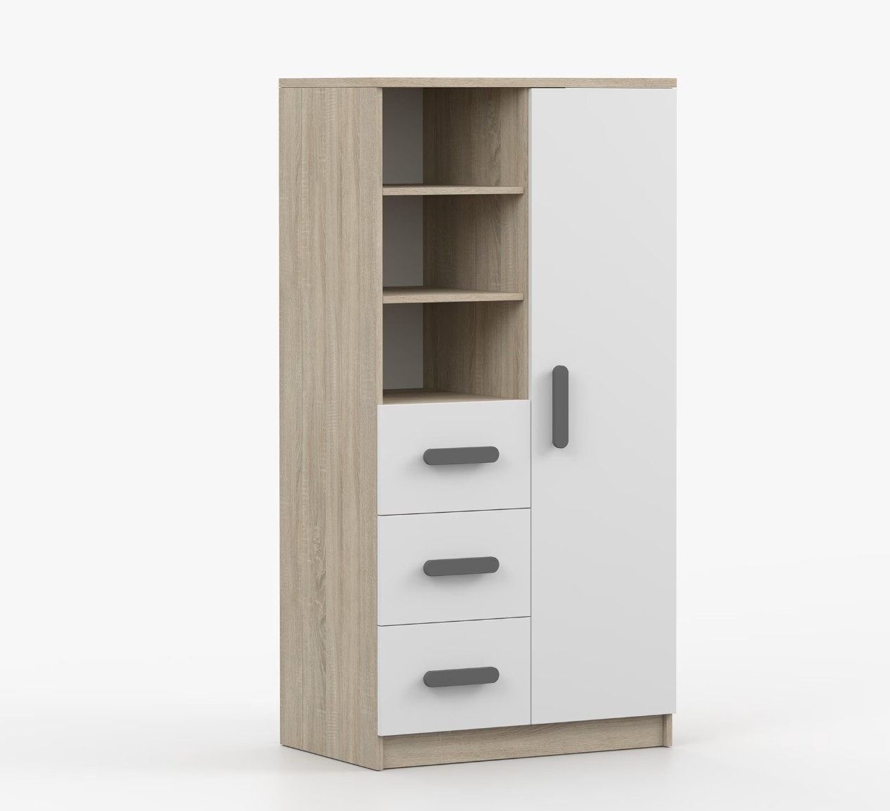 Regál SCOUT ponúka praktické a všestranné úložné riešenie pre každú domácnosť. Je zložený z dvoch políc, troch priestranných zásuviek a bočnej skrinky s vnútornými policami, čo umožňuje dostatok priestoru na uloženie kníh, oblečenia a ďalších vecí. Regál je vyrobený z kvalitnej laminovanej dosky s hrúbkou 16 mm s odolnou ABS lištou, chrániacou hrany regálu pred mechanickým poškodením. Farebné úchytky z PVC dodávajú tomuto praktickému kusu nábytku zaujímavý dizajnový prvok.