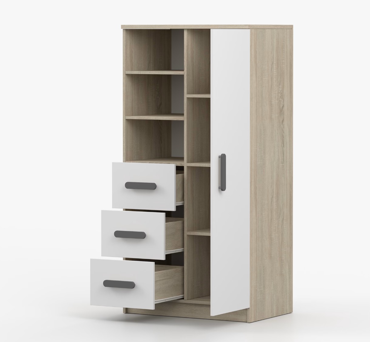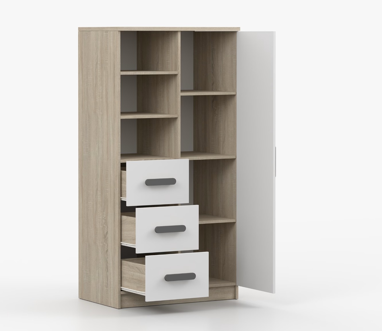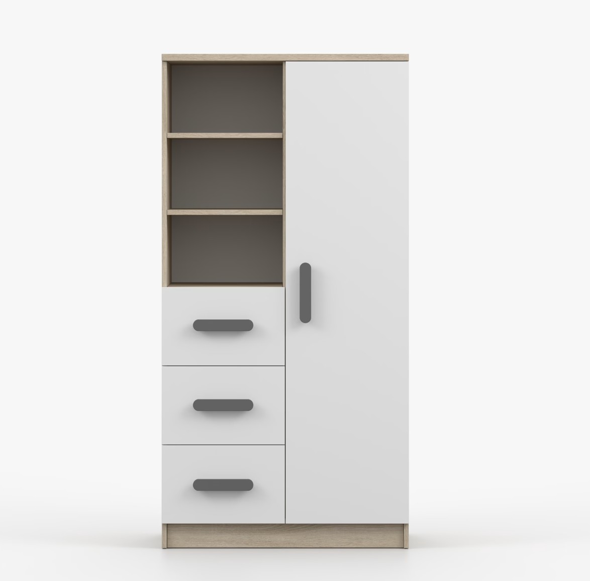 Regál SCOUT ponúka praktické a všestranné úložné riešenie pre každú domácnosť. Je zložený z dvoch políc, troch priestranných zásuviek a bočnej skrinky s vnútornými policami, čo umožňuje dostatok priestoru na uloženie kníh, oblečenia a ďalších vecí. Regál je vyrobený z kvalitnej laminovanej dosky s hrúbkou 16 mm s odolnou ABS lištou, chrániacou hrany regálu pred mechanickým poškodením. Farebné úchytky z PVC dodávajú tomuto praktickému kusu nábytku zaujímavý dizajnový prvok.