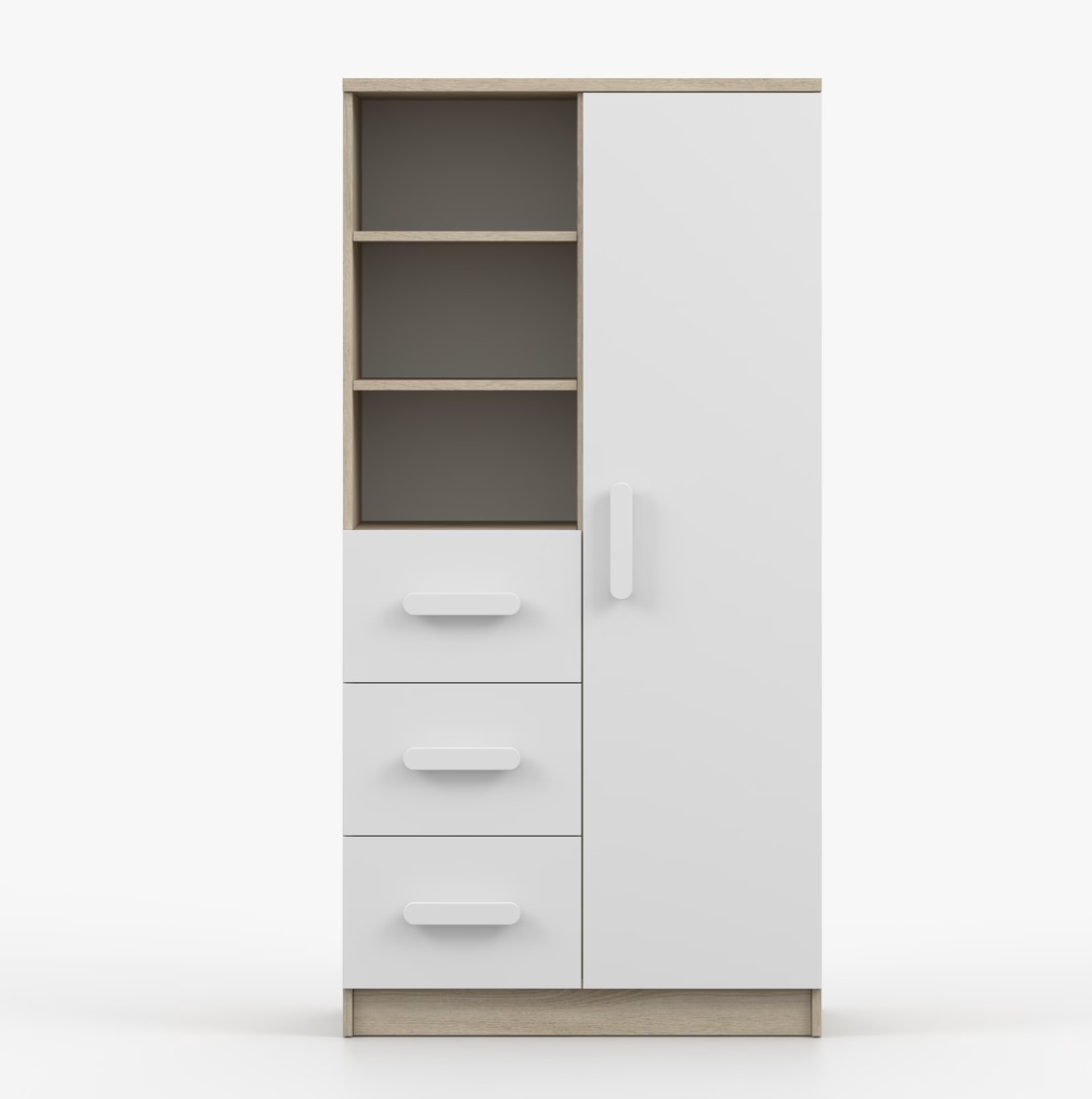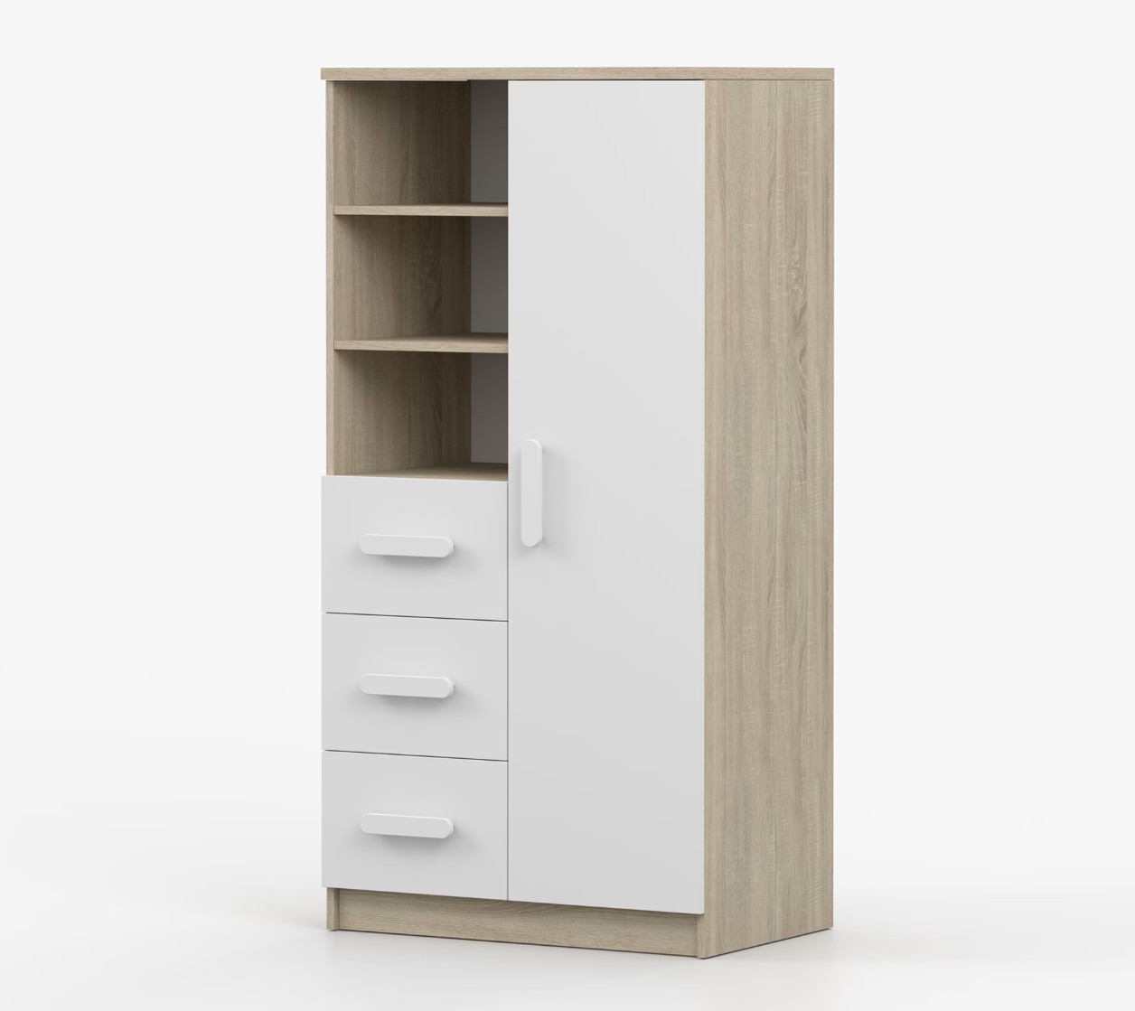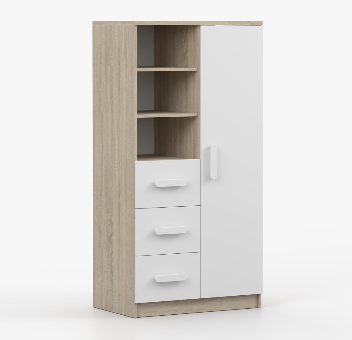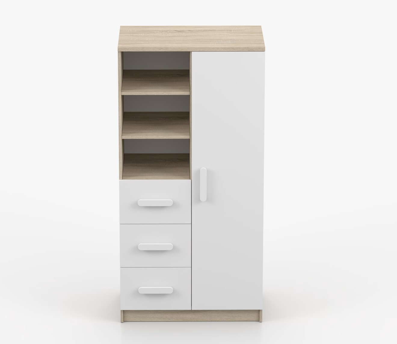 Regál SCOUT ponúka praktické a všestranné úložné riešenie pre každú domácnosť. Je zložený z dvoch políc, troch priestranných zásuviek a bočnej skrinky s vnútornými policami, čo umožňuje dostatok priestoru na uloženie kníh, oblečenia a ďalších vecí. Regál je vyrobený z kvalitnej laminovanej dosky s hrúbkou 16 mm s odolnou ABS lištou, chrániacou hrany regálu pred mechanickým poškodením. Farebné úchytky z PVC dodávajú tomuto praktickému kusu nábytku zaujímavý dizajnový prvok.