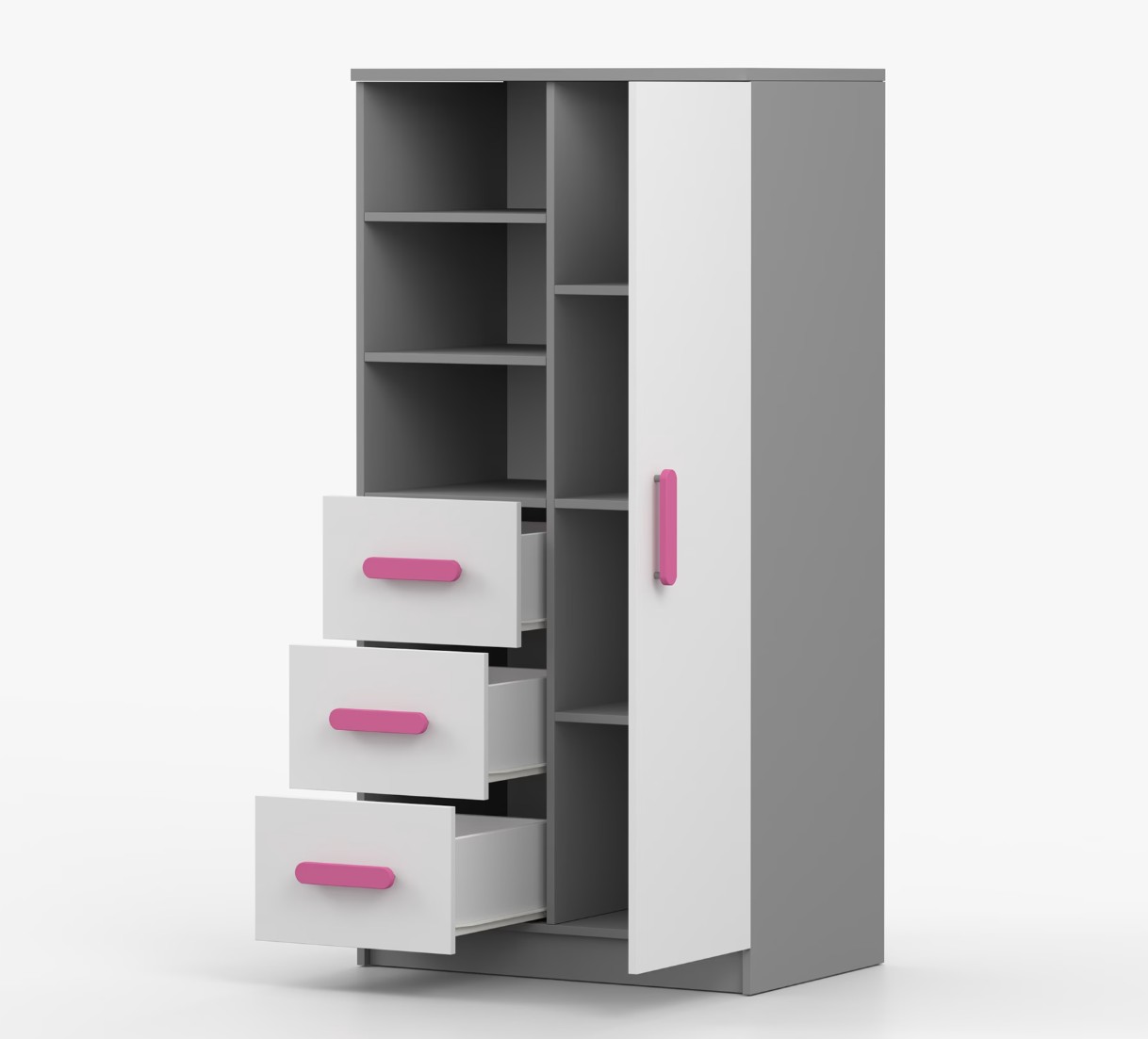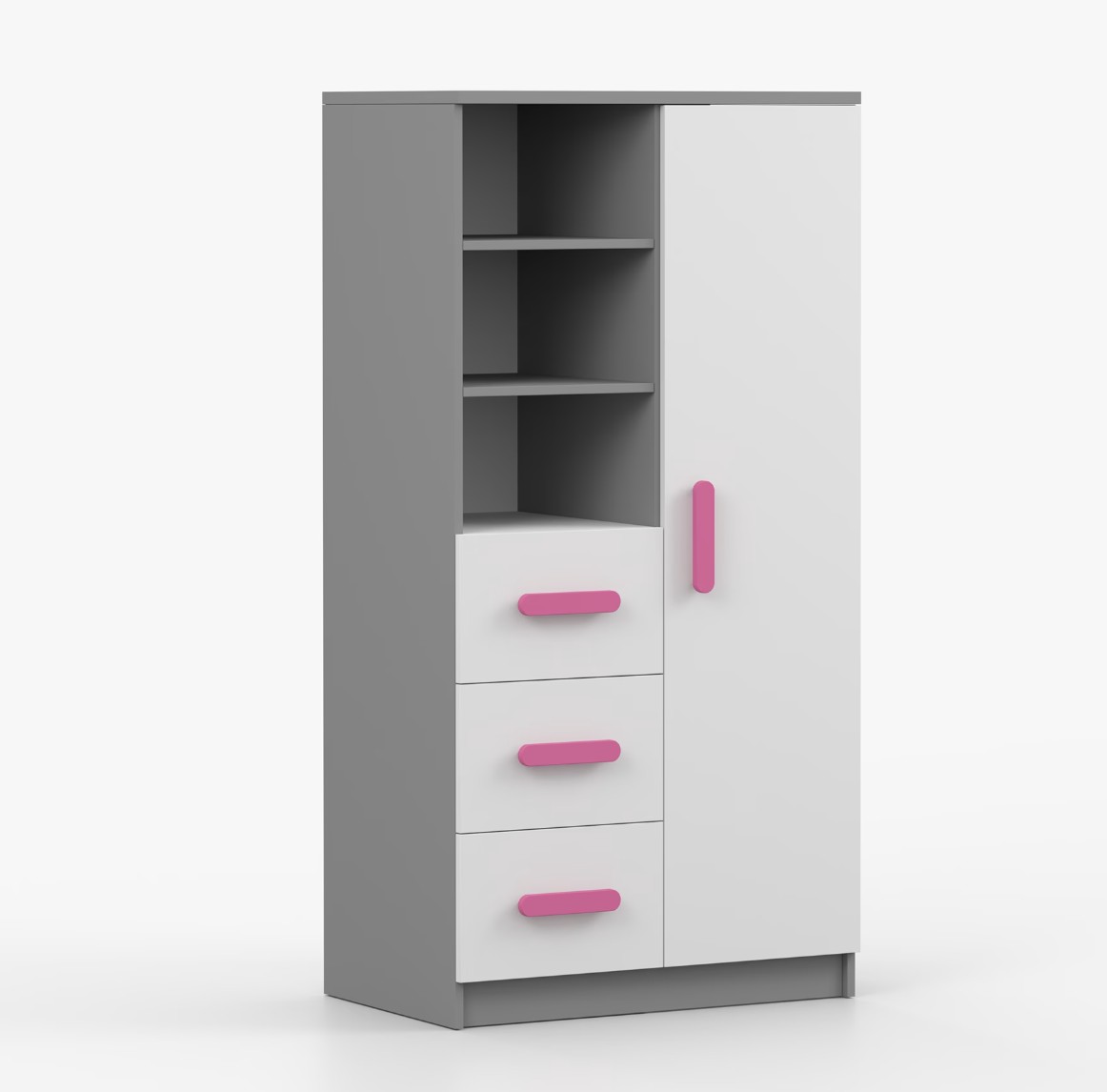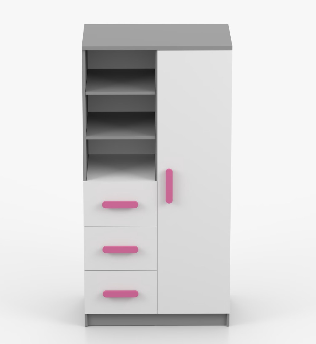 Regál SCOUT ponúka praktické a všestranné úložné riešenie pre každú domácnosť. Je zložený z dvoch políc, troch priestranných zásuviek a bočnej skrinky s vnútornými policami, čo umožňuje dostatok priestoru na uloženie kníh, oblečenia a ďalších vecí. Regál je vyrobený z kvalitnej laminovanej dosky s hrúbkou 16 mm s odolnou ABS lištou, chrániacou hrany regálu pred mechanickým poškodením. Farebné úchytky z PVC dodávajú tomuto praktickému kusu nábytku zaujímavý dizajnový prvok.