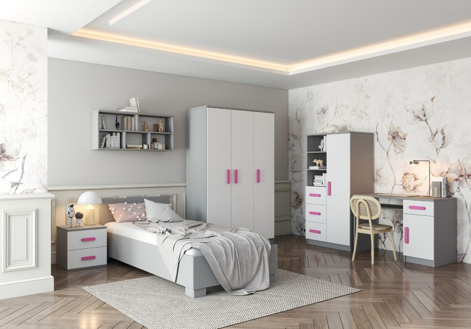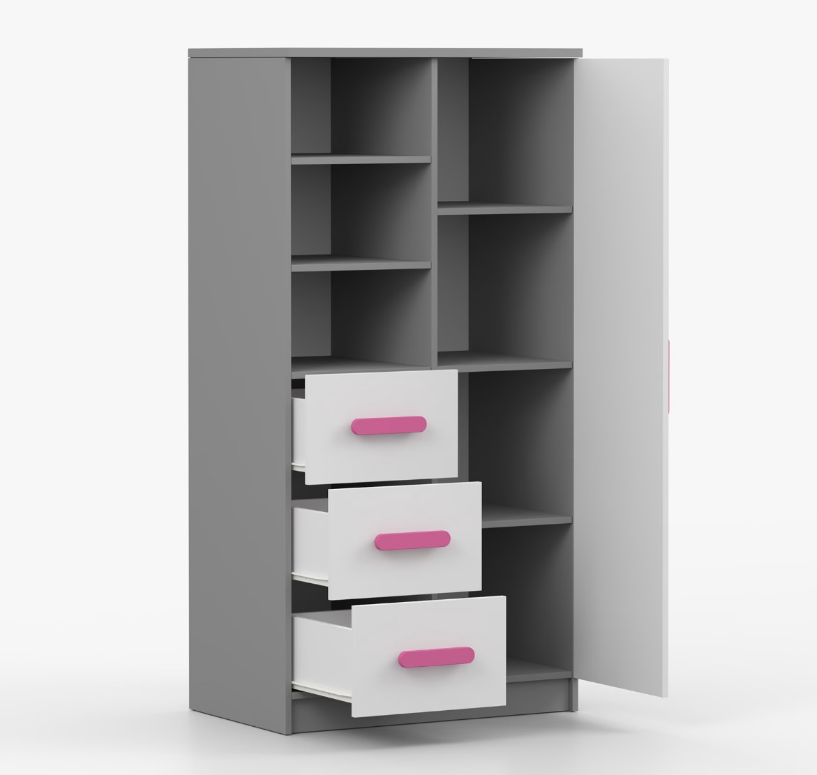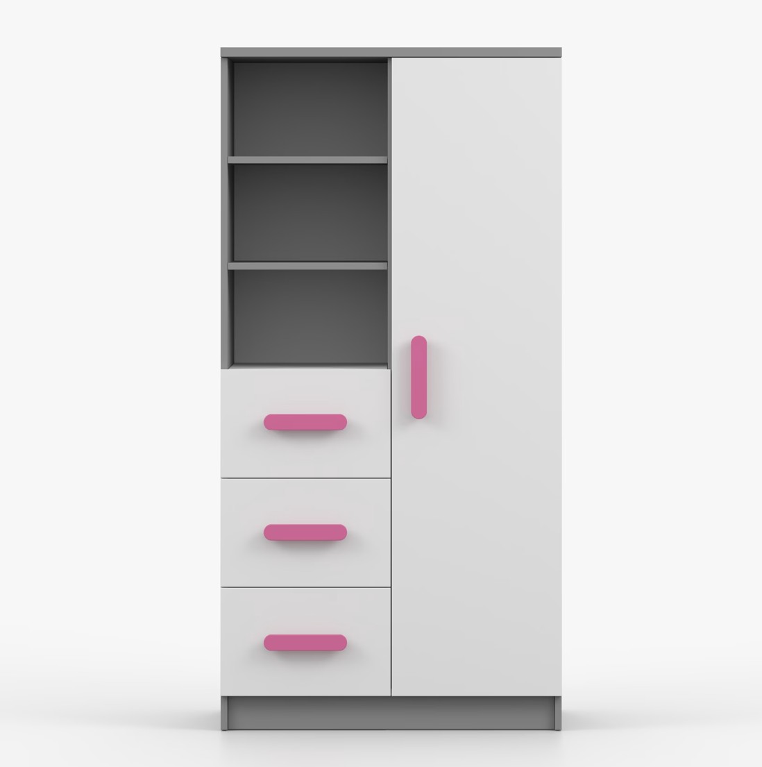 Regál SCOUT ponúka praktické a všestranné úložné riešenie pre každú domácnosť. Je zložený z dvoch políc, troch priestranných zásuviek a bočnej skrinky s vnútornými policami, čo umožňuje dostatok priestoru na uloženie kníh, oblečenia a ďalších vecí. Regál je vyrobený z kvalitnej laminovanej dosky s hrúbkou 16 mm s odolnou ABS lištou, chrániacou hrany regálu pred mechanickým poškodením. Farebné úchytky z PVC dodávajú tomuto praktickému kusu nábytku zaujímavý dizajnový prvok.