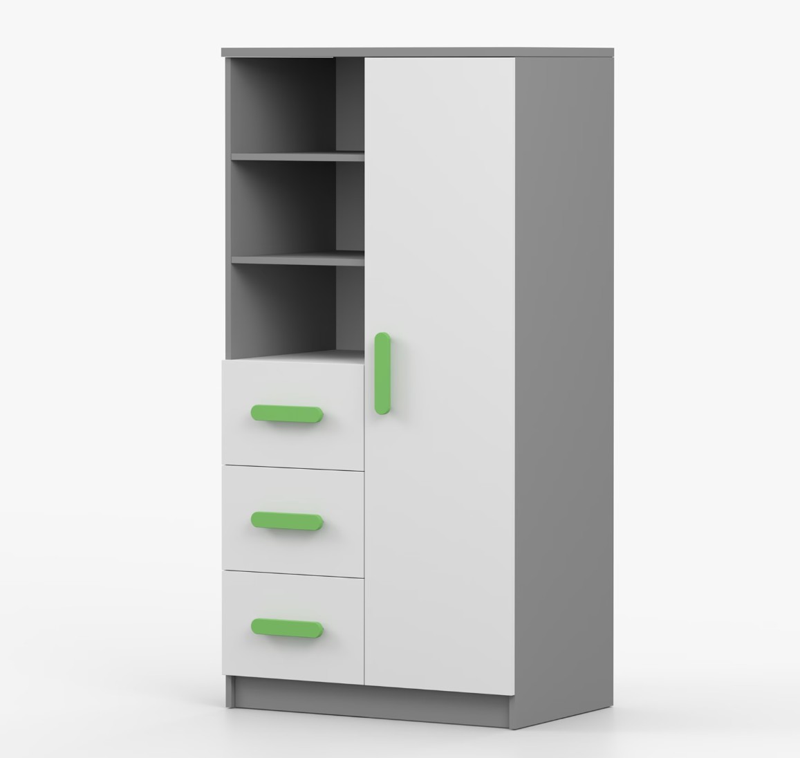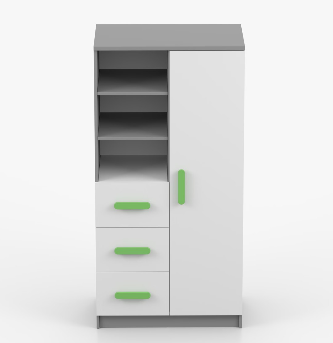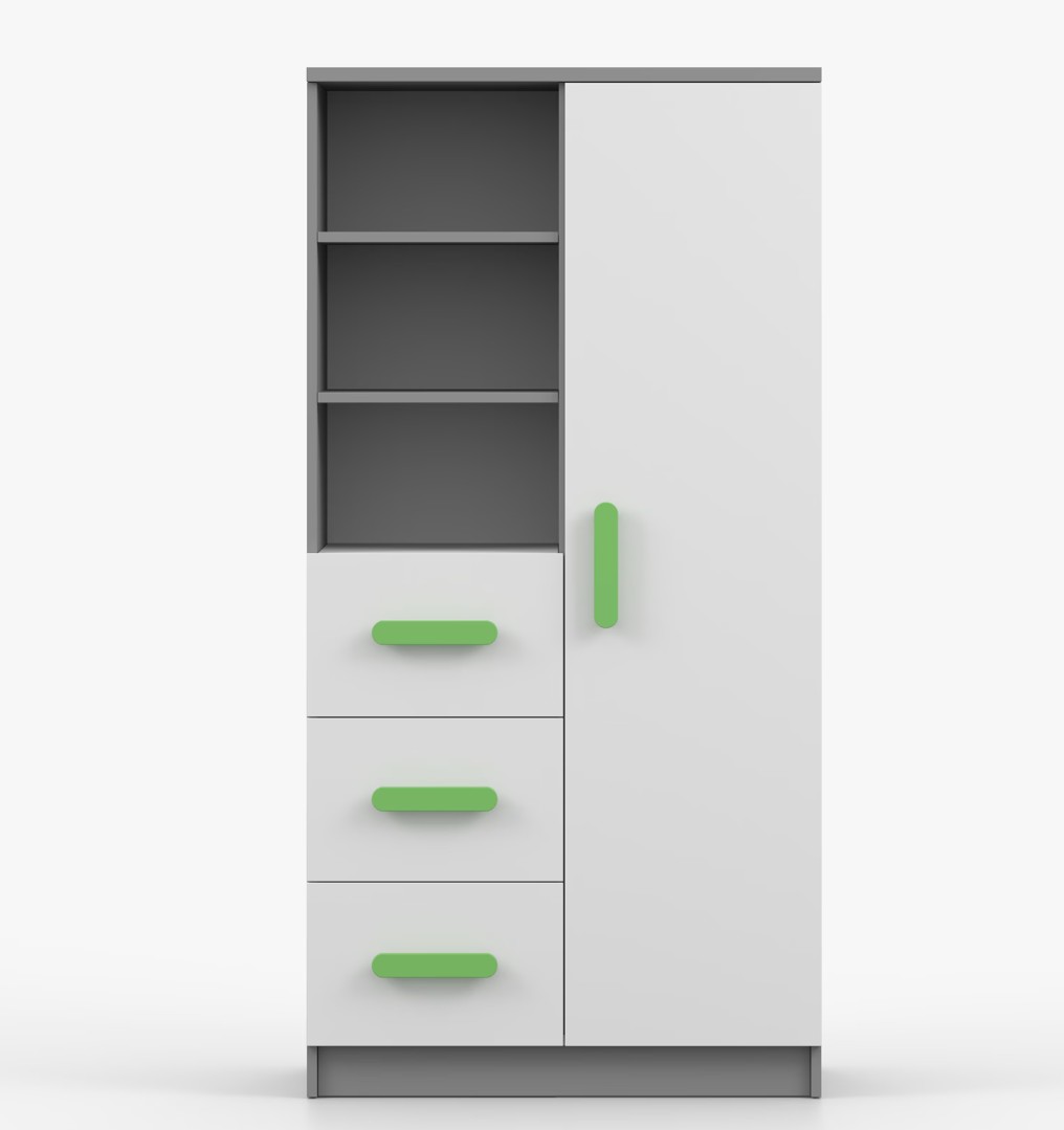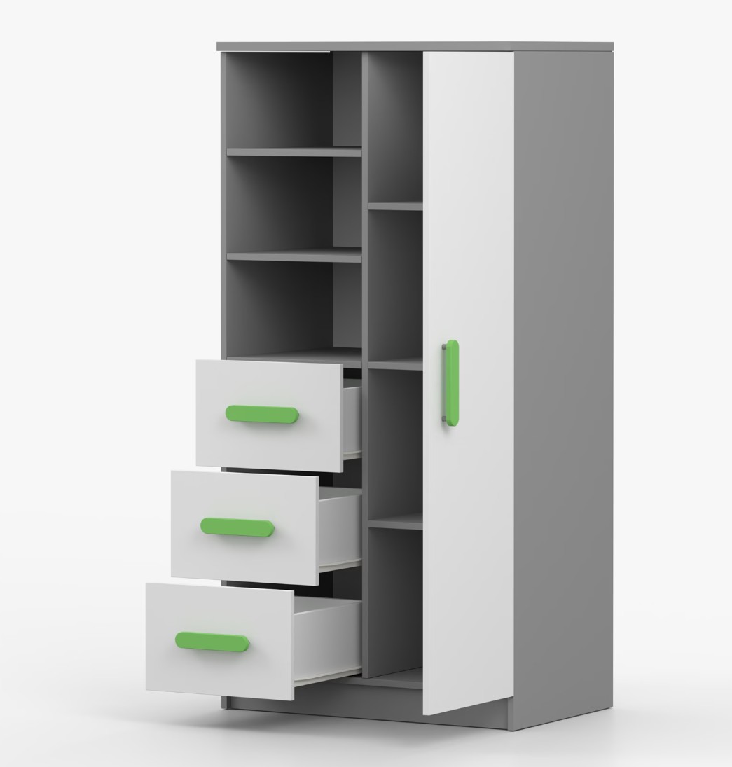 Regál SCOUT ponúka praktické a všestranné úložné riešenie pre každú domácnosť. Je zložený z dvoch políc, troch priestranných zásuviek a bočnej skrinky s vnútornými policami, čo umožňuje dostatok priestoru na uloženie kníh, oblečenia a ďalších vecí. Regál je vyrobený z kvalitnej laminovanej dosky s hrúbkou 16 mm s odolnou ABS lištou, chrániacou hrany regálu pred mechanickým poškodením. Farebné úchytky z PVC dodávajú tomuto praktickému kusu nábytku zaujímavý dizajnový prvok.