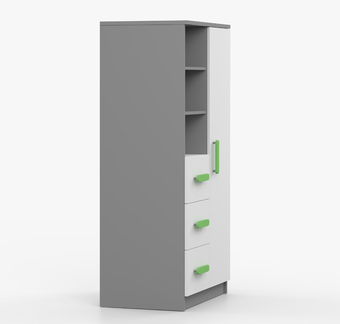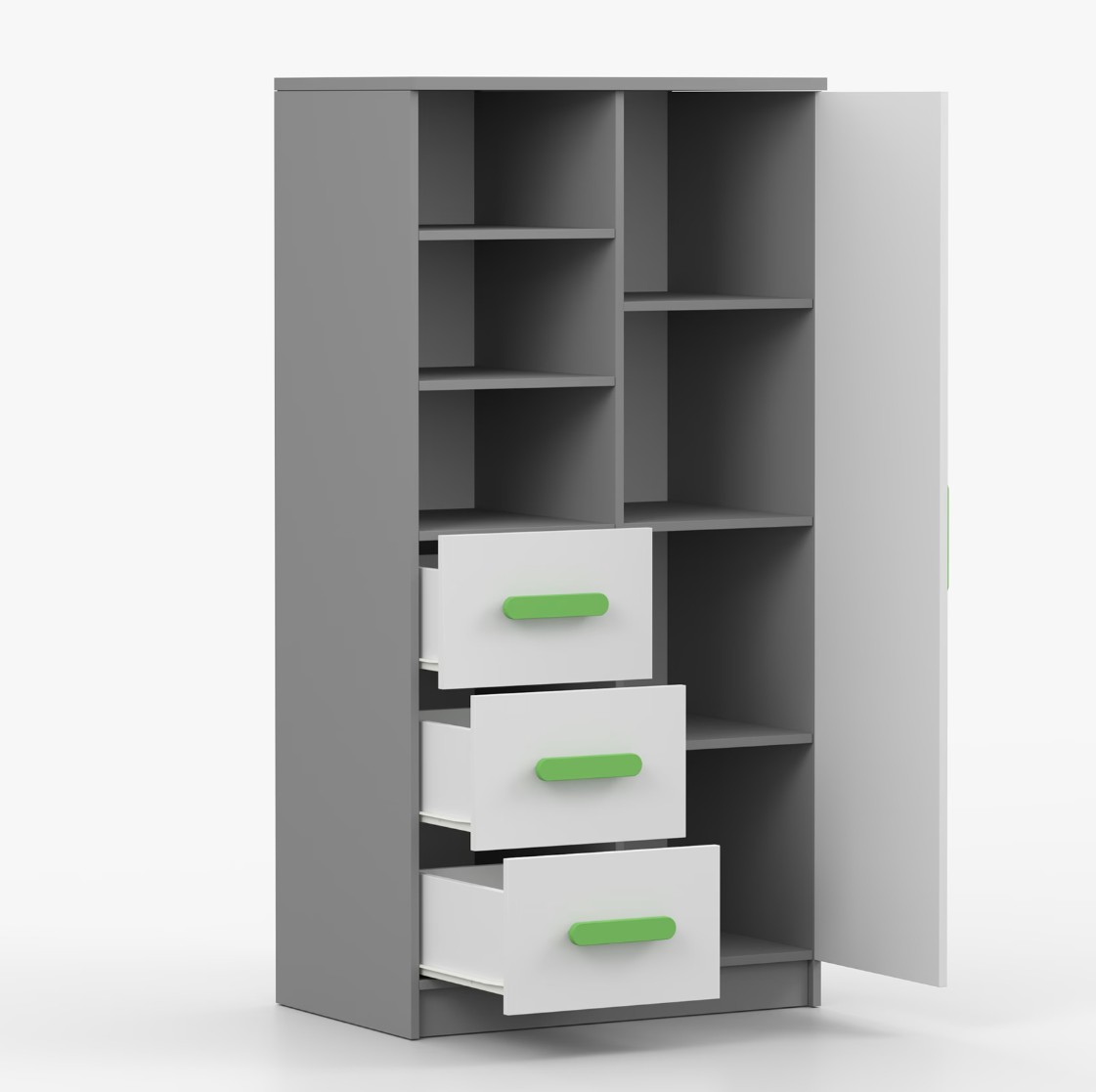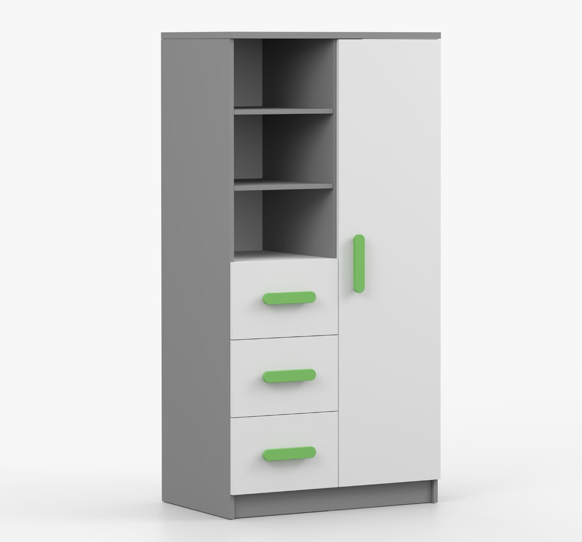 Regál SCOUT ponúka praktické a všestranné úložné riešenie pre každú domácnosť. Je zložený z dvoch políc, troch priestranných zásuviek a bočnej skrinky s vnútornými policami, čo umožňuje dostatok priestoru na uloženie kníh, oblečenia a ďalších vecí. Regál je vyrobený z kvalitnej laminovanej dosky s hrúbkou 16 mm s odolnou ABS lištou, chrániacou hrany regálu pred mechanickým poškodením. Farebné úchytky z PVC dodávajú tomuto praktickému kusu nábytku zaujímavý dizajnový prvok.