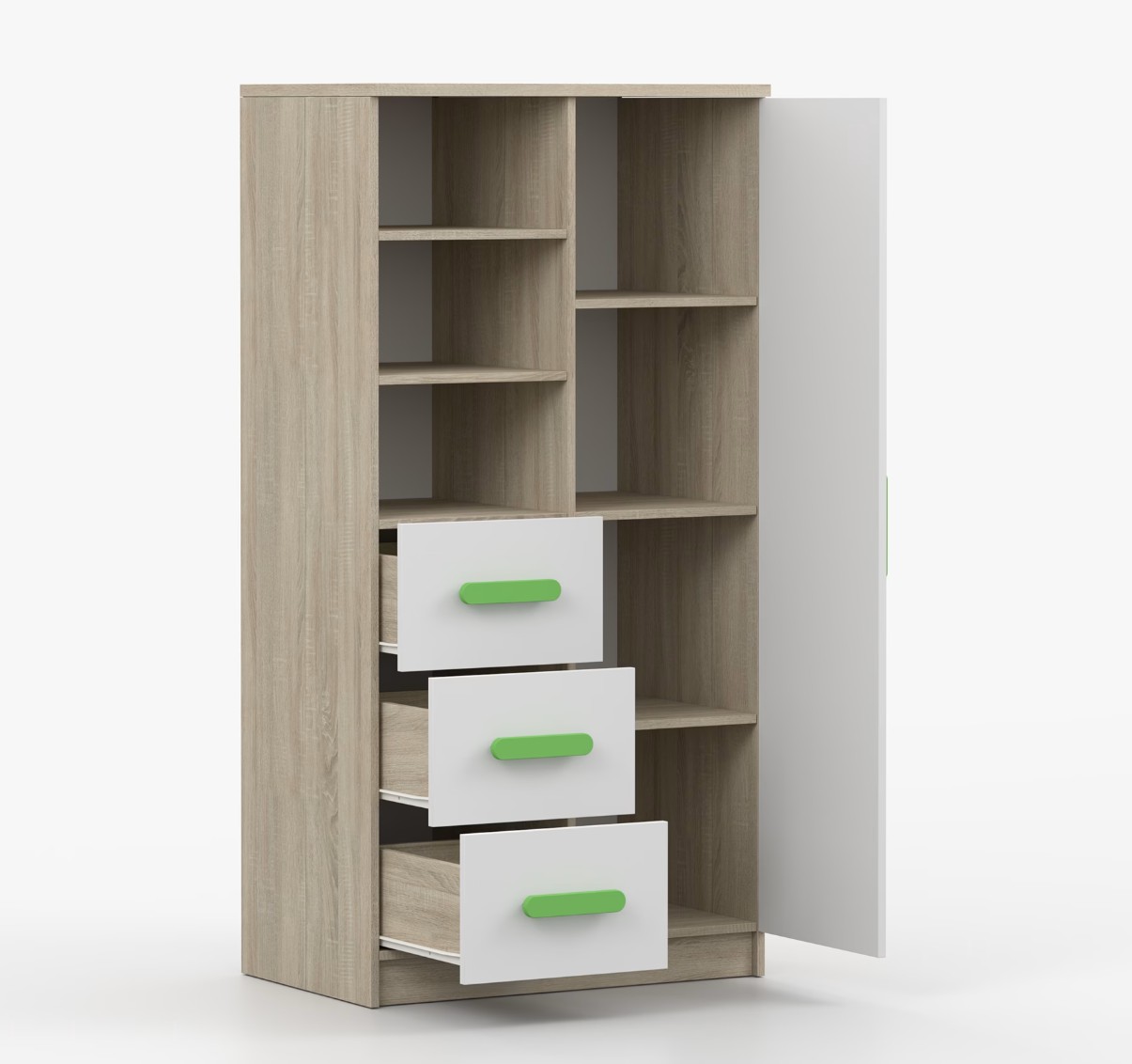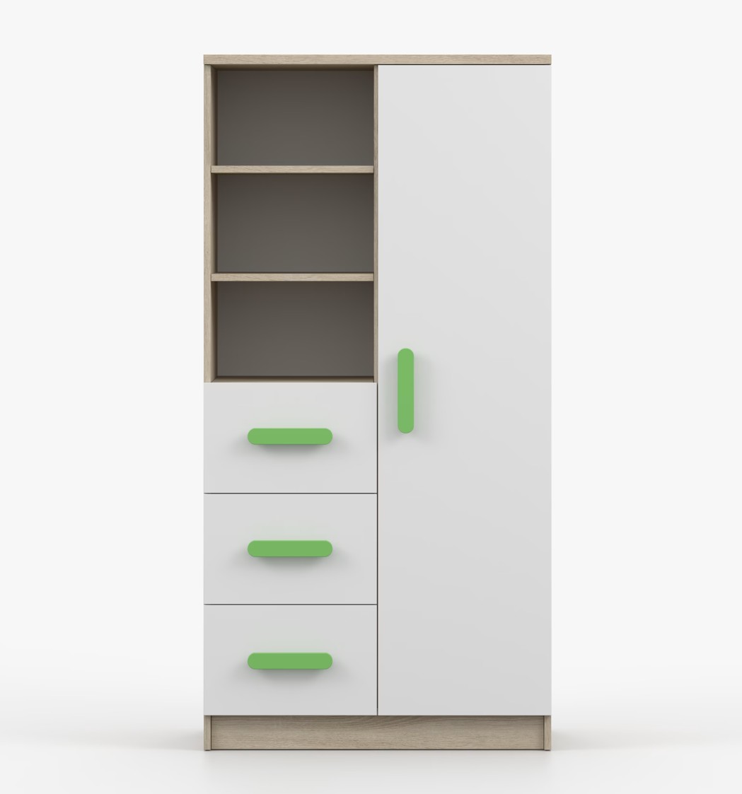 Regál SMYK ponúka praktické a všestranné úložné riešenie pre každú domácnosť. Je zložený z dvoch políc, troch priestranných zásuviek a bočnej skrinky s vnútornými policami, čo umožňuje dostatok priestoru na uloženie kníh, oblečenia a ďalších vecí. Regál je vyrobený z kvalitnej laminovanej dosky s hrúbkou 16 mm s odolnou ABS lištou, chrániacou hrany regálu pred mechanickým poškodením. Farebné úchytky z PVC dodávajú tomuto praktickému kusu nábytku zaujímavý dizajnový prvok.