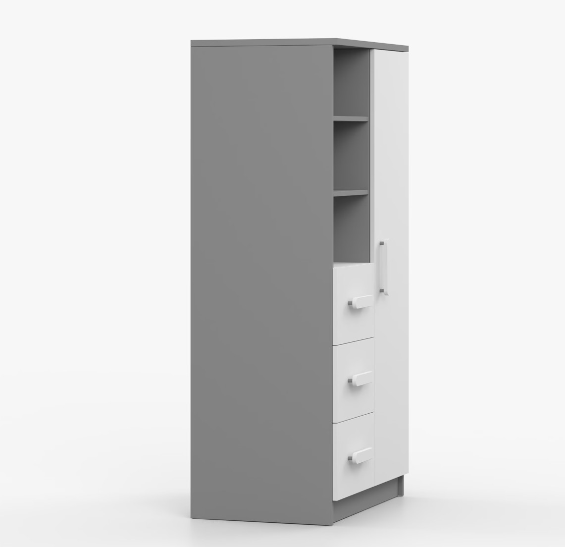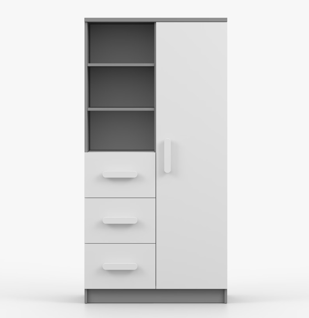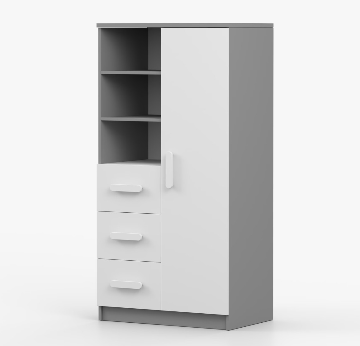 Regál SMYK ponúka praktické a všestranné úložné riešenie pre každú domácnosť. Je zložený z dvoch políc, troch priestranných zásuviek a bočnej skrinky s vnútornými policami, čo umožňuje dostatok priestoru na uloženie kníh, oblečenia a ďalších vecí. Regál je vyrobený z kvalitnej laminovanej dosky s hrúbkou 16 mm s odolnou ABS lištou, chrániacou hrany regálu pred mechanickým poškodením. Farebné úchytky z PVC dodávajú tomuto praktickému kusu nábytku zaujímavý dizajnový prvok.