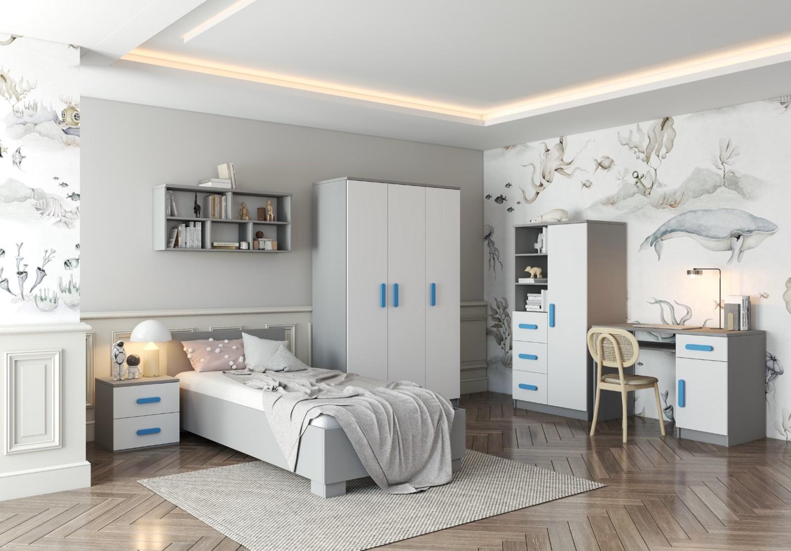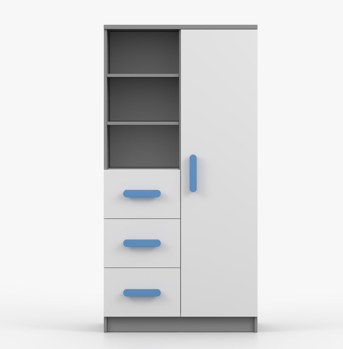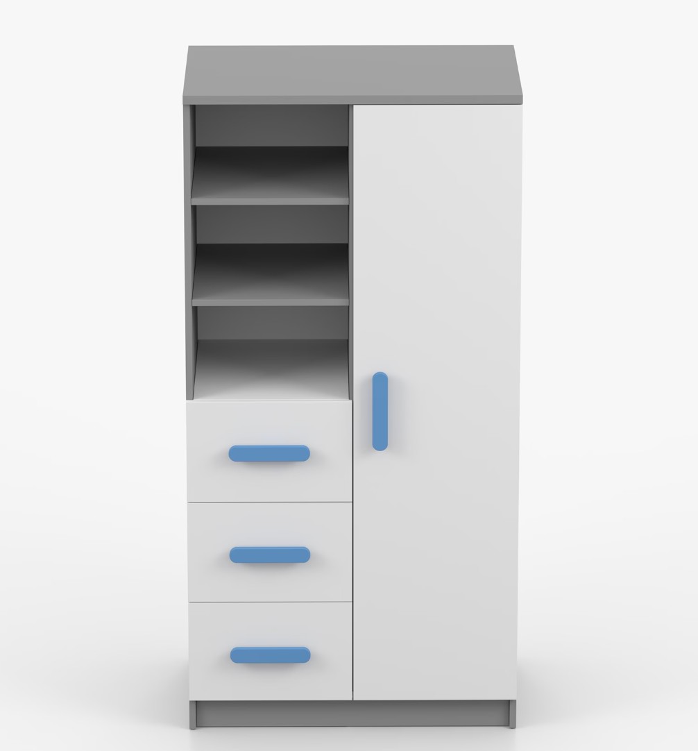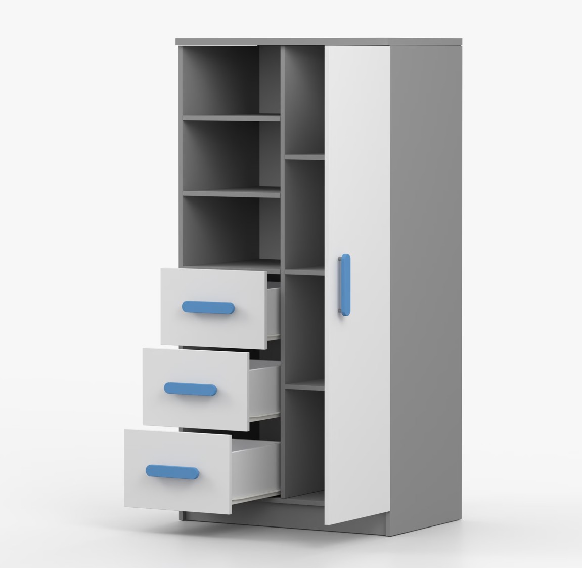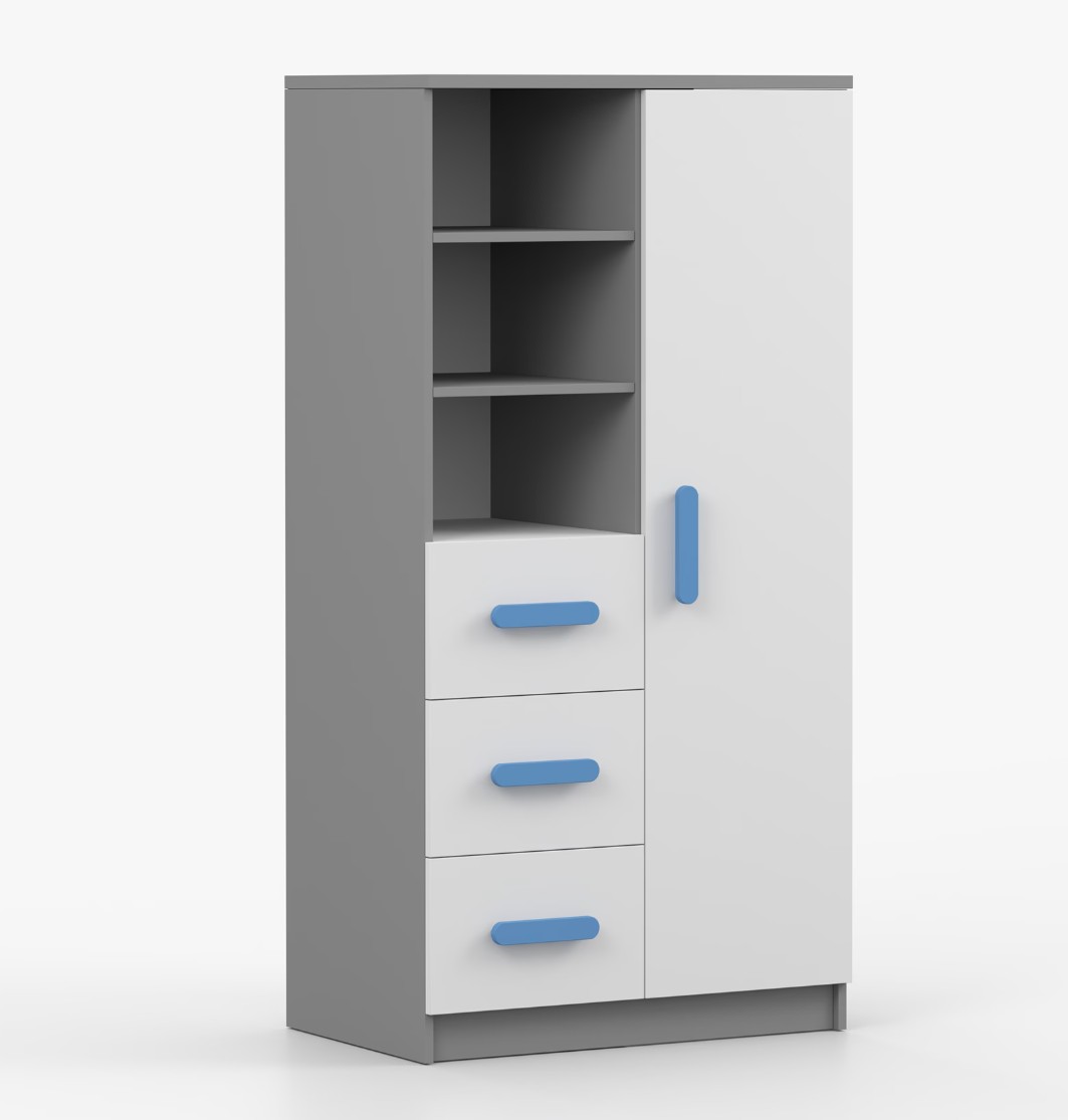 Regál SMYK ponúka praktické a všestranné úložné riešenie pre každú domácnosť. Je zložený z dvoch políc, troch priestranných zásuviek a bočnej skrinky s vnútornými policami, čo umožňuje dostatok priestoru na uloženie kníh, oblečenia a ďalších vecí. Regál je vyrobený z kvalitnej laminovanej dosky s hrúbkou 16 mm s odolnou ABS lištou, chrániacou hrany regálu pred mechanickým poškodením. Farebné úchytky z PVC dodávajú tomuto praktickému kusu nábytku zaujímavý dizajnový prvok.
