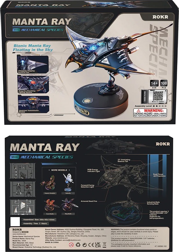 Manta raja je 3D mechanické puzzle, ktoré vás pozýva k tomu, aby ste boli svedkami tohto fascinujúceho pohybu zblízka. Táto replika manty vnesie do vášho interiéru eleganciu a kúzlo morského života. Tento miniatúrny 3D model si zostavíte sami a výsledok vás očarí nielen pohybom, ale aj svetlom a atmosférou. Vďaka charakteristickému šípovému vzoru a plynulému pohybu plutiev model zachytáva zdanlivú beztiažnu eleganciu skutočnej manty. Priložený podstavec model zdvihne a stlačením tlačidla sa prsné plutvy začnú hladko kývať, chvost jemne kymáca a LED svetlá pulzujú v rytme pohybu. Druhým stlačením sa spustí rýchlo blikajúci a plutvami zrýchľujúci režim „Burst Mode“, ktorý napodobňuje náhly nárast rýchlosti manty. Tento model je fascinujúcou kombináciou technickej precíznosti a krásy morského života. Skvele sa hodí ako dekorácia, dizajnový doplnok alebo originálny darček pre milovníkov prírody a mechanických modelov.