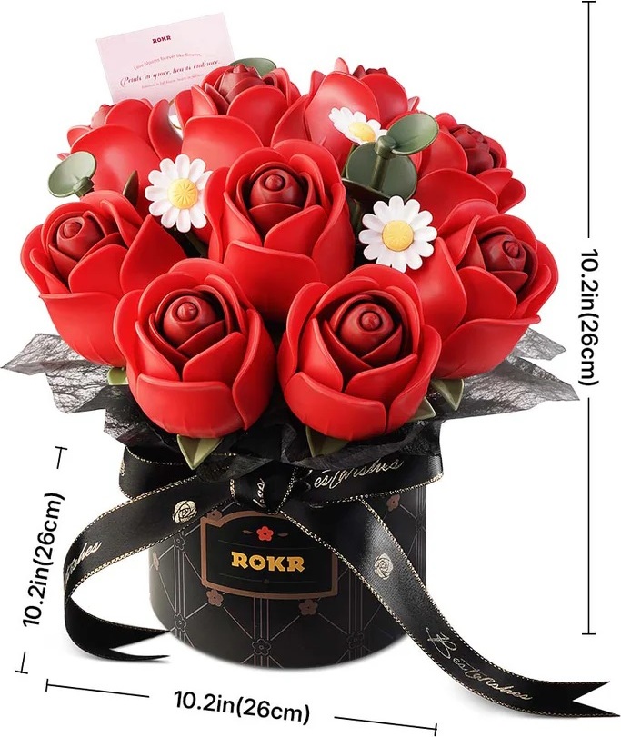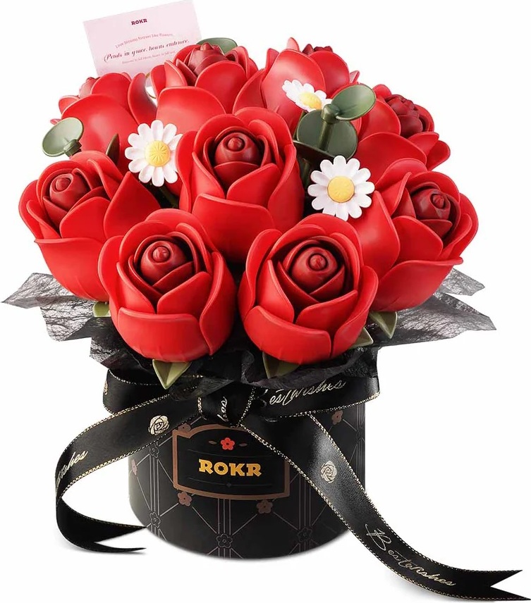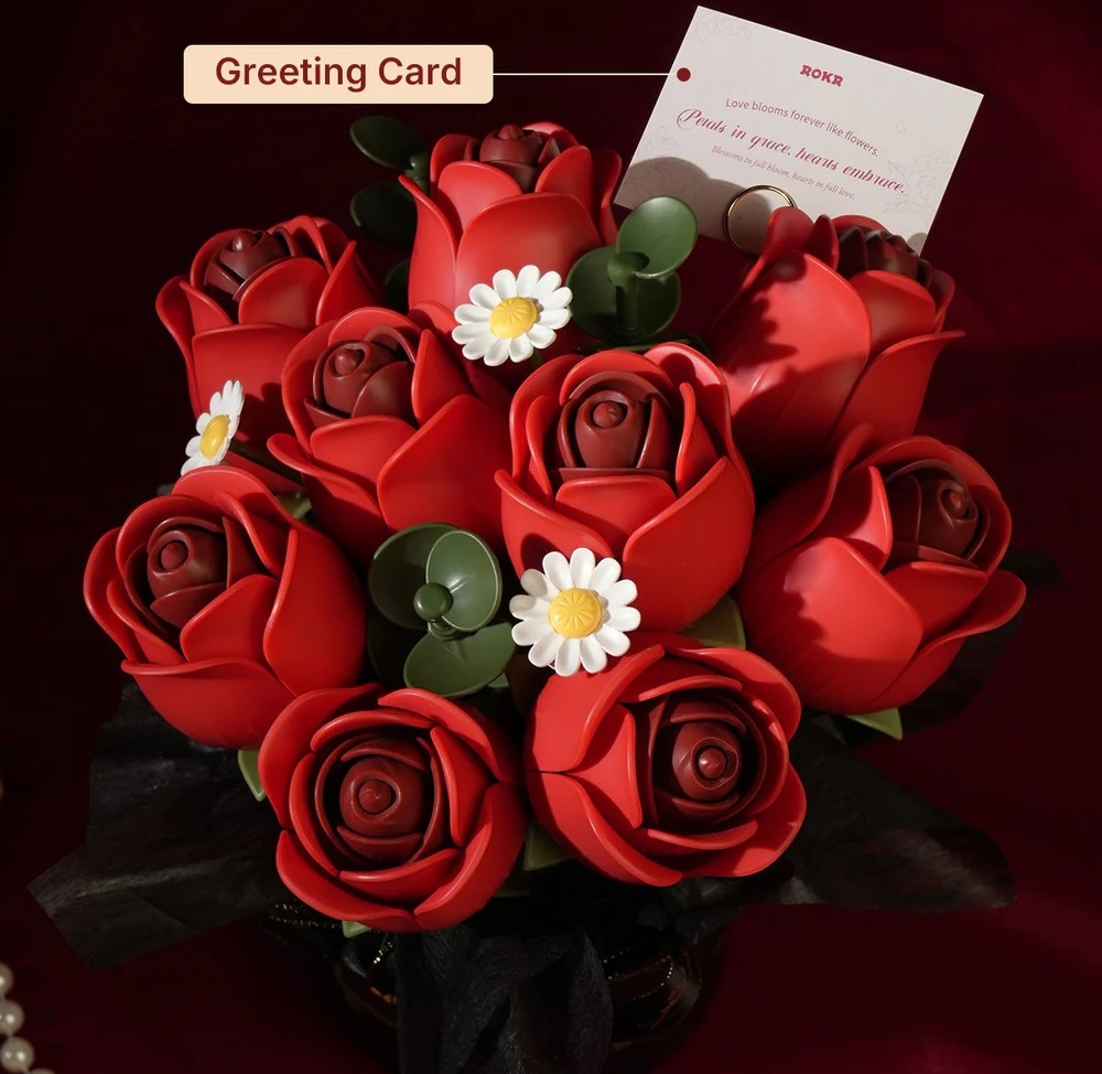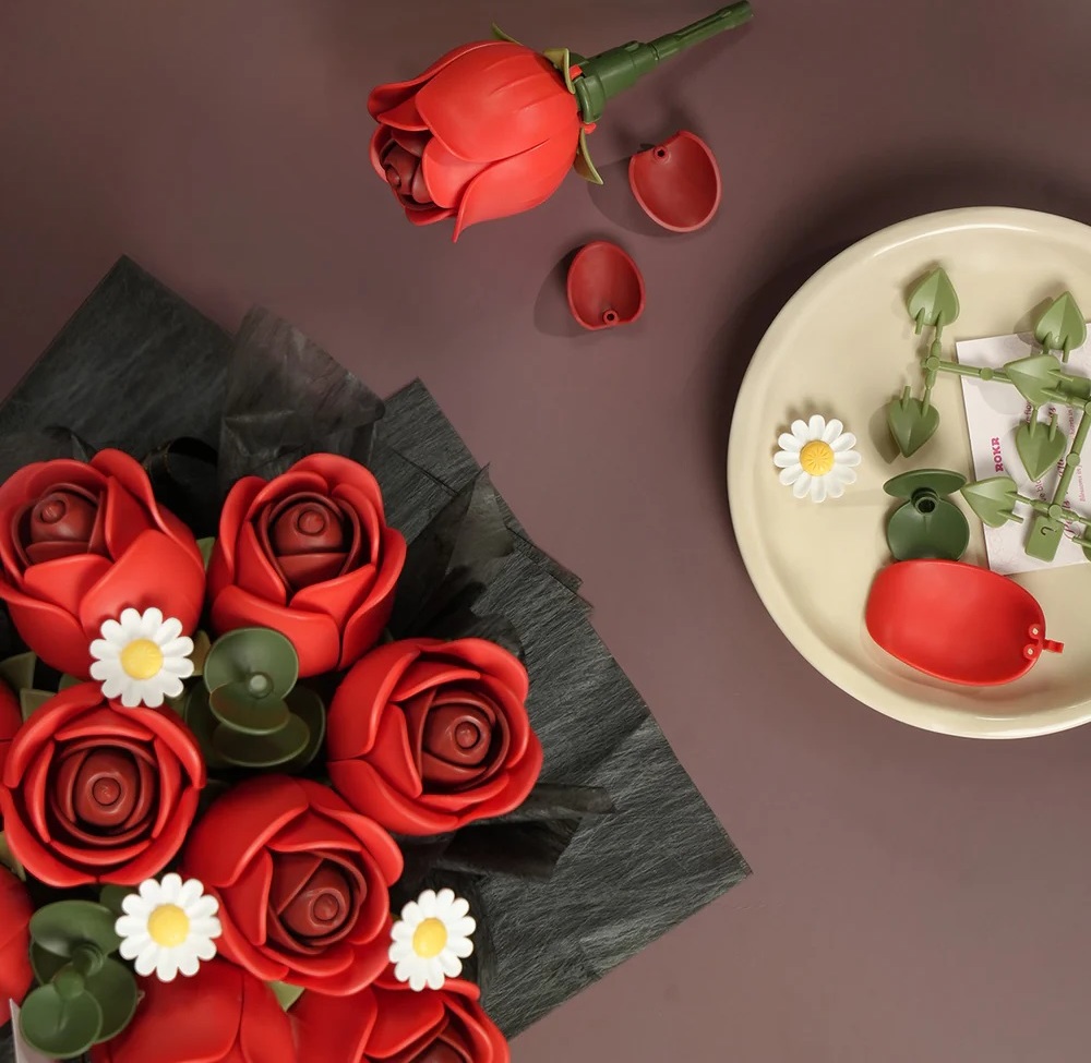 Rozkvitnite do tvorivej blaženosti s týmto nadčasovým symbolom lásky a vášne. Pretože táto kytica nikdy neuvädne, stane sa trvalou pripomienkou vašej neochvejnej oddanosti. Už ste niekedy niekoho dojali až k slzám? Teraz to dokážete s kyticou červených ruží - aranžmán z deviatich francúzskych vínovo červených ruží, doplnených sedmokráskami a vetvičkami eukalyptu. Táto stavebnica s 315 dielikmi doslova rozkvitá významom a symbolizuje nielen lásku, ale aj hlbšiu náklonnosť a autenticitu. Kytica je dodávaná v elegantnom kvetinovom boxe s mriežkovaným vzorom a na zvýraznenie elegancie je zabalená do zamatovo pôsobiaceho papiera. Pokiaľ si chcete dať záležať na každom detaile, okvetné lístky je možné ručne tvarovať a stonky výškovo nastaviť, takže si kyticu ľahko naaranžujete k dokonalosti. Súčasťou balenia je aj darčeková karta, na ktorú môžete napísať osobný odkaz a pripraviť sa na okamih, kedy sa niečie srdce skutočne rozochveje.