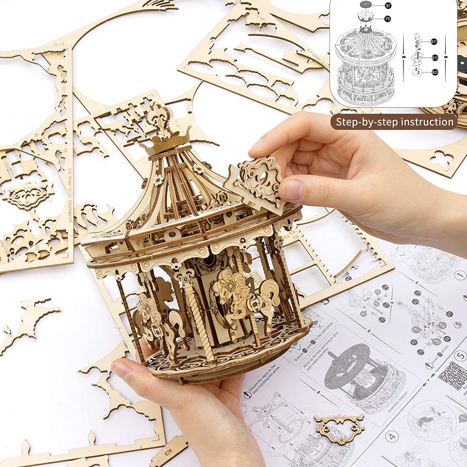 Romantický kolotoč je skutočný mechanický hudobný kolotoč. Vďaka prepracovanej romantickej výzdobe a melódii si pri jeho skladaní aj po ňom užijete veľa zábavy. Laserom vyrezávané dieliky z 2 mm lipovej preglejky. Jednotlivé dieliky sa vytláčajú priamo z preglejky, postupujte postupne a opatrne. Klasický vzhľad a skutočný kolotočový mechanizmus. Vnútorné kone idú pri prehrávaní melódie opačným smerom ako vonkajší stupeň. Melódia: Kolotočový Waltz. HRACIA SKRINKA poháňaná naťahovacou pružinou a prevodovými súkoliami. Kvalitné, bezpečné a netoxické materiály. Rozvíja technické myslenie, predstavivosť, cit pre detail a jemnú motoriku. Prekrásny darček pre všetkých a na všetky príležitosti. Jemná a pôsobivá dekorácia. Obtiažnosť: 4 z 5 (podľa rozdelenia Robotime). Orientačná doba na zloženie: 5 hodiny. Balenie obsahuje: materiál na výrobu modelu, obrázkový návod s doplňujúcimi textami v angličtine a QR kód na zobrazenie montážneho videa. Upozornenie: Používať iba pod dohľadom dospelej osoby. Rozmer zloženého puzzle cca 17 x 17 x 23,5 cmVlastnosti