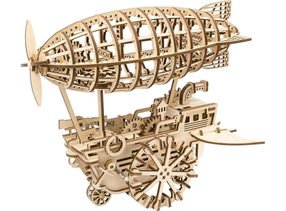 Drevený model retro steampunkovej vzducholode Robotime ROKR s jemne zdobenou kostrou vyskúša vašu zručnosť pri zostavovaní prevodov ozubených kolies, vzdušnej konštrukcie a vrtule. Zábavné skladanie s kúzlom mechanických prevodov a množstvom pohyblivých prvkov Model je poháňaný naťahovacou pružinou. Laserom predrezané dieliky z kvalitnej lipovej preglejky na stavbu svojpomocne, lepidlo nie je potrebné. Rozvíja technické myslenie, predstavivosť, cit pre detail a jemnú motoriku. Historický a vzdušný vzhľad z neho robia umeleckú dekoráciu. Skvelý darček ku všetkým príležitostiam. Prehľadný obrázkový návod krok za krokom. Obtiažnosť: 4 z 5 (podľa rozdelenia Robotime). Rozmer zloženého puzzle cca 30 x 21,5 x 25 cm
