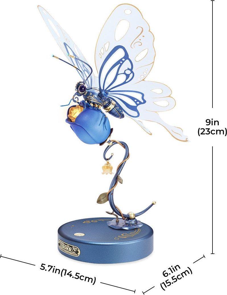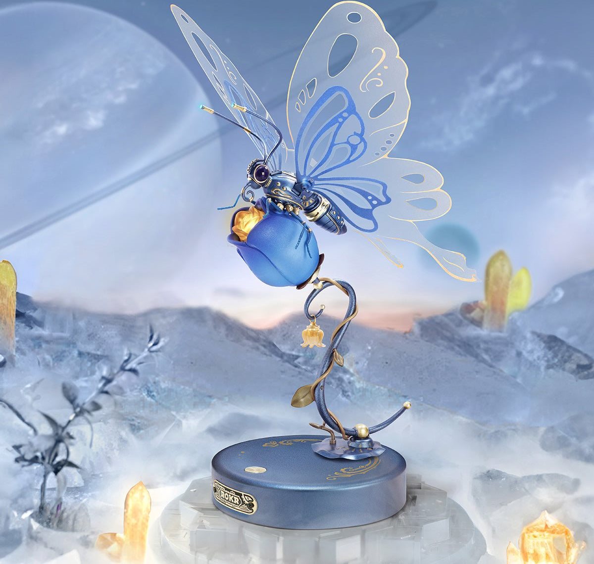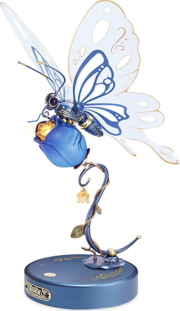 3D model zo série ROBOTIME Rokr Mechanical. Záhadný motýľ prešiel kúzelnou mechanickou evolúciou – jeho mechanizované telo prináša nielen krásu, ale aj nové výzvy a ťažkosti. Príroda je plná tajomnej krásy - a ROKR teraz obracia svoju pozornosť k svetlým, ľahkým motýľom a prináša vám nový mechanický druh. Telo motýľa je pevne spracované z odolného materiálu ABS, zatiaľ čo jeho trblietavé mäkké krídla sú z pružného PVC. Špeciálna tlačová metóda pridáva elegantné šampanské vzory a na jeho chrbte žiari trblietavý drahokam, ktorý sa leskne na slnku. Motýľ pristáva na kvete ruže s jemnými úponkami. Položte motýľa na základňu, zapnite ho a jemne sa ho dotknite - uvidíte, ako mu začnú mávať krídla. Ako sa mení frekvencia mávania, ruže aj jeho tykadlá sa jemne rozsvecujú, akoby dýchali a ožívali – av slnečnom svetle sa celá scéna nádherne trblieta.