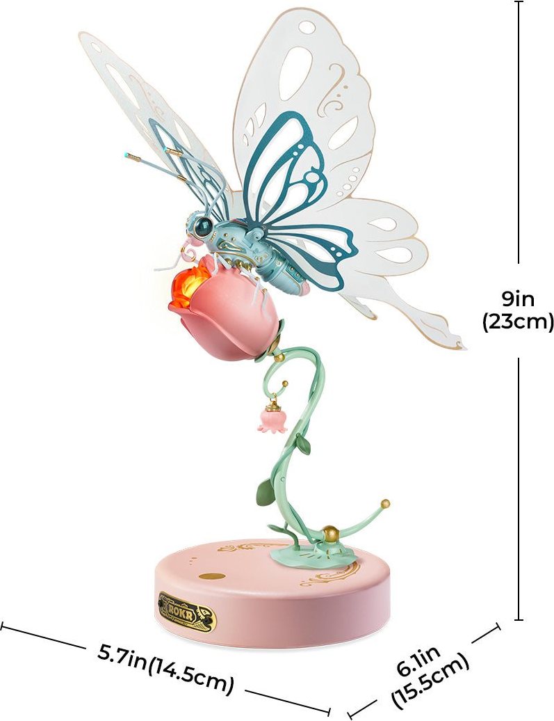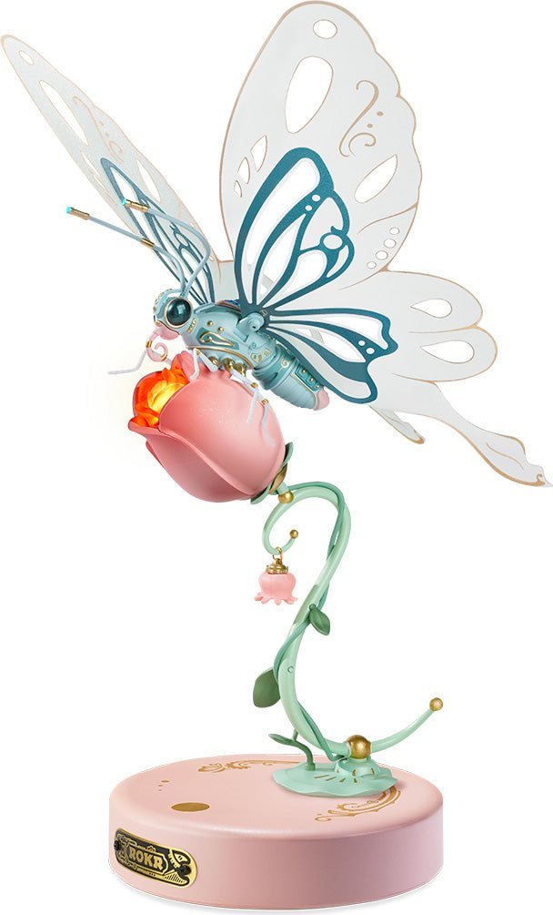 3D model zo série ROBOTIME Rokr Mechanical. Záhadný motýľ prešiel kúzelnou mechanickou evolúciou – jeho mechanizované telo prináša nielen krásu, ale aj nové výzvy a ťažkosti. Príroda je plná tajomnej krásy - a ROKR teraz obracia svoju pozornosť k svetlým, ľahkým motýľom a prináša vám nový mechanický druh. Telo motýľa je pevne spracované z odolného materiálu ABS, zatiaľ čo jeho trblietavé mäkké krídla sú z pružného PVC. Špeciálna tlačová metóda pridáva elegantné šampanské vzory a na jeho chrbte žiari trblietavý drahokam, ktorý sa leskne na slnku. Motýľ pristáva na kvete ruže s jemnými úponkami. Položte motýľa na základňu, zapnite ho a jemne sa ho dotknite - uvidíte, ako mu začnú mávať krídla. Ako sa mení frekvencia mávania, ruže aj jeho tykadlá sa jemne rozsvecujú, akoby dýchali a ožívali – av slnečnom svetle sa celá scéna nádherne trblieta.