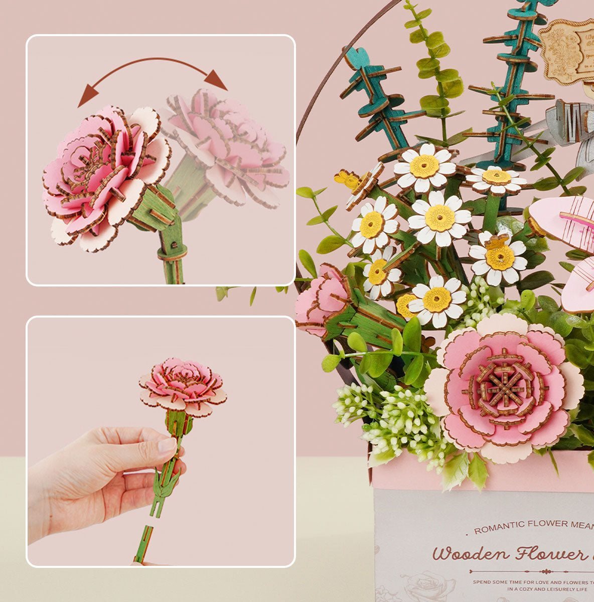 Poskladajte si vlastné 3D drevené kvety. Skladanie 3D modelov podporuje rozvoj jemnej motoriky, priestorového myslenia a trpezlivosti. Pozvite svoju rodinu alebo priateľov a užite si zábavné tvorenie bez nutnosti použitia lepidla alebo nástrojov. Všetky diely skladačky sú presne vyrezané a očíslované a ľahko do seba zapadnú, aby výsledok bol stabilný a odolný. Skladačka je dodávaná v nezloženom stave s obrázkovým návodom na zostavenie.