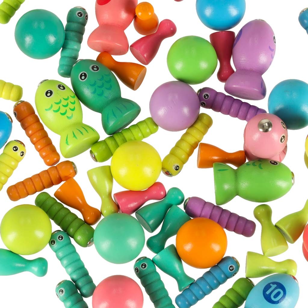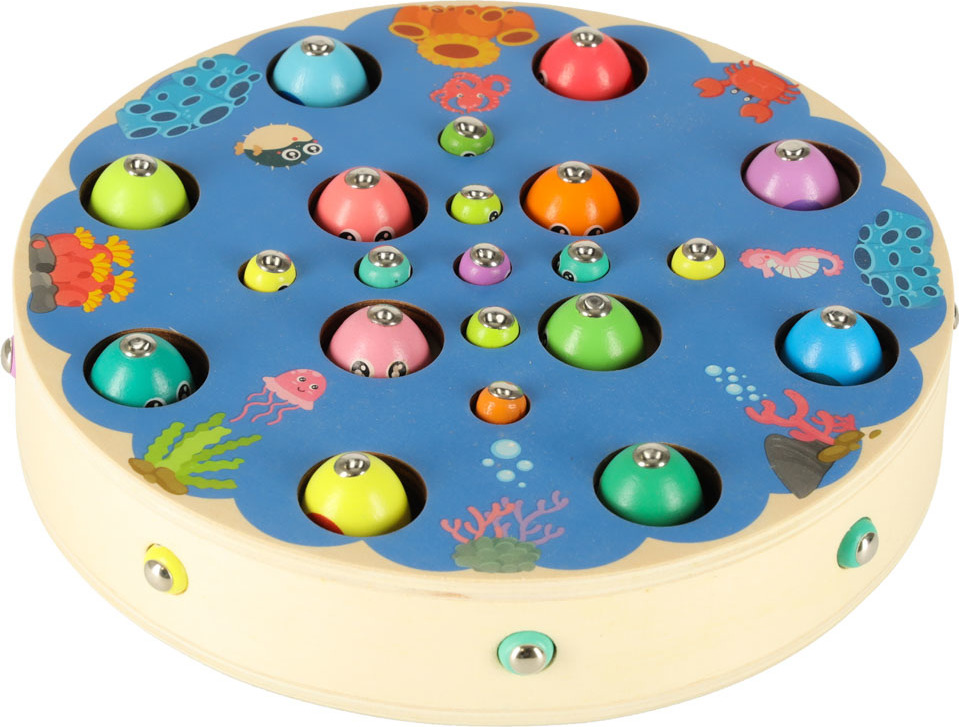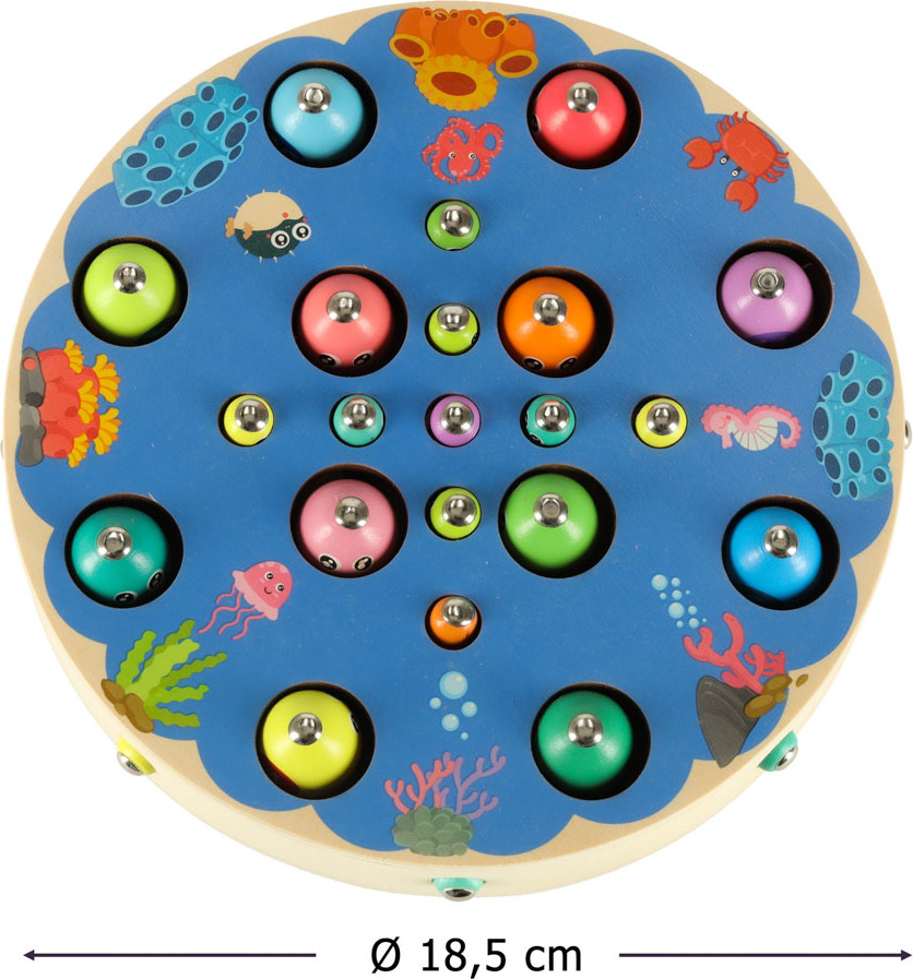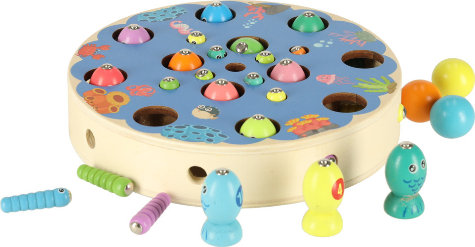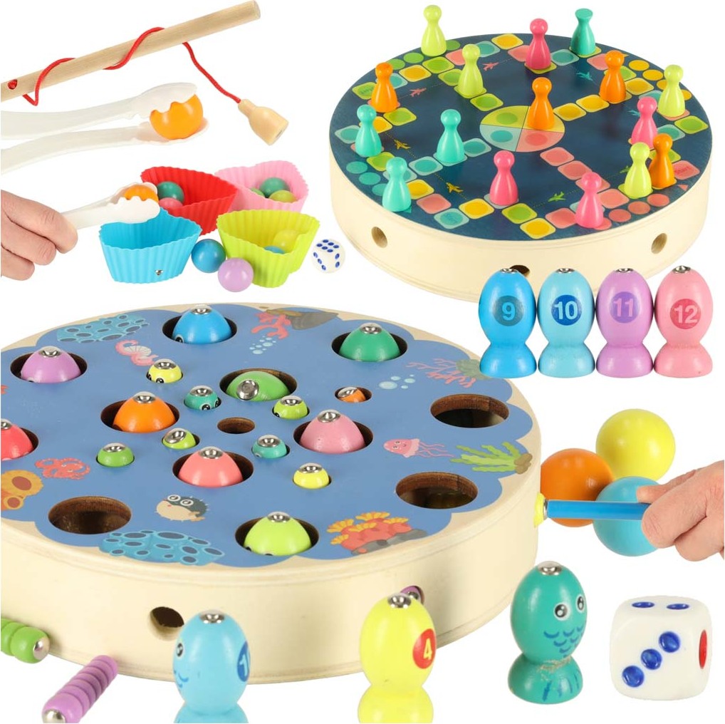 Táto všestranná hračka nielen podporuje rozvoj manuálnych zručností, ale taktiež stimuluje kognitívne funkcie a logické myslenie. Hra ponúka množstvo možností, ako spojiť zábavu s učením, ako je počítanie dielikov, rozlišovanie farieb, riešenie jednoduchých rovníc, chytanie rýb a presúvanie dielikov pinzetou. Použitie hladko brúseného dreva a bezpečnej farby na väčšine dielikov zaisťuje bezpečnosť pri hre.