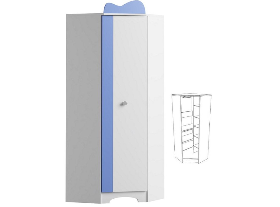 Rohová šatníková skriňa CLOUDS sa vyznačuje vysokou kvalitou spracovania, ktorú zaisťujú kvalitné lamino dosky o sile 18 mm. Hrany nábytku sú opatrené ABS/PVC materiálom, ktorý ho chráni pred mechanickým poškodením a vlhkosťou. Farbu skrine môžete vyberať z našej bohatej ponuky podľa vašich predstáv. Skriňa je rozdelená do dvoch policových častí. Ľavá časť navyše obsahuje výsuvný držiak na zavesenie ramienok. Dvierka sú osadené plastovým úchytom v tvare mráčika, charakteristickým pre celú kolekciu. Úchyt dodáva nábytku jedinečný charakter a štýl. Šatníková skriňa CLOUDS skvele doplní nábytok z tejto kolekcie a vy tak môžete vytvoriť kombináciu presne podľa potrieb vášho dieťaťa alebo mladého študenta.