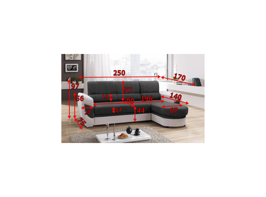 - rozmery: šírka: 250 cm, výška: 97 cm, hĺbka: 170 cm
