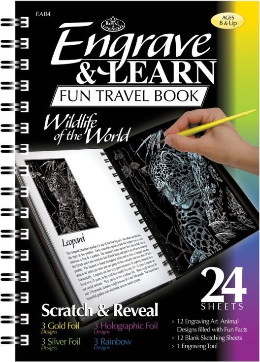 Blok s 12 škrabacími obrázkami s motívmi divokých zvierat ideálny na cesty. Ku každému obrázku je anglický popis na zlepšenie Vašej angličtiny. Škrabacie obrázky sú obľúbené naprieč generáciami. Priloženým škrabacím perom je treba vyškriabať linky predtlačeného obrázku. Papier je potiahnutý čiernou vrstvou a ukrýva zlatý, strieborný, dúhový alebo holografický podklad. V bloku je navyše 12 čistých listov, na ktoré si pomocou ceruziek, pasteliek či fixiek môžete kresliť, maľovať a písať, čo Vás napadne. Obsah balenia: * 12 škrabacích obrázkov (3 zlaté, 3 strieborné, 3 holografické a 3 dúhové) * 12 čistých listov * plastové škrabacie pero s kovovým hrotom (dĺžka cca 14,5 cm) Vhodné pre deti od 8 rokov. Škrabacie pero má ostrý hrot, u malých detí je preto vhodný dohľad dospelej osoby.Vlastnosti