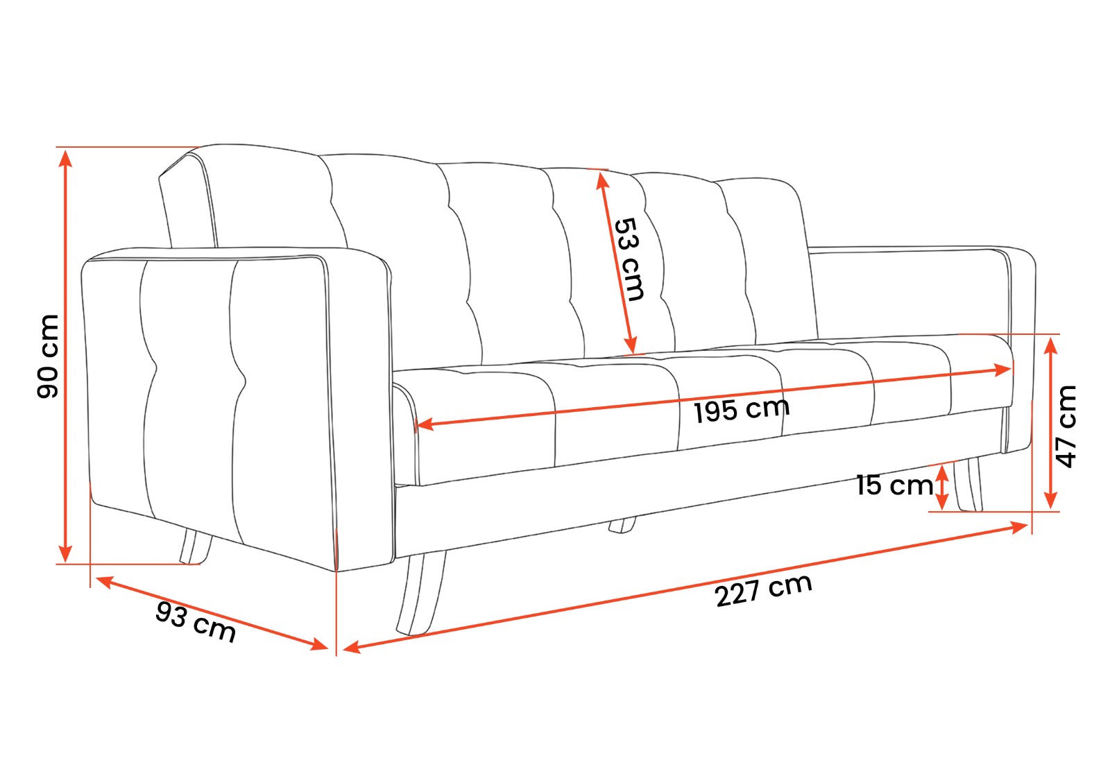 - rozmery: šírka: 227 cm, výška: 90 cm, hĺbka: 93 cm