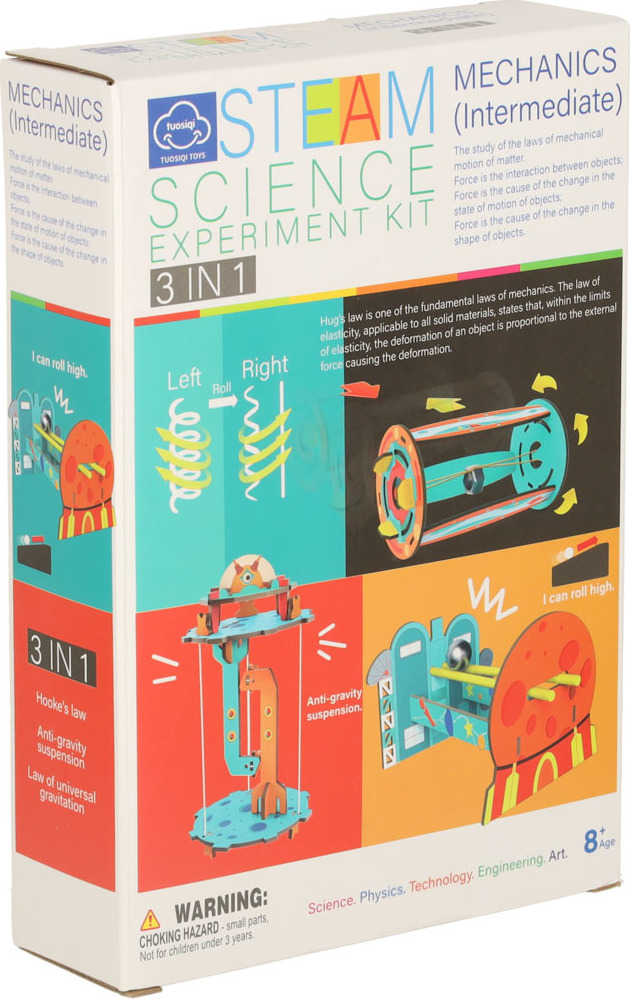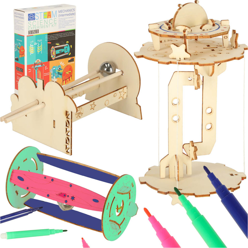 Táto vzdelávacia sada umožňuje deťom samostatne vykonať tri vedecké experimenty. Obsahuje všetko potrebné príslušenstvo pre každý experiment. Modely sa ľahko zostavujú, čo uľahčuje pochopenie fyzikálnych princípov. Súprava stimuluje detskú zvedavosť o svete okolo nich a podporuje rozvoj manuálnych zručností. Deväť farebných fixiek umožňuje podľa ľubovôle vyfarbovať experimenty.