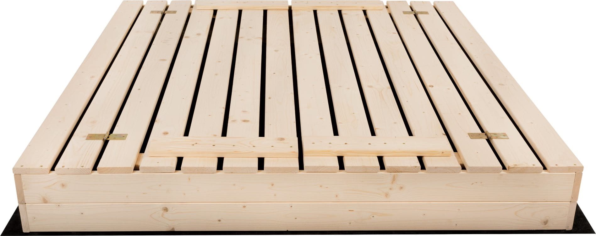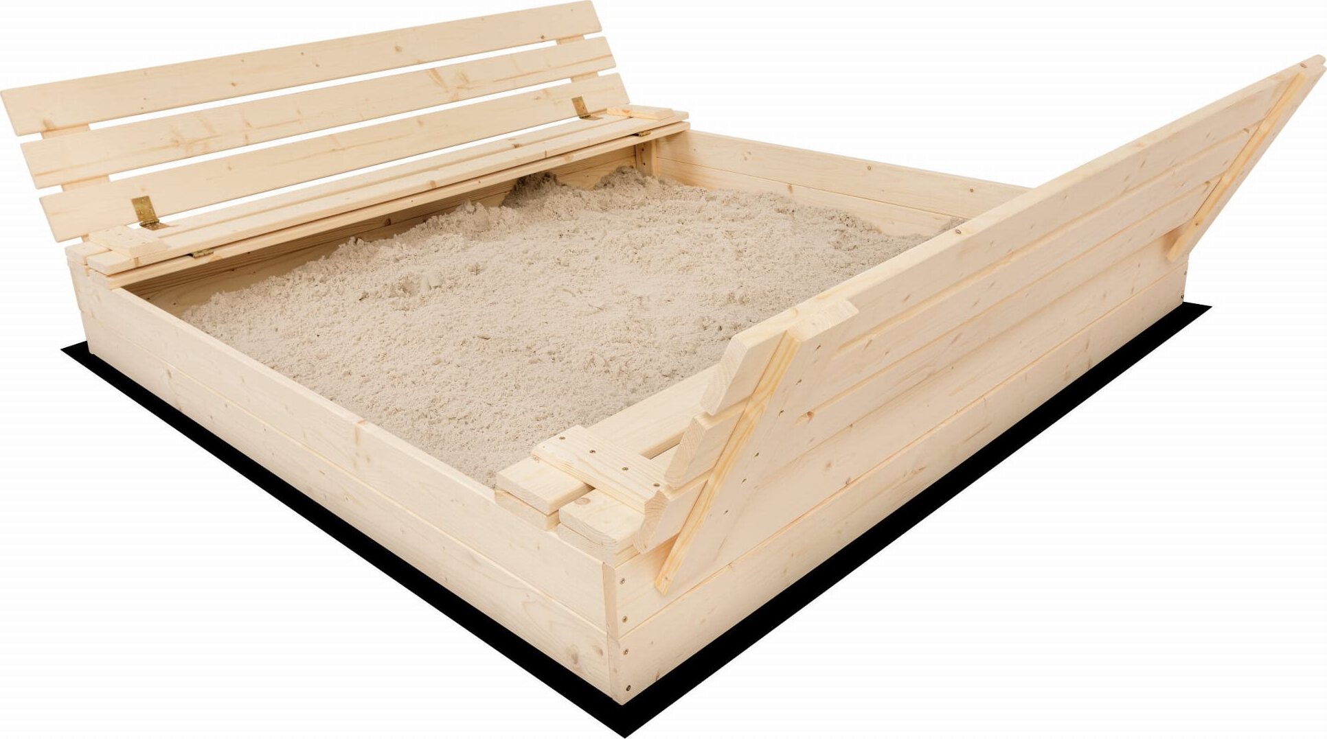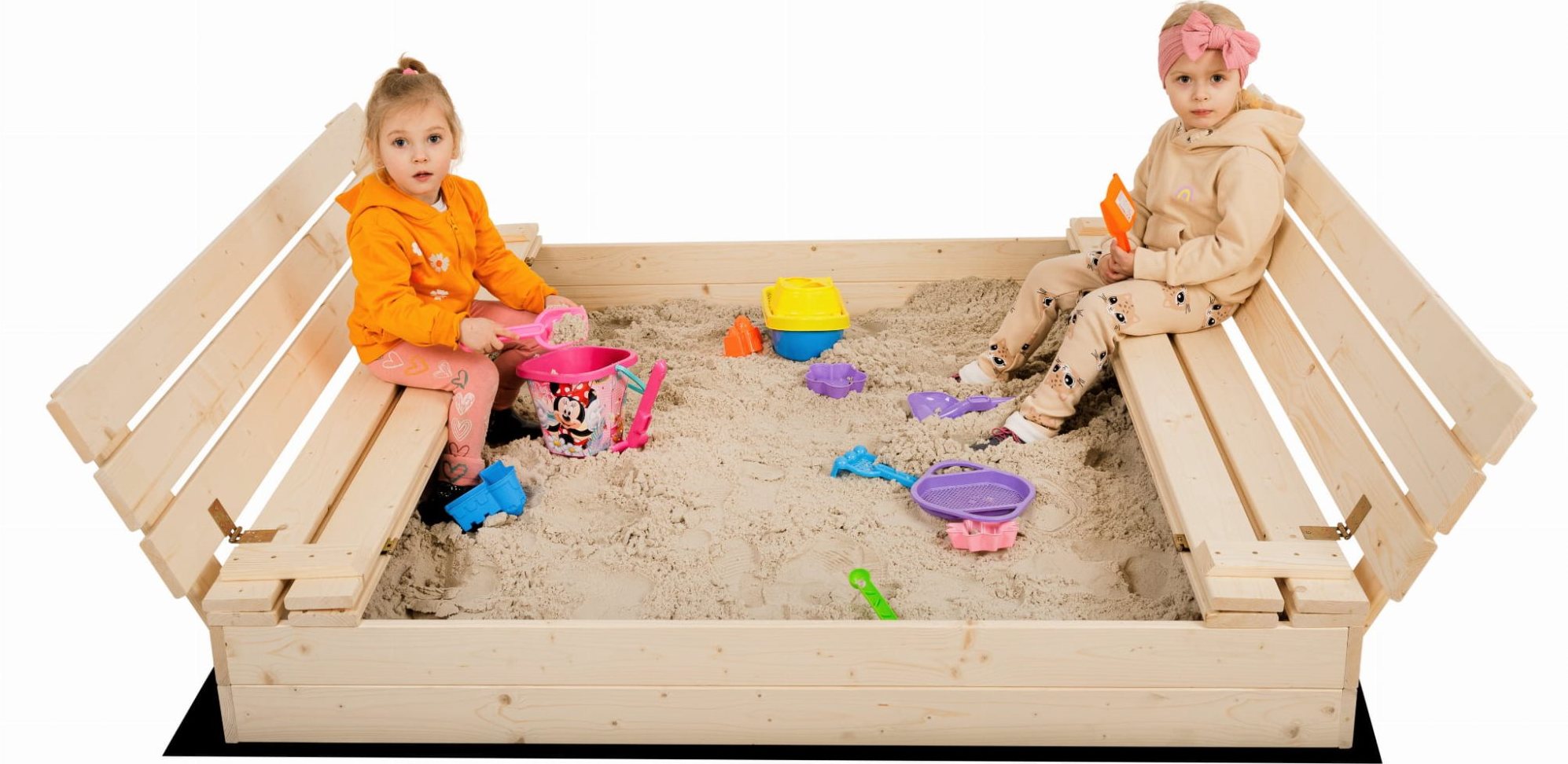 Detské pieskovisko z prírodného materiálu je ideálnym doplnkom každej záhrady. Deti sa zabavia na dlhé hodiny a prostredníctvom hry v piesku si zlepšia svoje manuálne a koordinačné schopnosti. Pieskovisko je vyrobené z ihličnatého dreva. Ide o výrobok prvotriednej kvality, nie o odpad z výroby iných drevených výrobkov. Použitý materiál prešiel procesom sušenia, hobľovania a brúsenia. Dosky majú hladké hrany a pieskovisko je tak vhodné pre deti už od 6 mesiacov. V rozloženom stave má dve lavičky na pohodlné usadenie detí alebo dohliadajúcich rodičov. Po ukončení hry sa lavičky zložia a pieskovisko nimi ľahko zakryjete. Pieskovisko má dno z odolnej netkanej textílie a plachtu na zakrytie a ochranu pred poveternostnými vplyvmi.