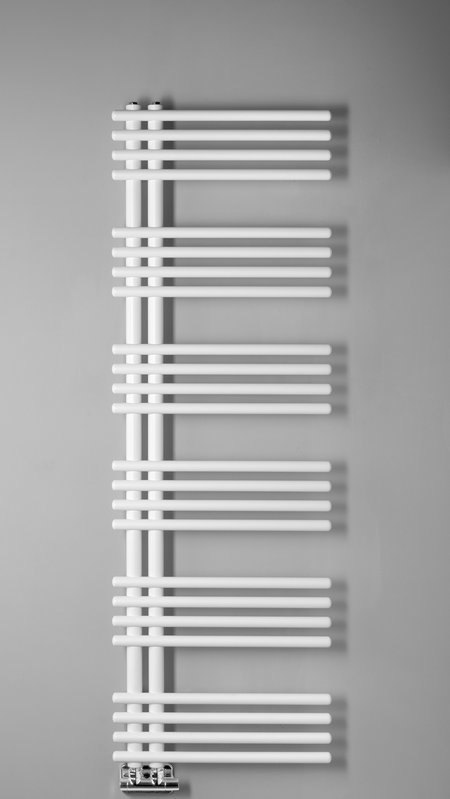Klasické rúrky s kruhovým profilom zostavené v dizajnovom radiátore, ktorý je možné vďaka stredovému pripojeniu s rozstupom 50 mm kombinovať s dizajnovými ventilmi z našej ponuky.