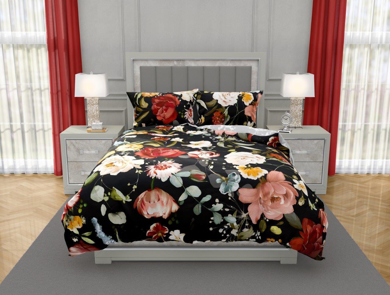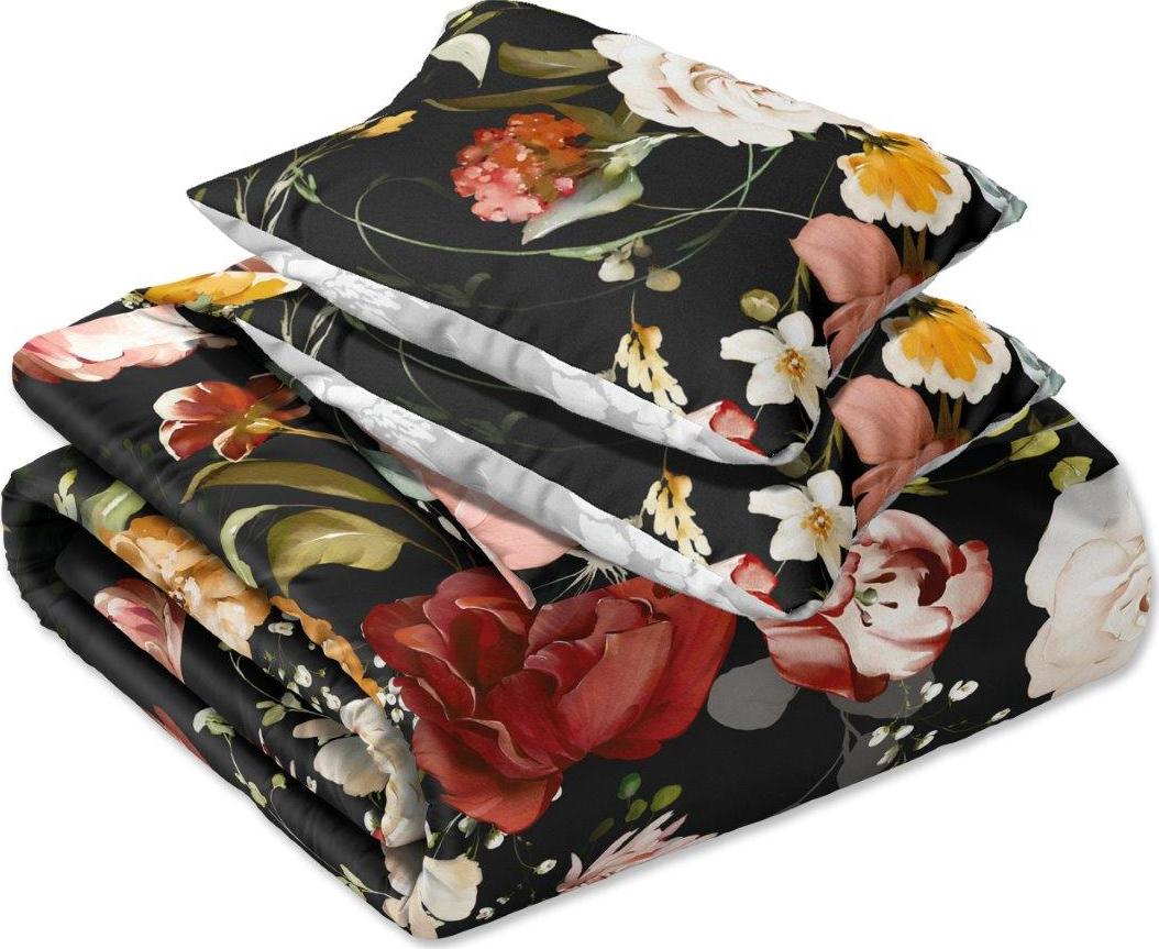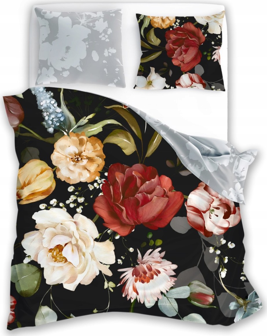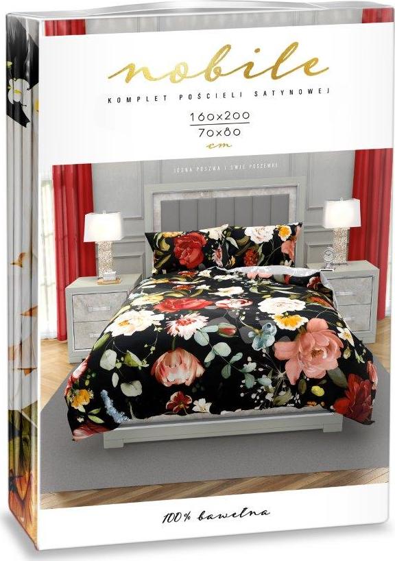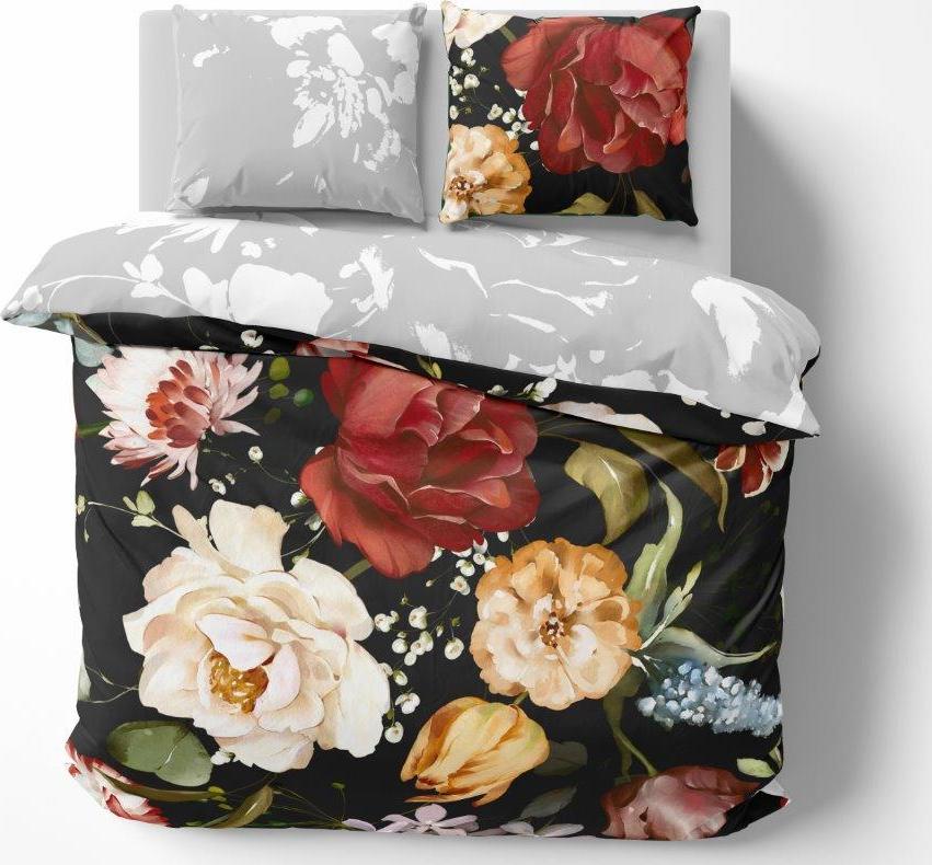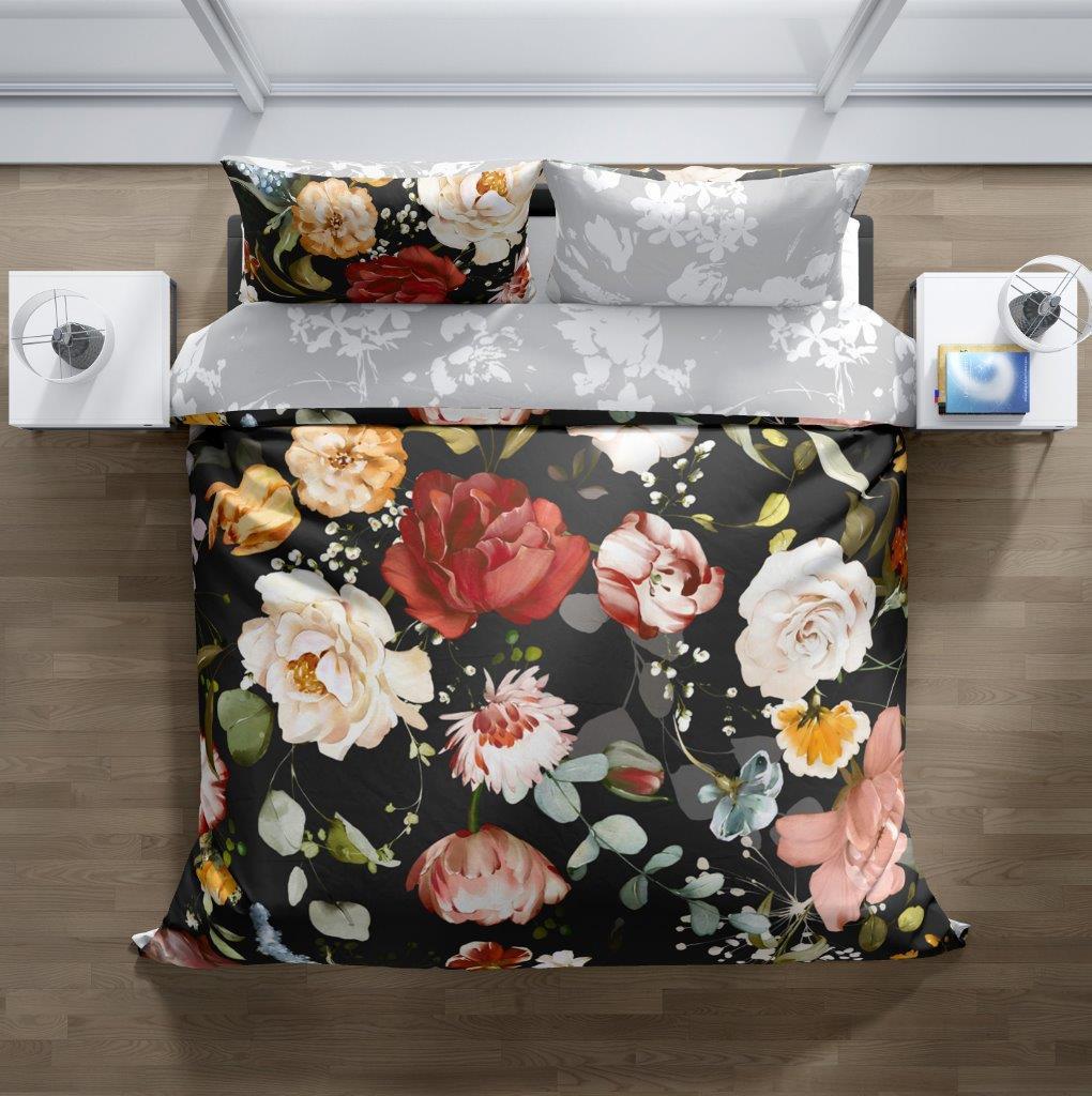 Saténové obliečky NOBILE Kvety - čierne / šedé - 160x200 cm
