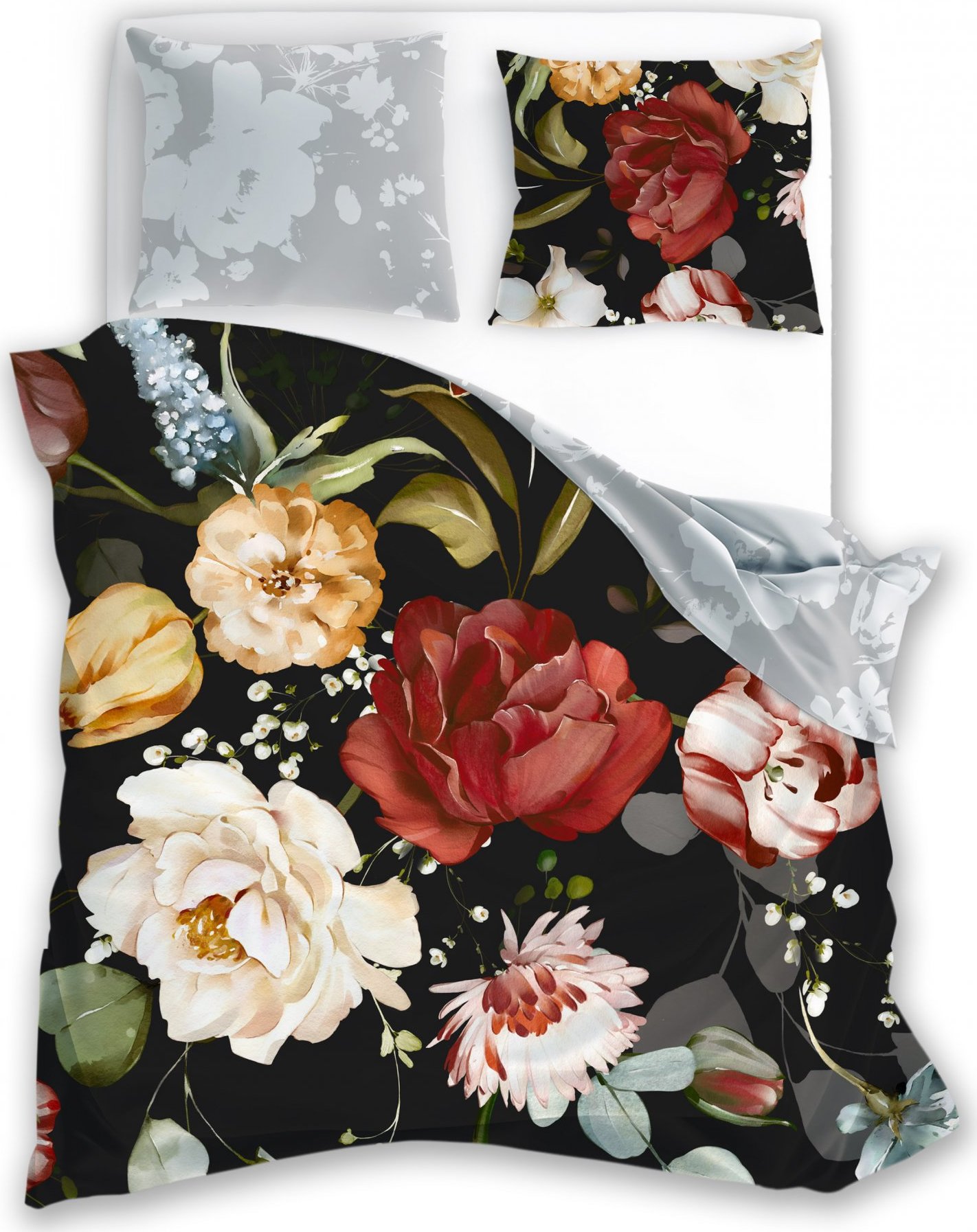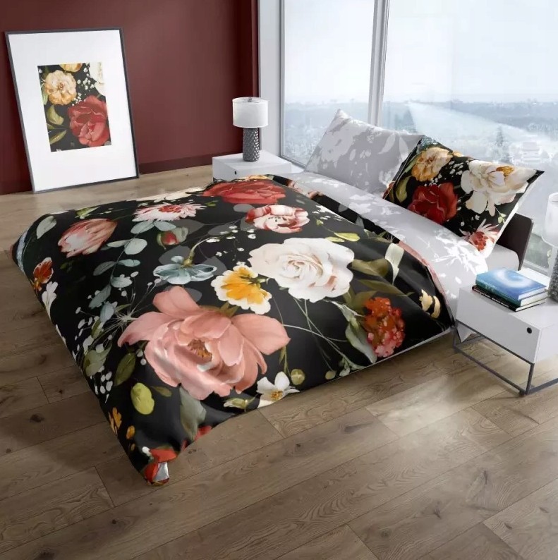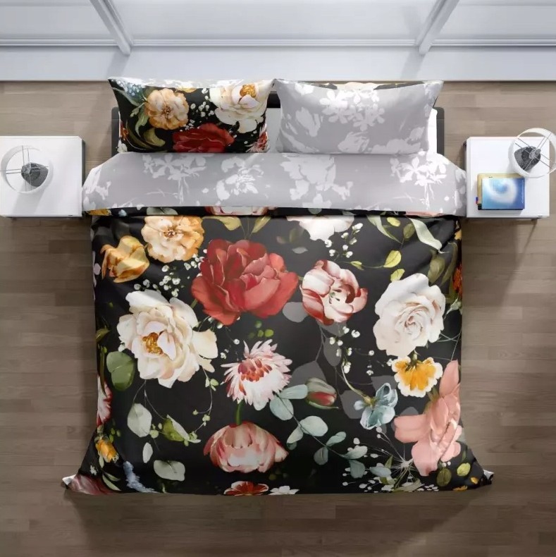 Saténové obliečky NOBILE Kvety - čierne / šedé - 220x200 cm