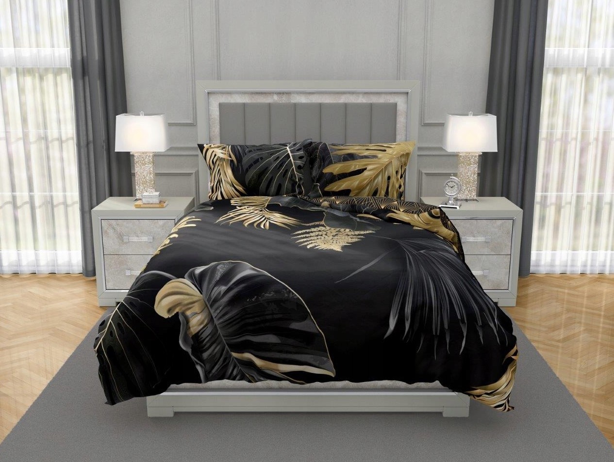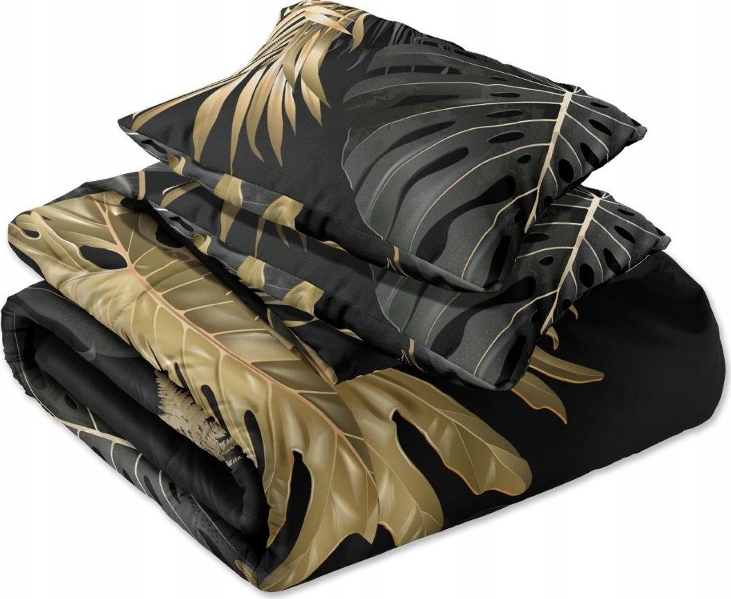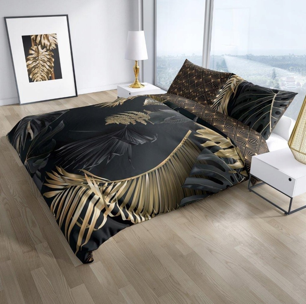 Saténové obliečky NOBILE Palm leaves - čierne / zlaté - 220x200 cm