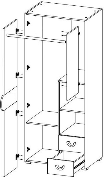 Dvojdverová šatníková skriňa z kolekcie CARINI sa skvele hodí do detských i obývacích izieb, spální alebo izieb pre mládež zariadených v modernom štýle. Produkty z kolekcie CARINI sa vyznačujú farebnou kombináciou žiarivo bielej farby so svetlo šedou farbou a dekorom duba v odtieni nash. Navyše sa celá kolekcia vyznačuje zaoblenými prvkami, ktoré jej dodávajú veľmi originálny vzhľad. Skriňa je vyrobená z kvalitných laminátových drevotrieskových dosiek, ktoré majú umývateľnú vrchnú vrstvu a sú odolné voči poškriabaniu. Okraje sú chránené PVC dyhou, čím sa zvyšuje odolnosť nábytku. Odporúčame nábytok skombinovať s ďalšími produktmi kolekcie CARINI a urobiť tak z izby príjemné, oku lahodiace prostredie. Veľká, priestranná šatníková skriňa má vo vnútri v hornej časti po celej šírke tyč na ramienka s oblečením. Navyše vľavo, cca 46 cm od dna, je priestranná polica. Na pravej strane sú dve otvorené police a 2 malé šuplíky.