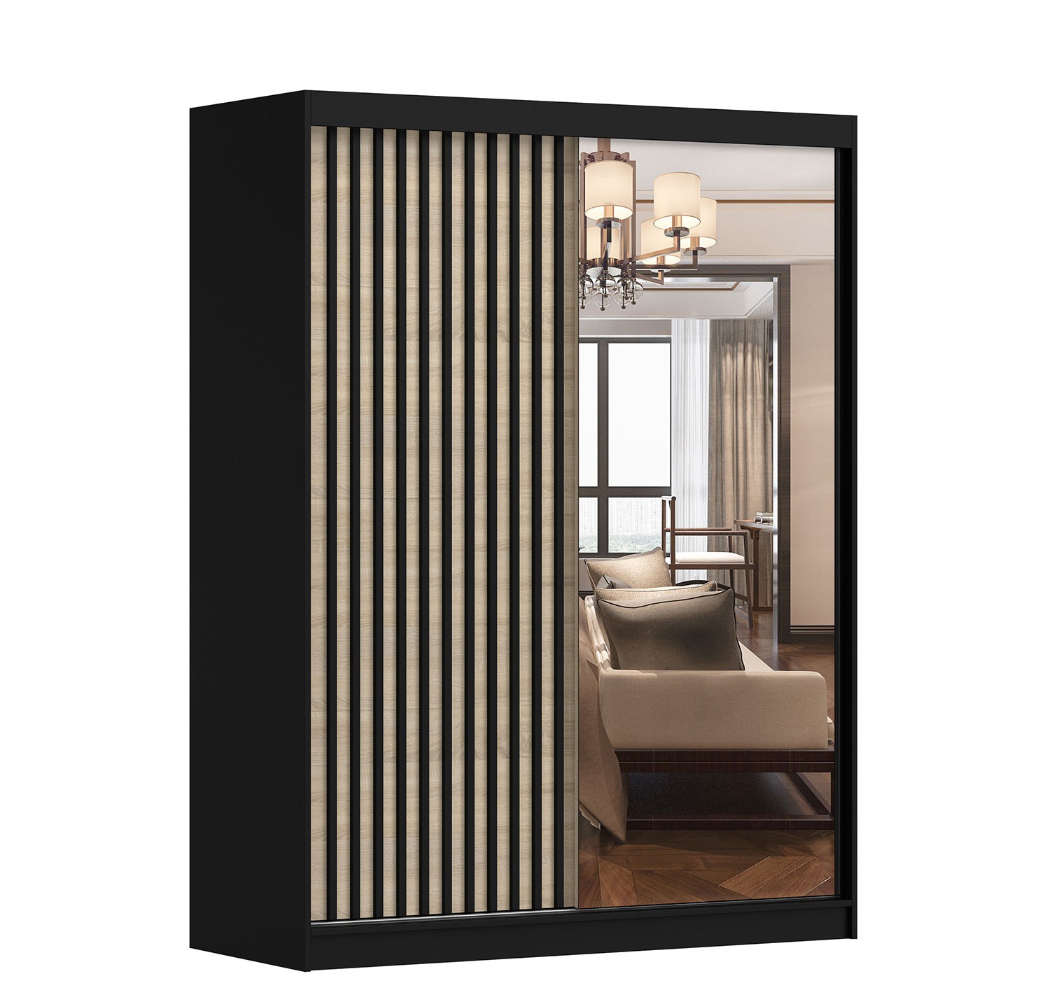 LAMBDA 150 je moderná skriňa s posuvnými dverami v zaujímavých farebných kombináciách, ktorá sa hodí do mnohých interiérov. Systém posuvných dverí šetrí miesto v miestnosti a zjednodušuje otváranie a zatváranie. Dvere s úchytkami z hliníka sa posúvajú na kolieskach s guličkovými ložiskami, ktoré zaisťujú hladký a tichý pohyb. Na prednej strane dverí sú ozdobné čierne lamely z MDF. Zrkadlo cez celú plochu druhých dverách rozjasní a opticky zväčší miestnosť. Skriňa je rozdelená na dve časti, ktoré sú vybavené nielen priestrannými policami a závesnou tyčou, ale aj dostatočným priestorom na uloženie veľkého množstva oblečenia, čo z nej robí praktickú voľbu pre každú domácnosť.