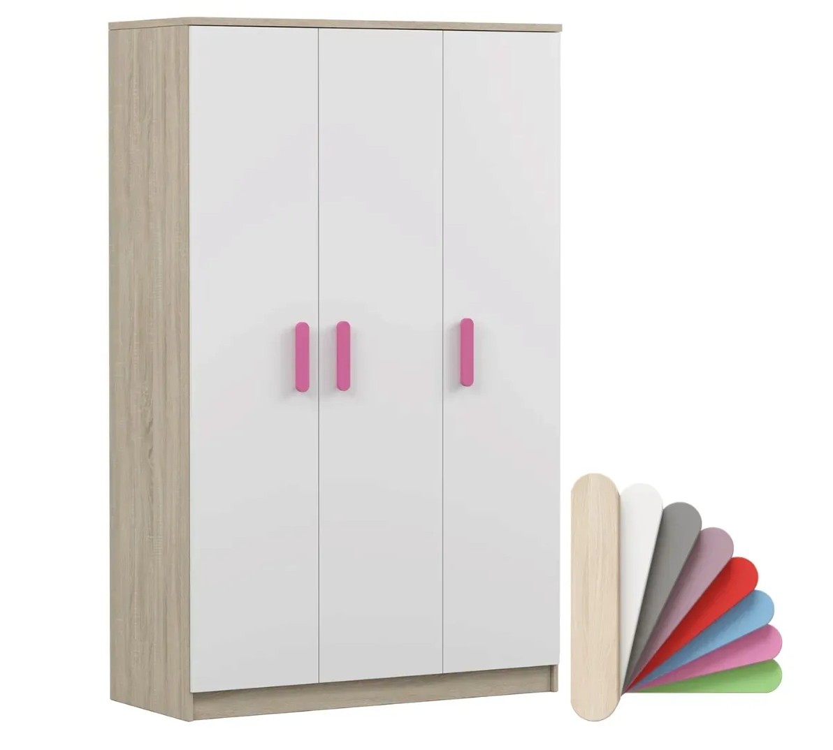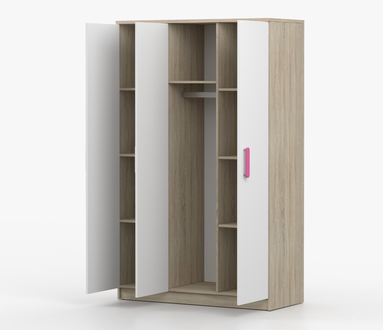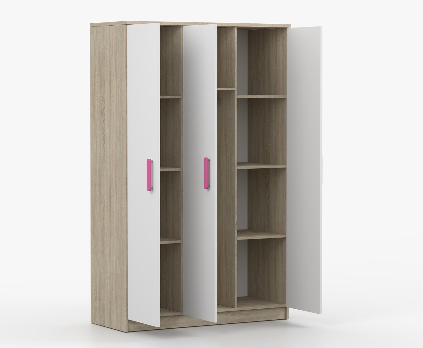 Trojdverová šatníková skriňa SCOUT sa vyznačuje praktickým úložným priestorom a veľkou kapacitou. S jednoduchým a moderným dizajnom sa skriňa SCOUT hodí do každého typu domácnosti – či už ide o detskú izbu alebo študentov byt. Skriňa je vyrobená z kvalitnej laminovanej dosky s hrúbkou 16 mm s odolnými ABS hranami, ktoré ju chránia pred mechanickým poškodením. Šatníková skriňa poskytuje veľký úložný priestor s dostatočným množstvom políc i miesto na zavesenie oblečenia. Dvere sú opatrené drevenými farebnými úchytkami a otvárajú sa tradičným spôsobom.