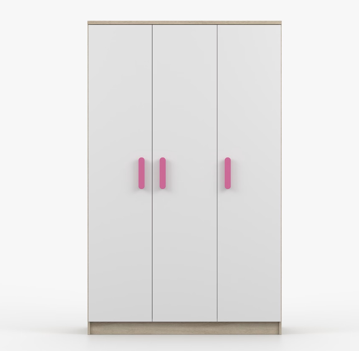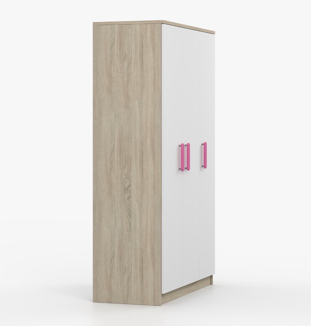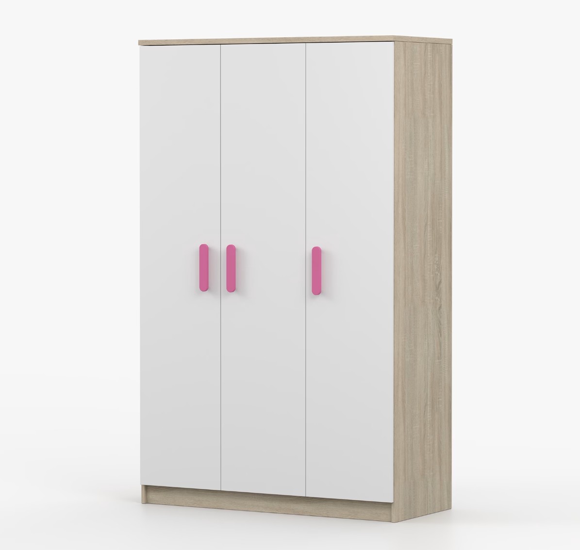 Trojdverová šatníková skriňa SCOUT sa vyznačuje praktickým úložným priestorom a veľkou kapacitou. S jednoduchým a moderným dizajnom sa skriňa SCOUT hodí do každého typu domácnosti – či už ide o detskú izbu alebo študentov byt. Skriňa je vyrobená z kvalitnej laminovanej dosky s hrúbkou 16 mm s odolnými ABS hranami, ktoré ju chránia pred mechanickým poškodením. Šatníková skriňa poskytuje veľký úložný priestor s dostatočným množstvom políc i miesto na zavesenie oblečenia. Dvere sú opatrené drevenými farebnými úchytkami a otvárajú sa tradičným spôsobom.