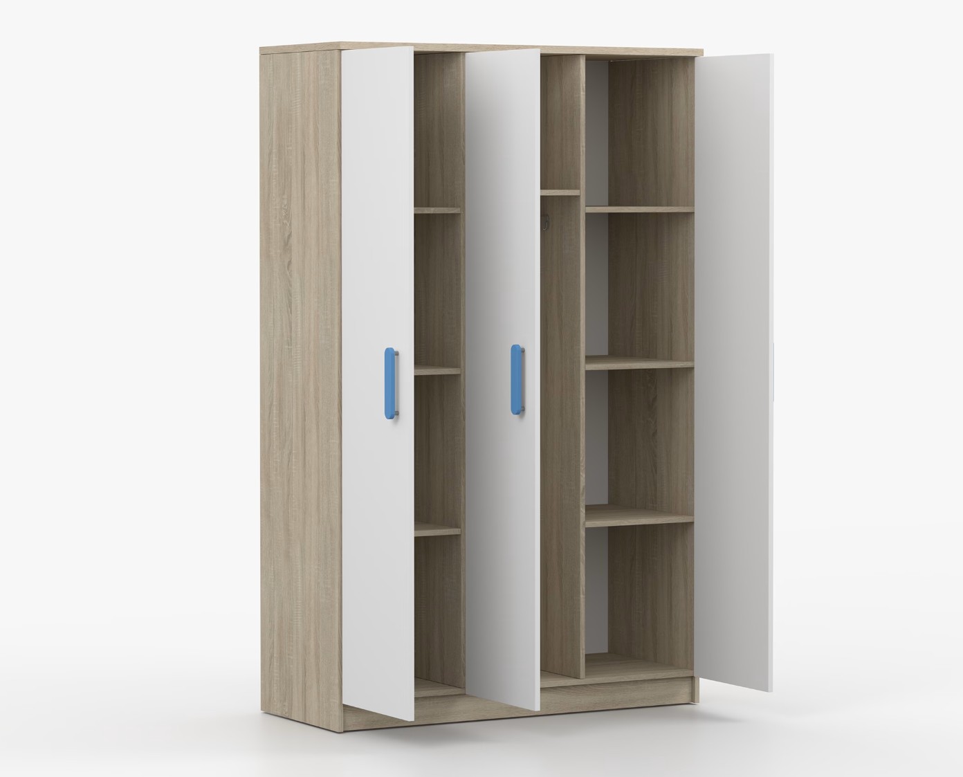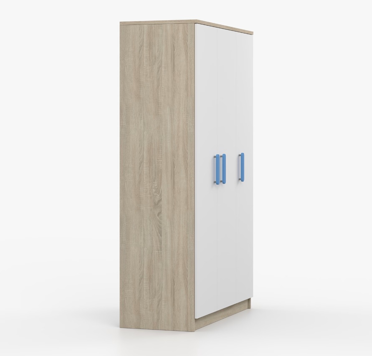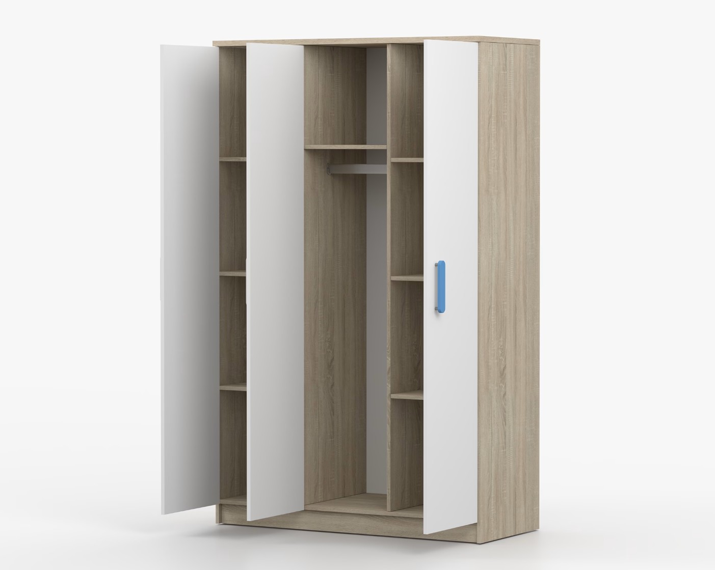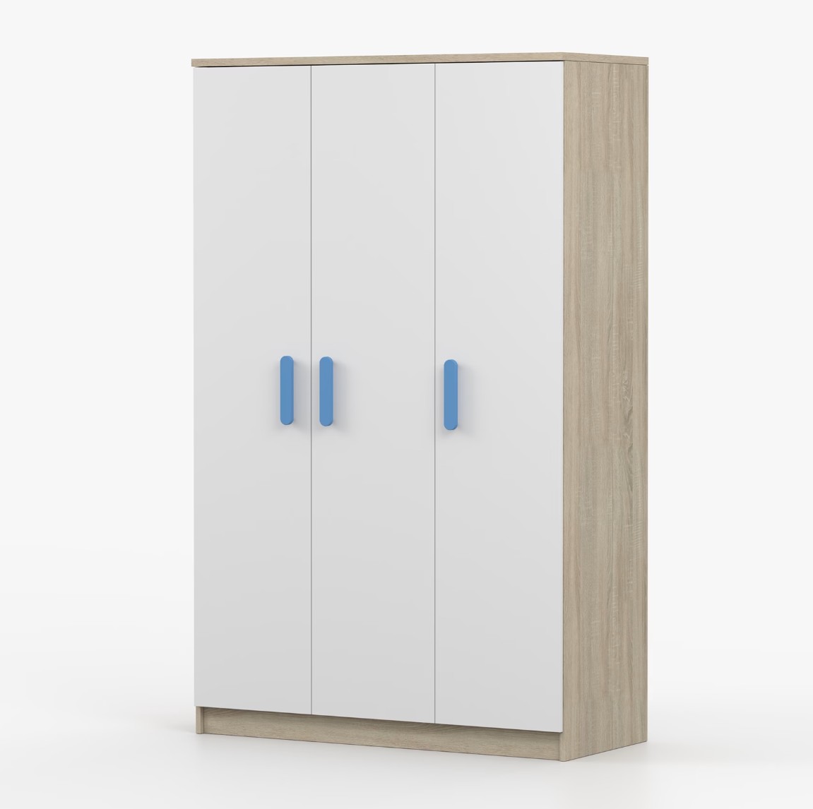 Trojdverová šatníková skriňa SCOUT sa vyznačuje praktickým úložným priestorom a veľkou kapacitou. S jednoduchým a moderným dizajnom sa skriňa SCOUT hodí do každého typu domácnosti – či už ide o detskú izbu alebo študentov byt. Skriňa je vyrobená z kvalitnej laminovanej dosky s hrúbkou 16 mm s odolnými ABS hranami, ktoré ju chránia pred mechanickým poškodením. Šatníková skriňa poskytuje veľký úložný priestor s dostatočným množstvom políc i miesto na zavesenie oblečenia. Dvere sú opatrené drevenými farebnými úchytkami a otvárajú sa tradičným spôsobom.