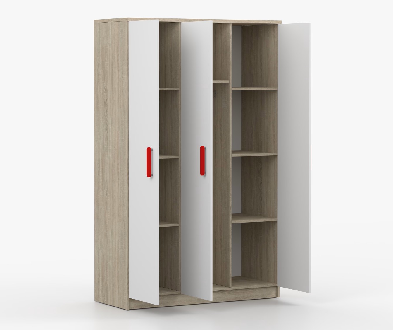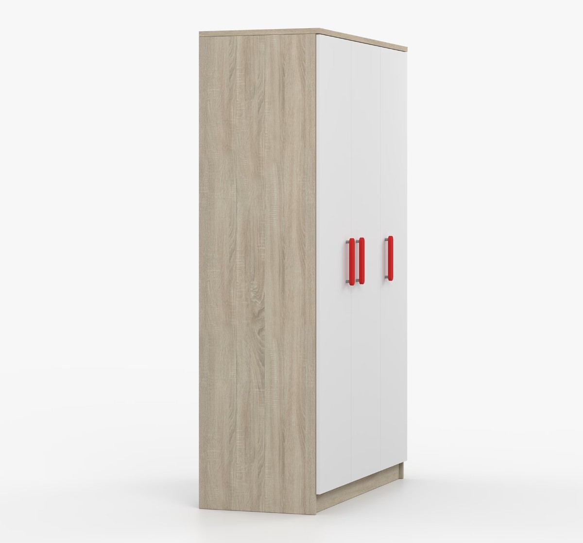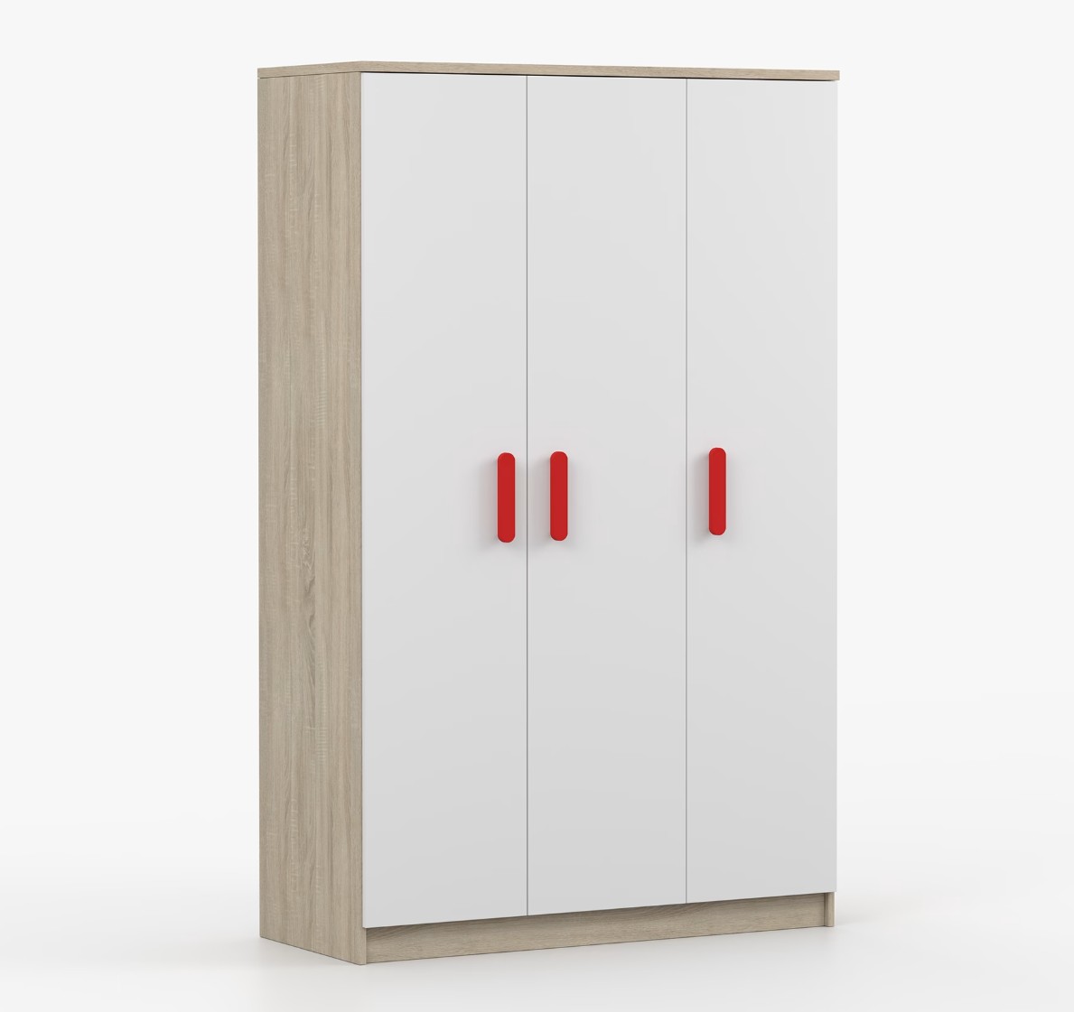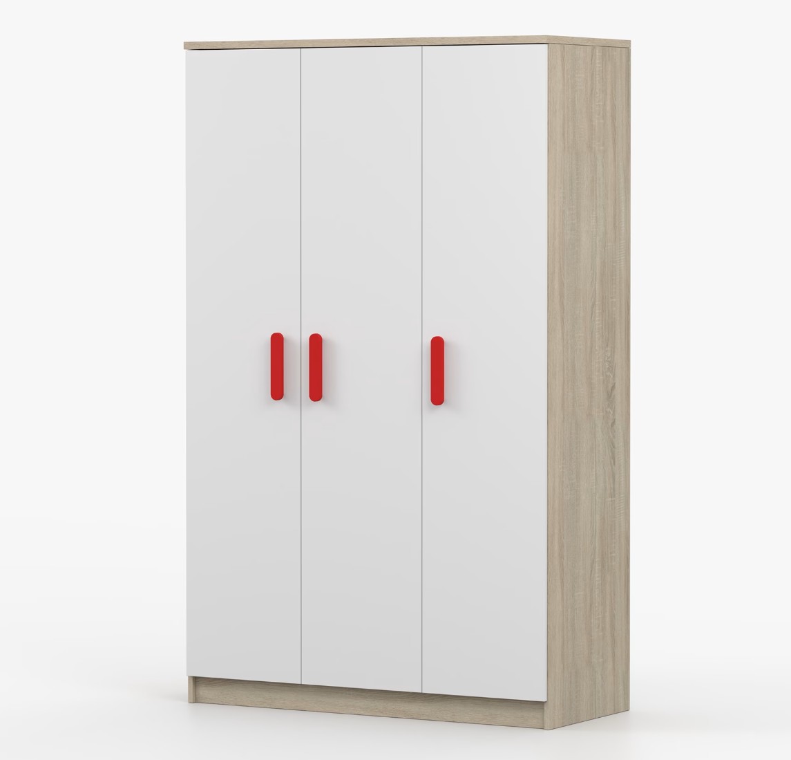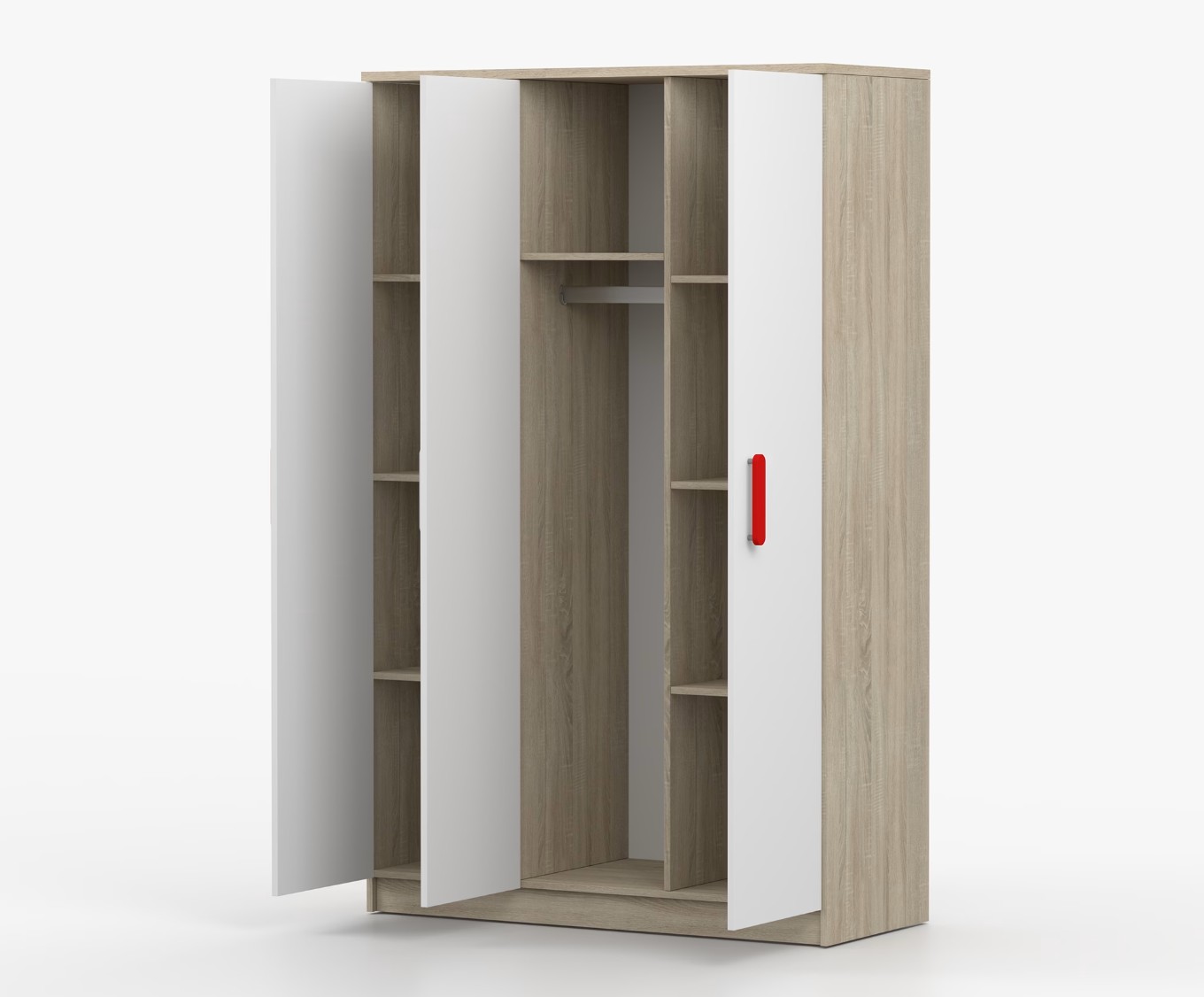 Trojdverová šatníková skriňa SCOUT sa vyznačuje praktickým úložným priestorom a veľkou kapacitou. S jednoduchým a moderným dizajnom sa skriňa SCOUT hodí do každého typu domácnosti – či už ide o detskú izbu alebo študentov byt. Skriňa je vyrobená z kvalitnej laminovanej dosky s hrúbkou 16 mm s odolnými ABS hranami, ktoré ju chránia pred mechanickým poškodením. Šatníková skriňa poskytuje veľký úložný priestor s dostatočným množstvom políc i miesto na zavesenie oblečenia. Dvere sú opatrené drevenými farebnými úchytkami a otvárajú sa tradičným spôsobom.