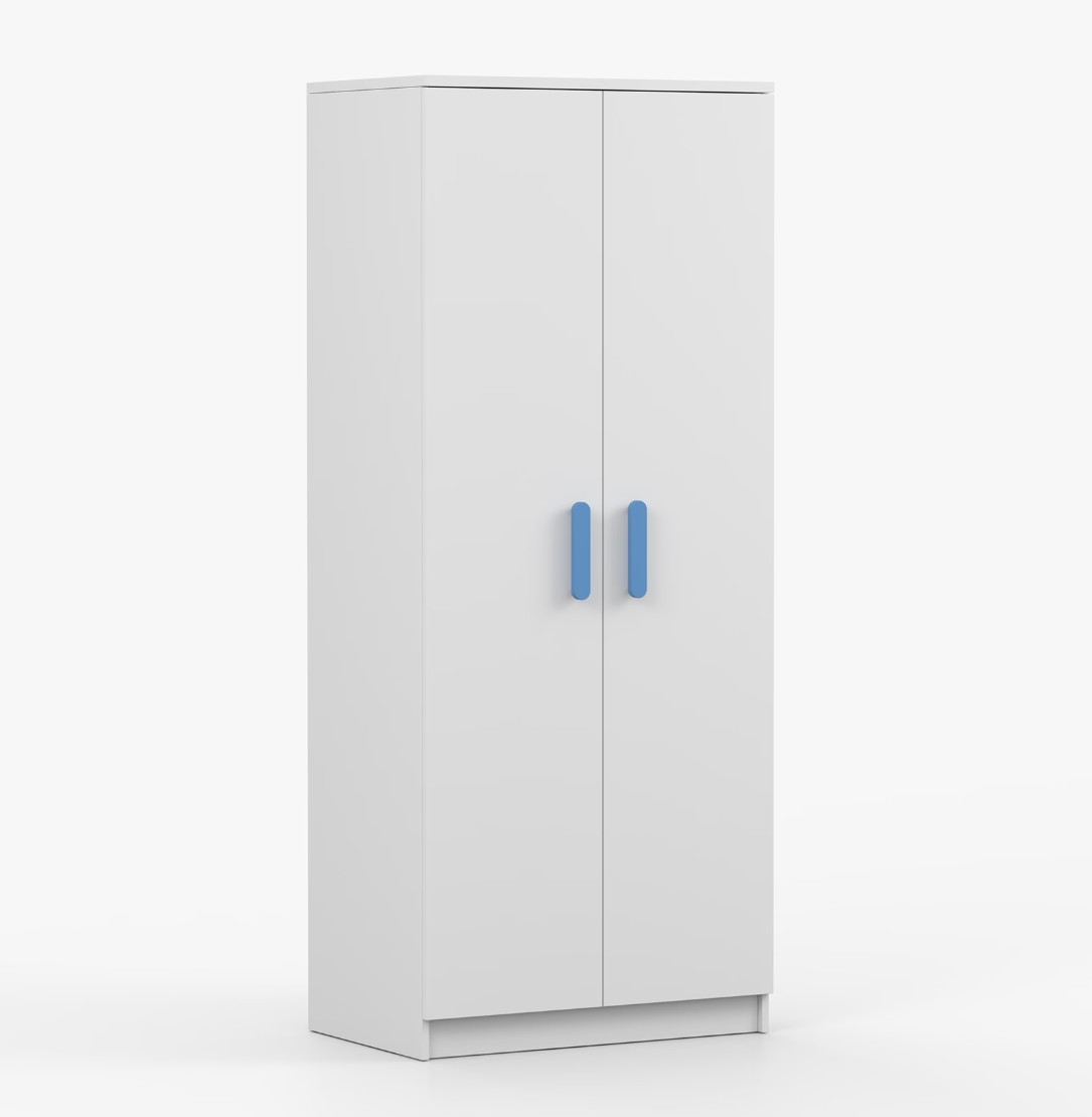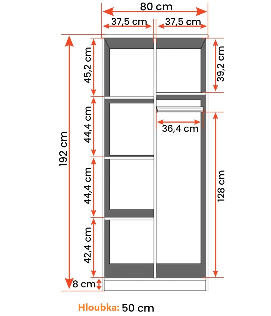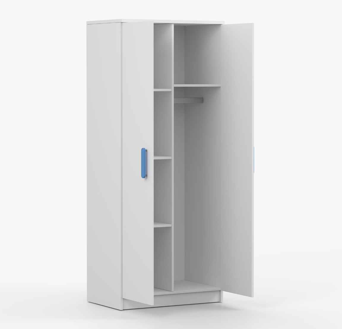 Dvojdverová šatníková skriňa SCOUT s jednoduchým a moderným dizajnom sa hodí do každého typu domácnosti - či už ide o detskú izbu alebo študentov byt. Skriňa je vyrobená z kvalitnej laminovanej dosky s hrúbkou 16 mm s odolnými ABS hranami, ktoré ju chránia pred mechanickým poškodením. Šatníková skriňa poskytuje veľký úložný priestor s dostatočným množstvom políc i miesto na zavesenie oblečenia. Dvere sú opatrené drevenými farebnými úchytkami a otvárajú sa tradičným spôsobom.
